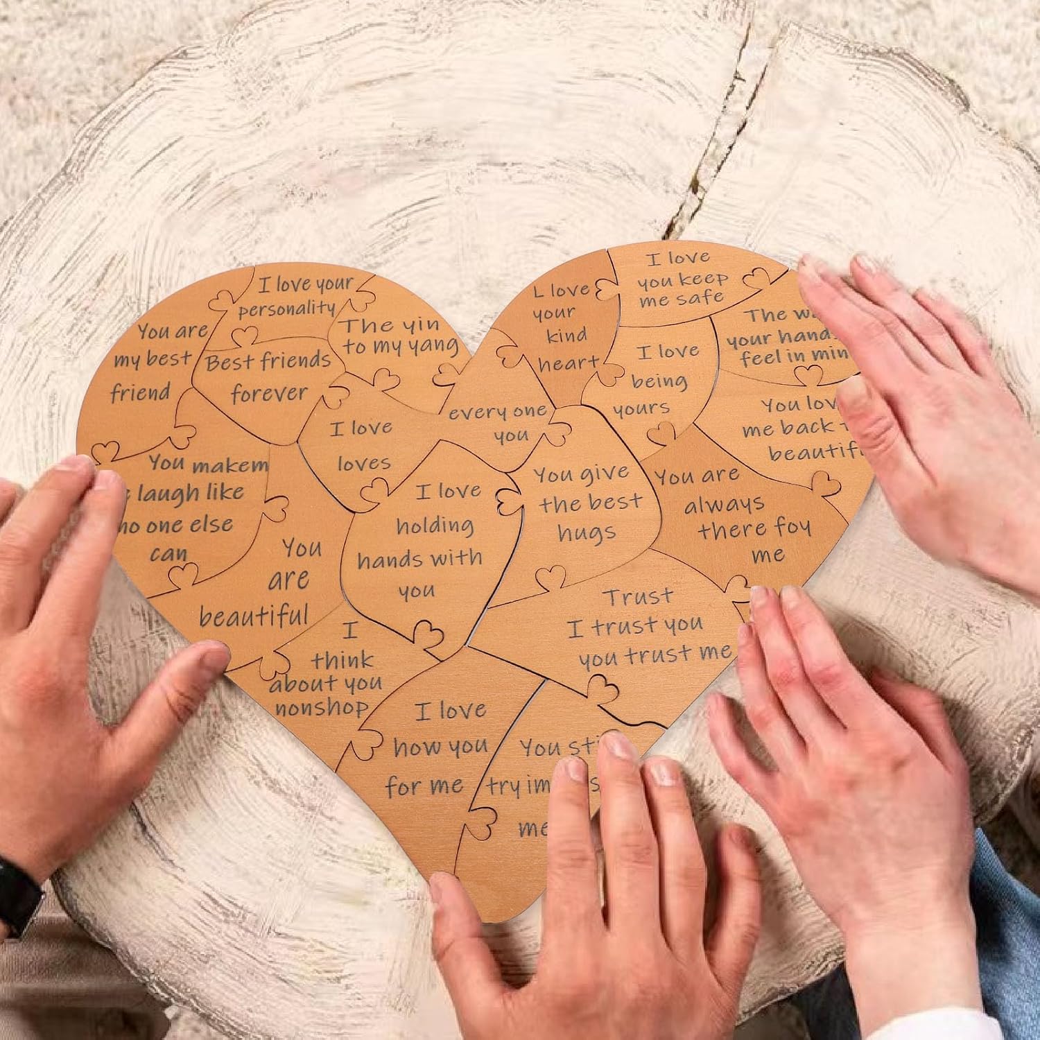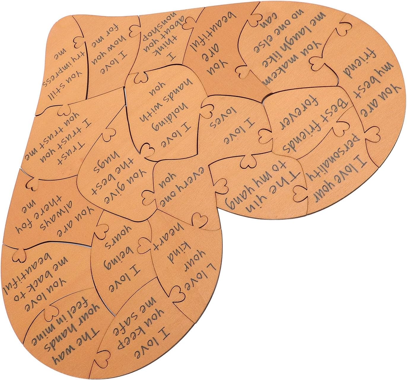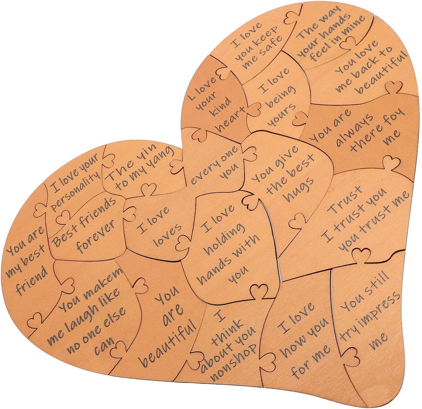 [Materiale di qualità premium] Realizzato in scheda ad alta densità Questo puzzle artigianale è costruito per durare. Il materiale robusto e durevole garantisce che possa resistere a anni di maneggevolezza mantenendo il suo aspetto elegante. Il suo design senza tempo lo rende un ricordo che creerà ricordi preziosi per gli anni a venire. [Design elegante e versatile] Finito in un ramo di colore marrone chiaro questo puzzle di forma del cuore vanta un'estetica moderna ma classica. Il suo design elegante si fonde perfettamente con qualsiasi arredamento per la casa che lo rende non solo un significativo ma anche un affascinante pezzo decorativo che migliora il tuo spazio abitativo. [ per ogni occasione] Questo puzzle a forma di cuore è un ideale per i compleanni degli anniversari o semplicemente per mostrare a qualcuno che ti interessa. La sua natura premurosa e sentimentale lascia un'impressione duratura aiutando a rafforzare i legami e celebrare l'amore in modo unico e memorabile. [Tocco personalizzato] Al centro del puzzle si trova un pezzo di spicco che può presentare il nome dei tuoi cari aggiungendo un tocco davvero speciale e intimo. Questa personalizzazione assicura che il tuo partner si senta apprezzato e amato ogni volta che lo vedono renderlo un gesto unico e sincero. [Ampia gamma di applicazioni] Questo puzzle di forma del cuore marrone è per varie occasioni tra cui le commemorazioni delle vacanze e i matrimoni per gli anniversari dei compleanni. La sua squisita artigianato e dettagli delicati lo rendono un pezzo straordinario che sia bello e significativo.