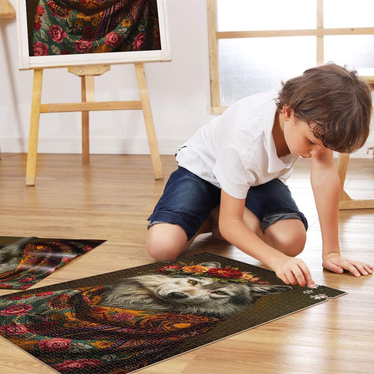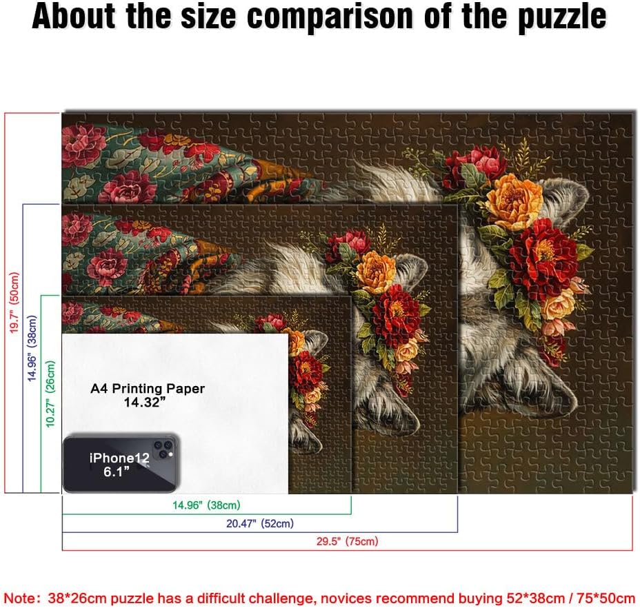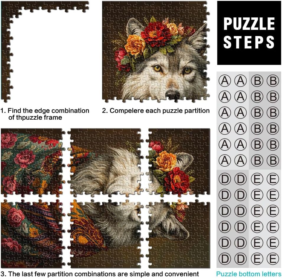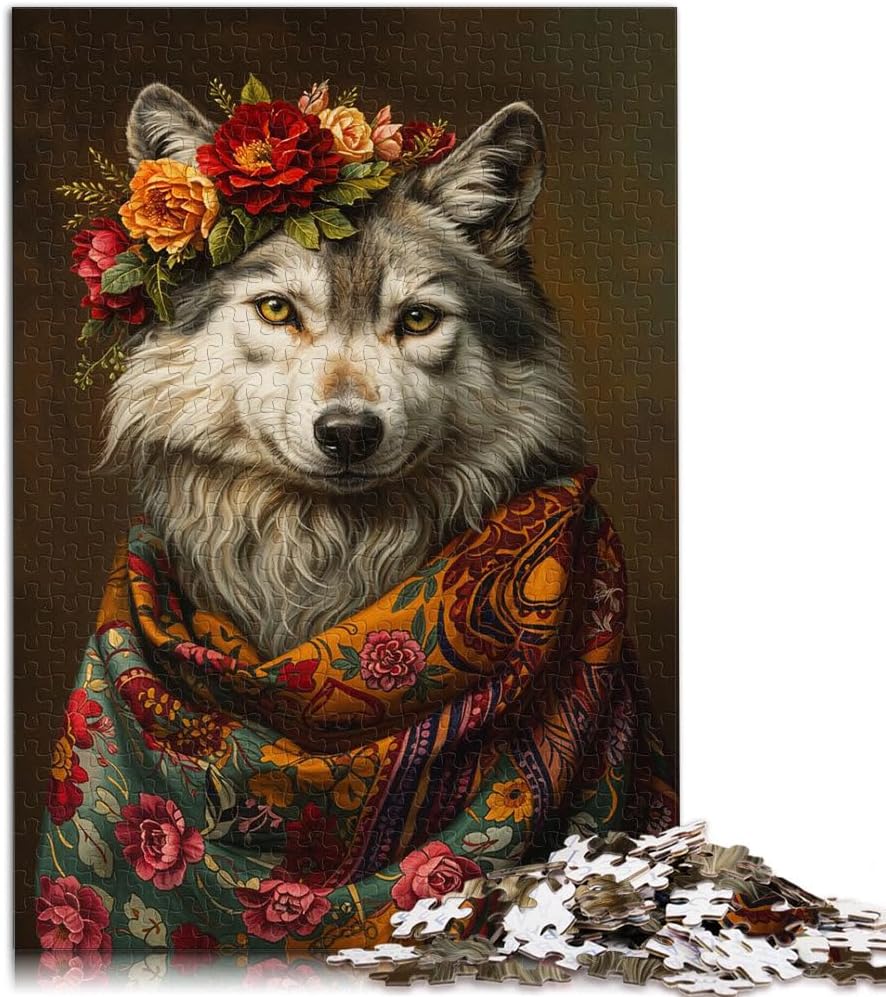 Puzzle da 1000 pezzi per adulti e adolescenti Lupo con fiori Fatto di legno Adatto a partire dai 14 anni Taglio di precisione Regalo per i compleanni misurare:50x75cm