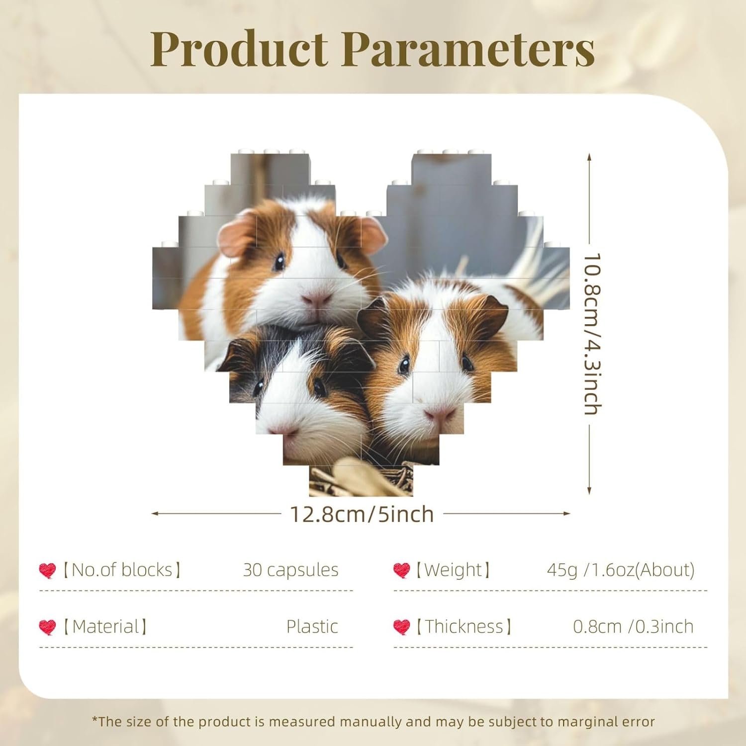 ALTA QUALITÀ: i mattoncini per porcellini d'India per adulti utilizzano la tecnologia di stampa digitale UV per garantire colori vividi e duraturi per foto personalizzate. Il mattoncino è realizzato con materiali sicuri, è incolore, inodore e non influisce sulla salute. Il pacchetto include: riceverai 30 pezzi di puzzle di San Valentino a forma di cuore, il numero di pezzi è soggetto alle dimensioni effettive. Il set di puzzle a forma di cuore è rimovibile e funge da bel regalo per le coppie, consentendo ai partner di divertirsi insieme. Design ergonomico: puzzle cubico in mattoni, bella forma, ben assemblato, bordi lisci e robusto e resistente alle cadute. I kit di elementi costitutivi sono stretti e stabili, non facili da allentare e possono mantenere la forma anche dopo il puzzle. STACCABILE E RIMONTABILE: kit di modelli di mattoncini squisita fattura e rigorosa selezione di accessori per offrirti più divertimento e tranquillità. I mini-blocchi autoportanti o mini possono essere smontati e rimontati per una divertente interazione con la stampa personalizzata. GRANDI REGALI: i puzzle dei porcellini d'India di San Valentino sono progettati a forma di cuore e combinati con varie immagini carine. Ogni piccola pietra passa attraverso le tue mani e alla fine può essere assemblata in un bellissimo ricordo. I set di mattoncini sono una sottile espressione di affetto.