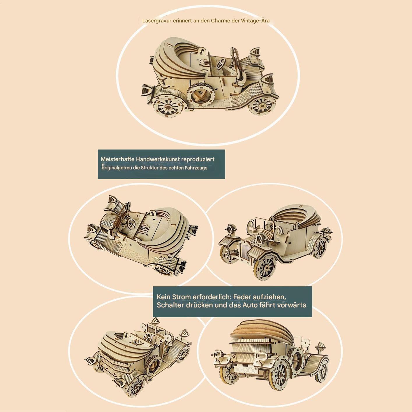 Struttura naturale del legno: focalizzata sulla conservazione delle venature naturali, garantisce soddisfazione tattile grazie alla struttura raffinata e alla finitura sicura per i bambini per una migliore usabilità Design artigianale con ruote rotanti: in legno offre un'esperienza coinvolgente per collezionisti e amanti dell'arte vintage, grazie al tetto rimovibile e alle ruote completamente funzionanti Esperienza di montaggio consapevole:: progettato per alleviare lo stress, il puzzle in legno da 220 pezzi auto offre una costruzione a strati che nutre la pazienza e premia con un senso di realizzazione attraverso una progressione pianificata Precisione vintage precisa: scopri la lavorazione artigianale ricca di dettagli di questa auto puzzle in legno 3D con una replica realistica e una stimolazione della concentrazione coinvolgente per un'esperienza d'arte rilassante consapevole ad ogni assemblaggio. Decorazione cognitiva: combina sofisticati puzzle 3D con design artistico per valorizzare visivamente qualsiasi spazio ufficio attraverso l'artigianato creativo, promuovendo la concentrazione mentale