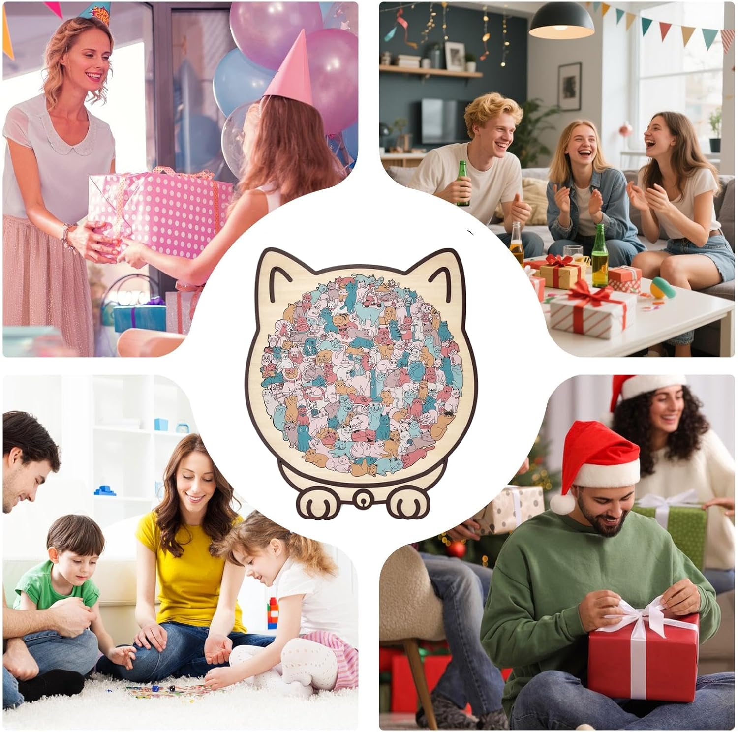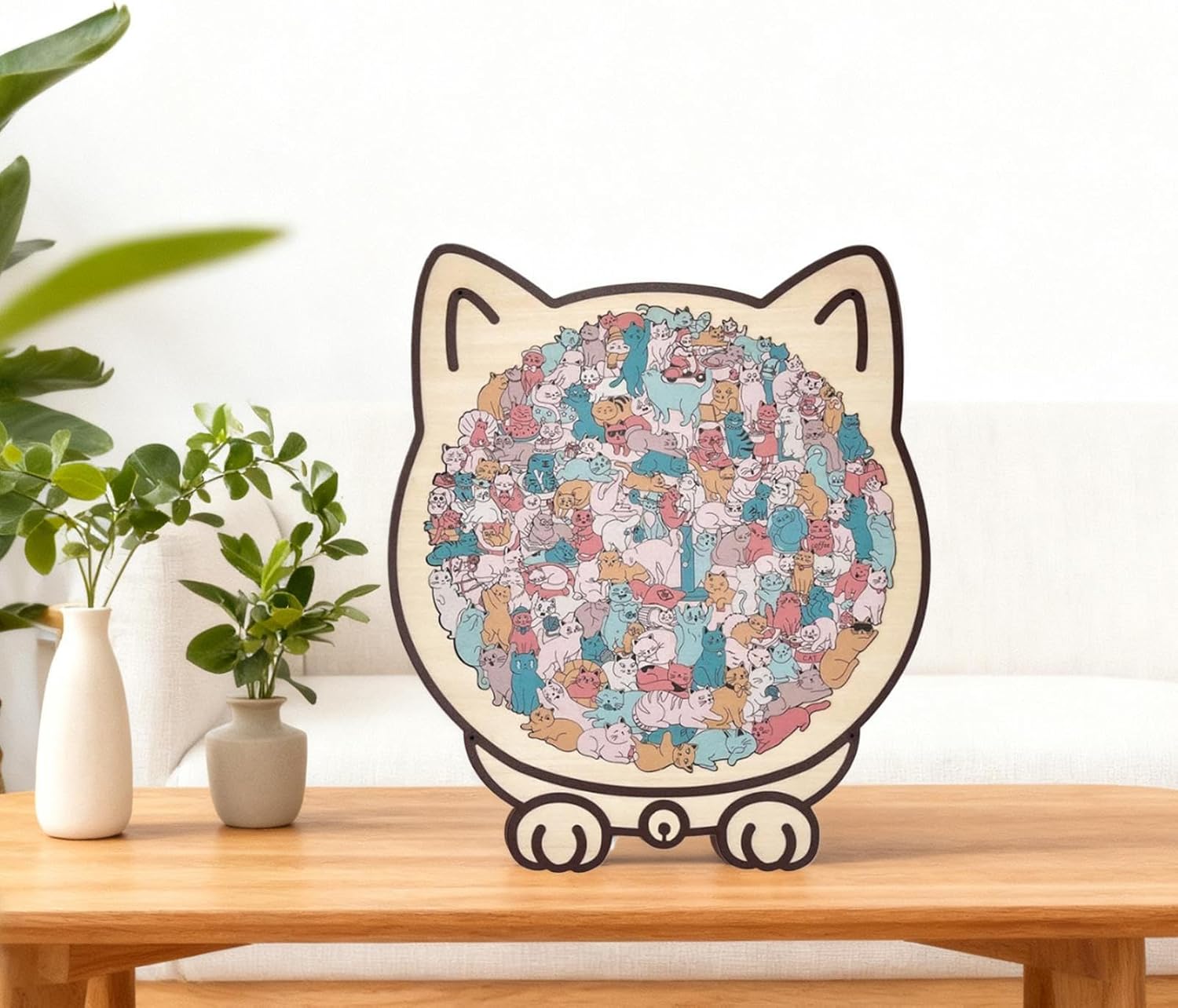 Promuovere la tranquillità: il puzzle in legno di gatto promuove la consapevolezza pacifica attraverso il feedback tattile del legno, che aiuta a ridurre gradualmente lo stress e a creare uno stato di calma concentrato. Fornisce sollievo durante le fasi di apprendimento o i progetti di lavoro quando la tensione è alta, supportando così il rilassamento mentale e la concentrazione per una maggiore serenità in situazioni stressanti. Utilizzo flessibile: trasforma l'ambiente circostante con il puzzle in legno a forma di gatto che offre più divertimento e allo stesso tempo funge da elegante decorazione per il soggiorno o la camera da letto, si adatta perfettamente alla stanza degli studenti, alle strutture del comodino e alle aree di lavoro e completa la tua stanza con un accattivante display per libreria come punto focale. Materiale robusto e durevole: il puzzle in legno a forma di gatto è realizzato in legno naturale e lavorato in modo robusto, il che lo rende resistente alle deformazioni. Le superfici finemente levigate e senza schegge garantiscono una presa sicura e confortevole. Offre prestazioni affidabili ed è perfetto per momenti indimenticabili durante attività ricreative come giochi di puzzle con la famiglia o un lavoro individuale rilassato. Un ottimo regalo: questo puzzle in legno a forma di gatto attira l'attenzione con i suoi dettagli in filigrana e funge da simbolo toccante per gli amanti degli animali. Condiviso tra amici o familiari durante feste intime o eventi festivi, crea ricordi allegri e momenti indimenticabili. La qualità artigianale sottolinea il valore emotivo di questo regalo speciale per le occasioni speciali. Artigianato creativo del gatto: con i contorni delle orecchie di gatto 3D e il design artistico, questo puzzle in legno offre una sfida visivamente accattivante. È ideale per gli appassionati di puzzle che apprezzano temi sorprendenti e godono di momenti di tranquillità nelle proprie quattro pareti. L'arte artigianale e il motif unico garantiscono un piacere speciale durante il puzzle.