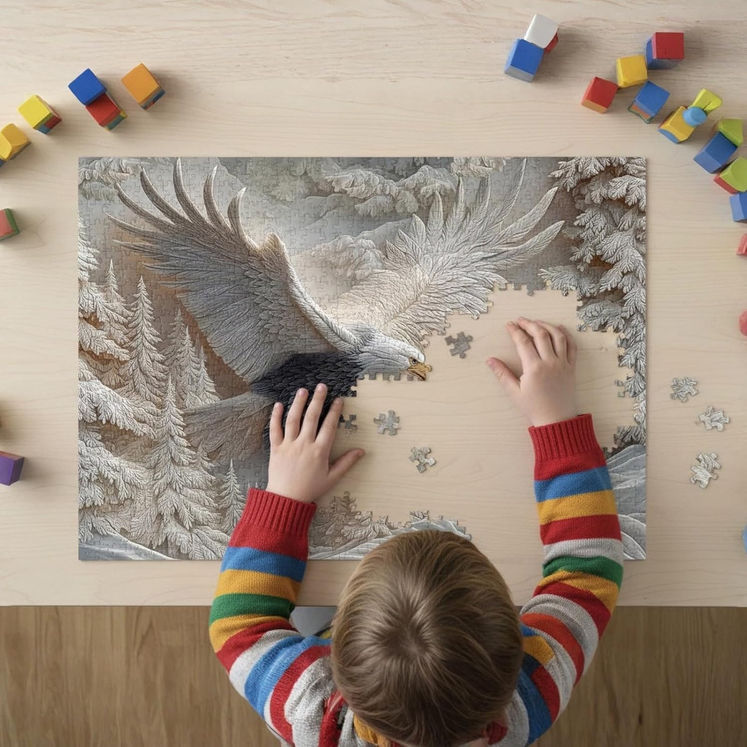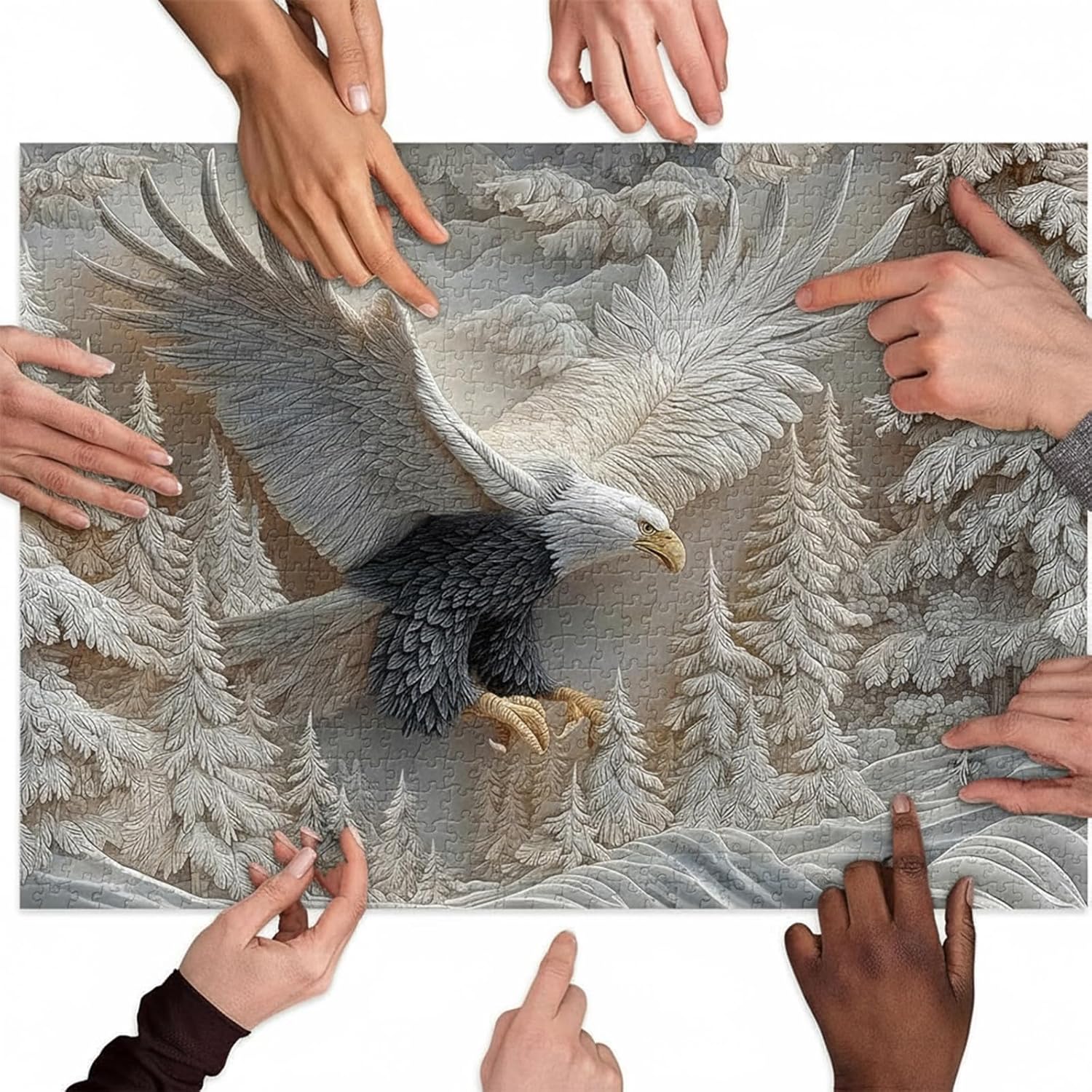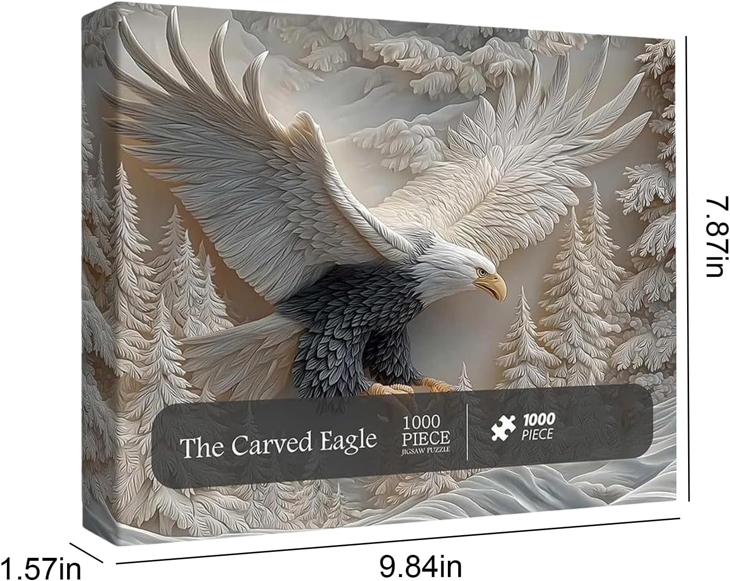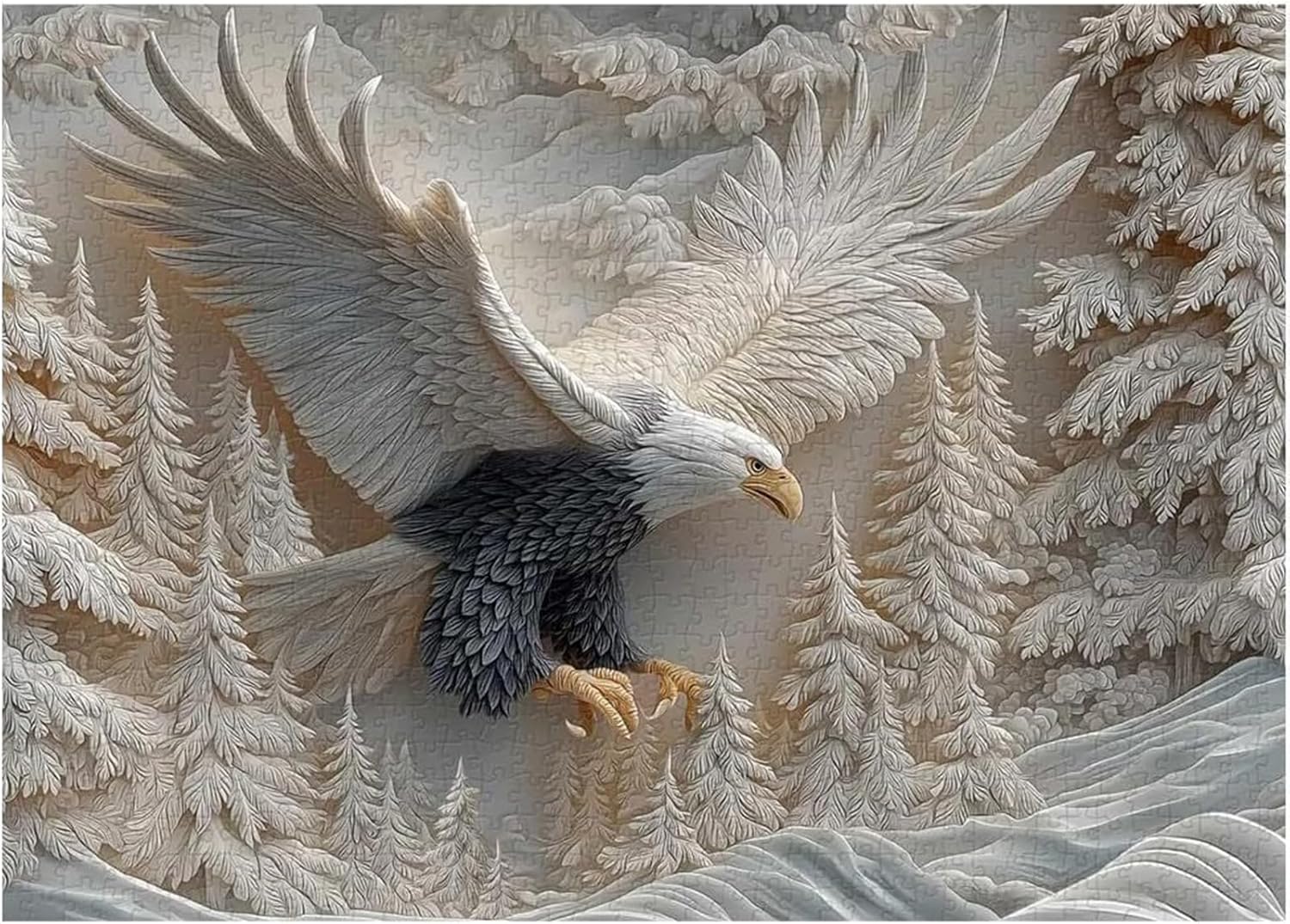 Potente aquila in volo: puzzle che raffigura un'aquila calva con ali e artigli estesi, catturando il movimento, la grazia e l'indipendenza selvatica. Sfondo artistico di foresta dettagliata, con alberi scolpiti a mano e luci soffuse, ideale per gli amanti dell'arte e della natura. Combinazione di colori rilassante: bianchi, grigi e marroni chiari per un effetto visivo pacifico e raffinato. Sfida coinvolgente da 1000 pezzi, perfetto per adulti e famiglie, stimola pazienza, concentrazione e lavoro di squadra. Decorazione ispirata alla fauna selvatica da incorniciare o esporre, porta la natura selvaggia in casa.