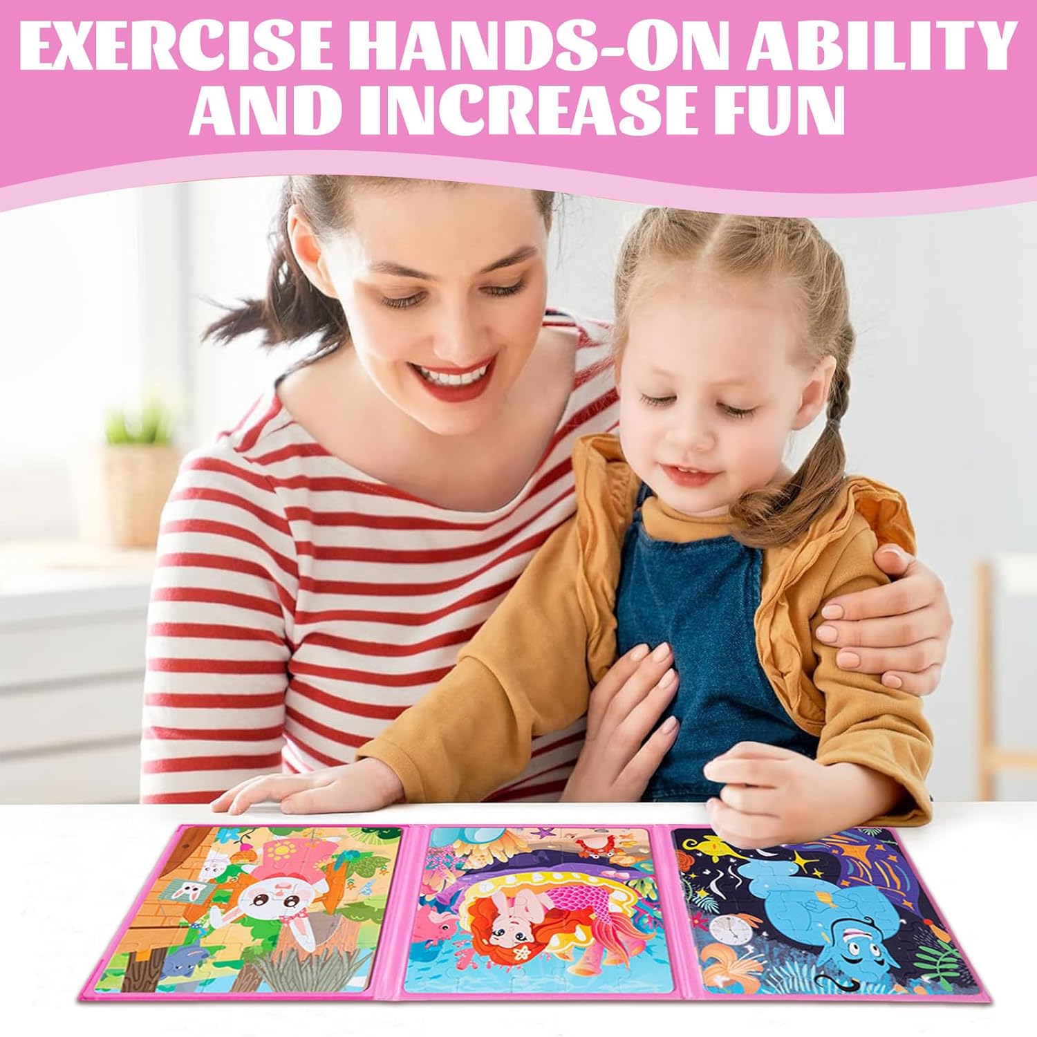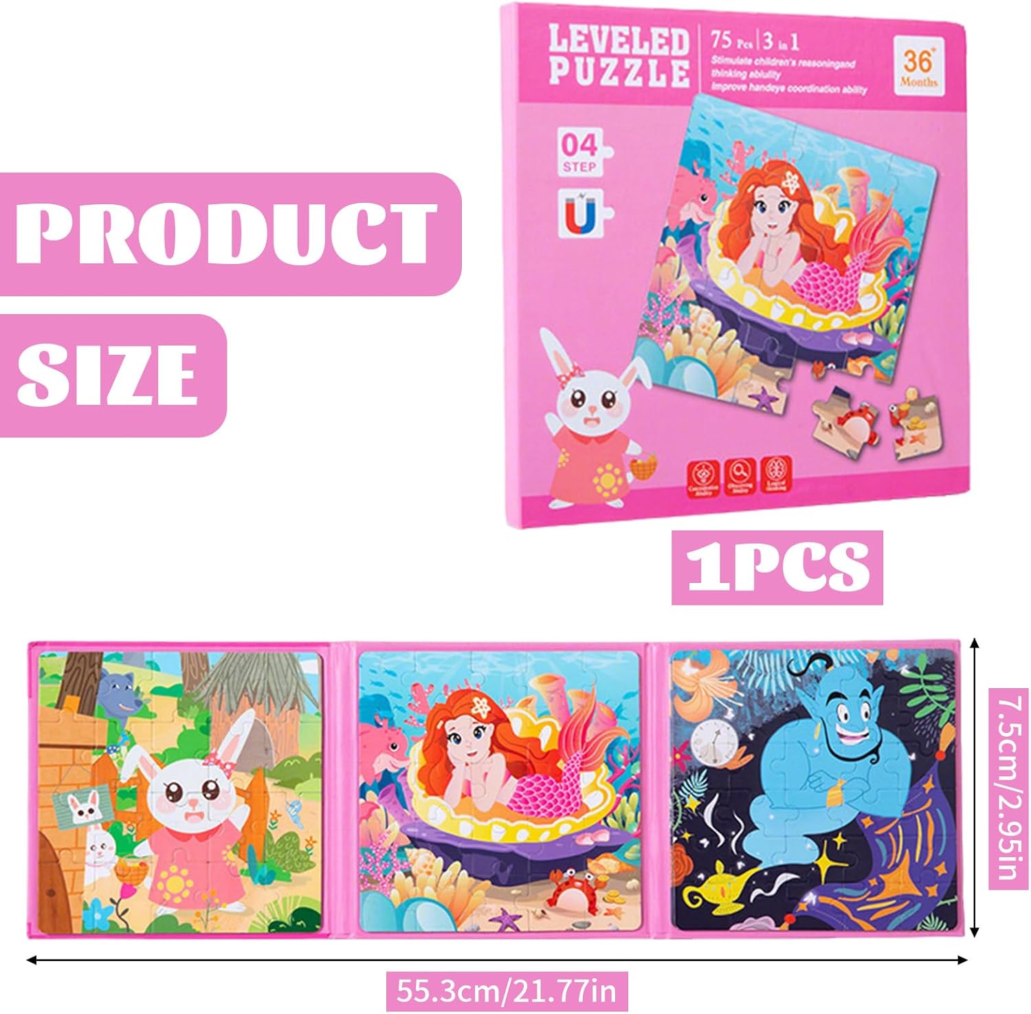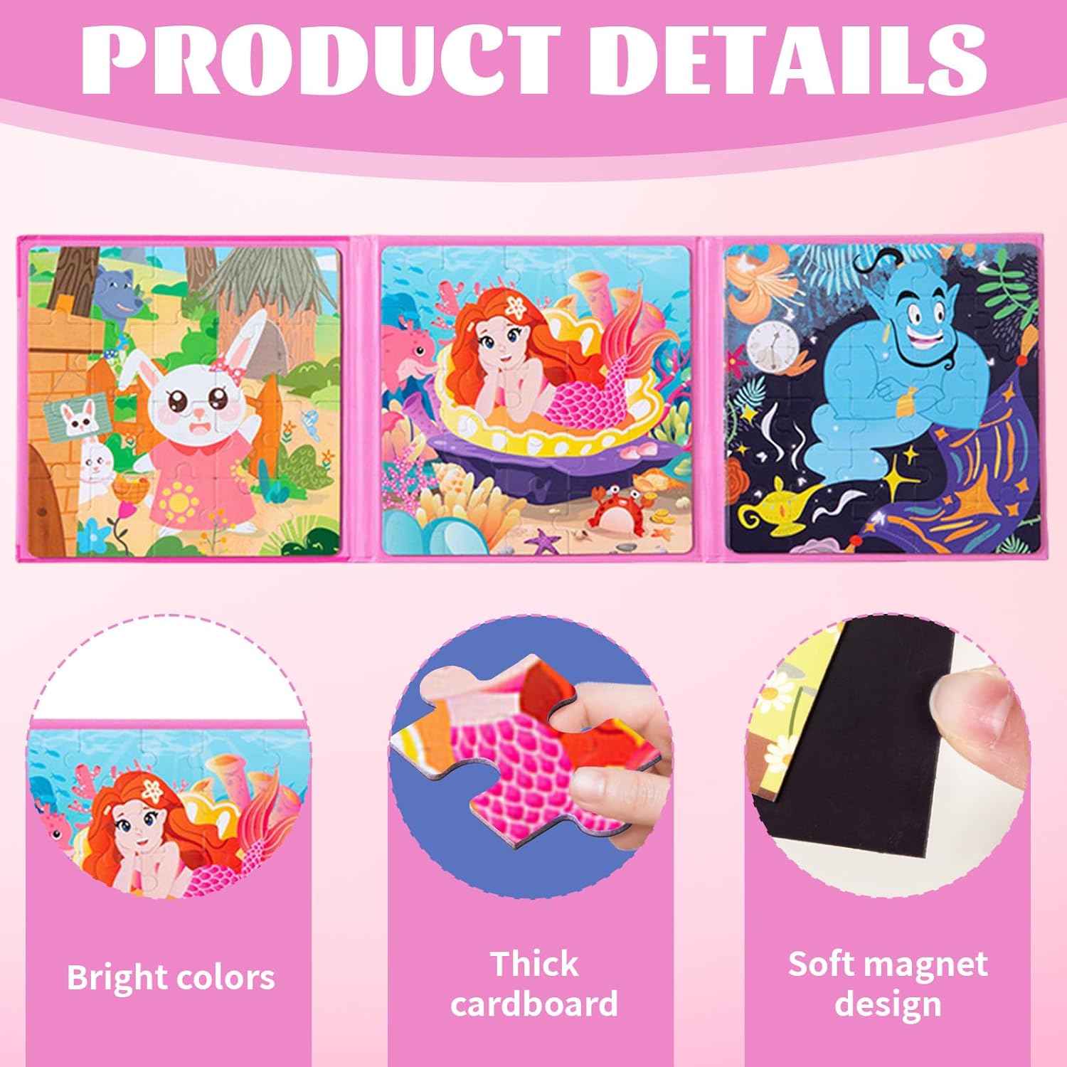 Materiali di Alta Qualità: Puzzle magnetico 2 anni è realizzato in cartone bianco di alta qualità, con una texture spessa e resistente che impedisce efficacemente al puzzle di piegarsi o rompersi durante l'uso frequente. La sua superficie liscia e raffinata e l'elevata riproduzione dei colori offrono un'esperienza visiva confortevole per i bambini, migliorando al contempo la durata e la qualità complessiva del puzzle Design a Libro: Puzzle magnetico 3 anni presenta un innovativo design a libro pieghevole che si ripiega facilmente una volta chiuso, rendendolo leggero e facile da trasportare. Si adatta facilmente allo zaino di un bambino, alla tasca laterale del seggiolino auto o al cestino da picnic. Il design integrato impedisce ai pezzi di staccarsi, consentendo ai bambini di aprire e chiudere il puzzle in modo indipendente Collegamenti Stabili: la potente tecnologia magnetica di puzzle bambini 2 anni garantisce un collegamento sicuro tra i moduli, garantendo un assemblaggio fluido e preciso e prevenendo l'allentamento e la rottura, garantendo la stabilità complessiva del puzzle. puzzle bambini 4 anni permette ai bambini di concentrarsi sul processo creativo, aumentando il valore espositivo e il valore collezionabile dei pezzi finiti Tre Design: Il set puzzle 2 anni include tre puzzle da 20, 25 e 30 pezzi, rispettivamente, con livelli di difficoltà crescenti, tra cui un simpatico coniglietto, una sirena e la lampada di Aladino. Il design progressivamente più complesso di puzzle magnetici si adatta alla crescita dei bambini e stimola il desiderio di sfide più impegnative Ampia Applicazione: Che si tratti di un lungo viaggio, di un'attesa in ospedale, di un pasto al ristorante o di un momento di tranquillità a casa, puzzle magnetico 4 anni può essere facilmente integrato. intrattenere bambini in aereo aiuta i bambini a rimanere concentrati e calmi in diversi ambienti ed è una scelta intelligente per gestire il tempo frammentato
