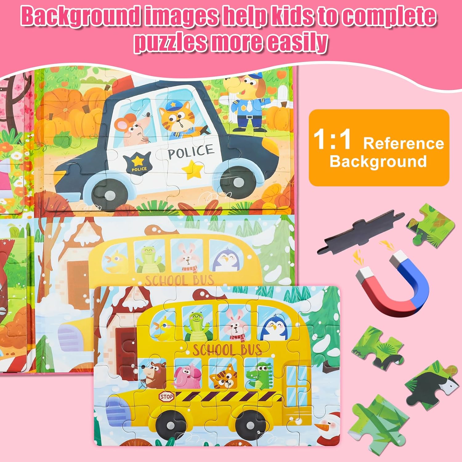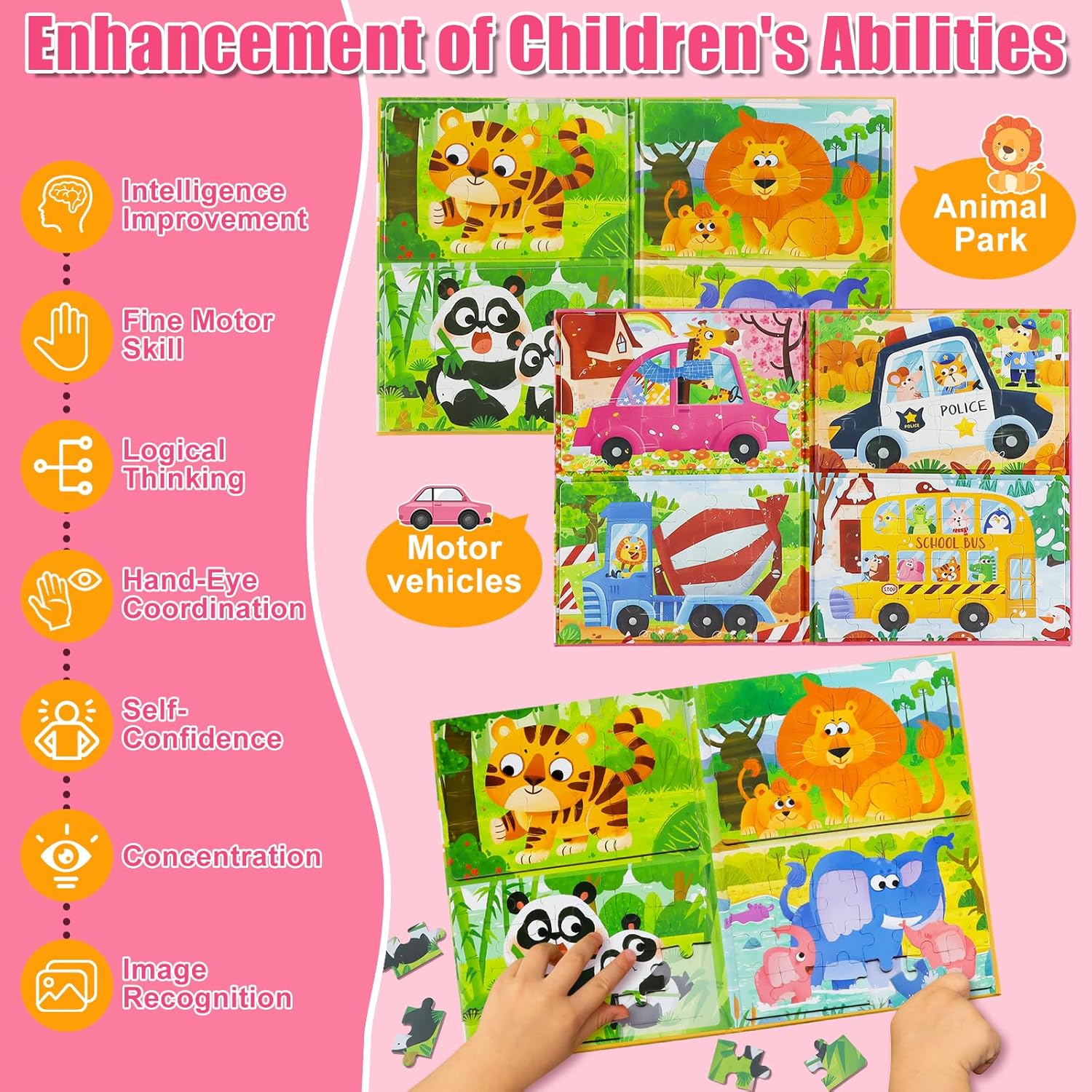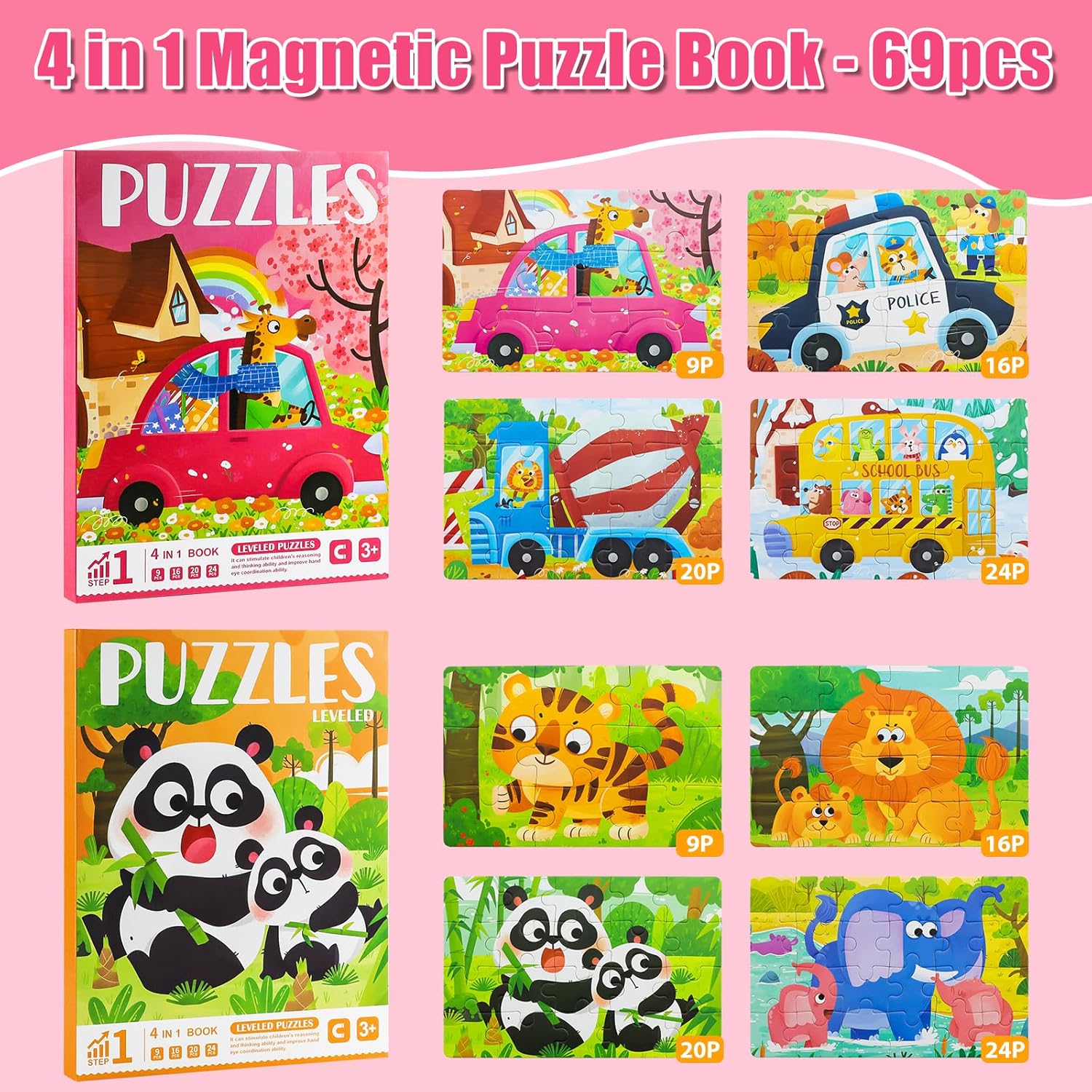 Il set di puzzle è composto da 2 libri di puzzle con un totale di 138 pezzi di puzzle magnetici in 4 livelli di difficoltà (9, 16, 20 e 24 pezzi) per adattarsi allo sviluppo dei bambini dai 3 ai 6 anni. Grazie ai diversi livelli di difficoltà, i bambini crescono con le sfide e si divertiranno a lungo con questo giocattolo. 🐼𝙎𝙞𝙘𝙝𝙚𝙧𝙚 𝙈𝙖𝙩𝙚𝙧𝙞𝙖𝙡𝙞𝙚𝙣🐼: i nostri puzzle sono realizzati con materiali atossici e inodori e le parti magnetiche forti si adattano meglio e non cadono e perdono i pezzi. Una buona dimensione per le mani piccole. La stampa è bella e resistente. La superficie del libro può essere facilmente pulita con un panno umido per mantenere i puzzle in ottime condizioni. 🚗𝙇𝙚𝙗𝙚𝙣𝙙𝙞𝙜𝙚 𝘽𝙞𝙡𝙙𝙚𝙧🚗: I puzzle presentano simpatici animali e veicoli colorati, perfetti per attirare l'attenzione dei bambini. I nostri puzzle hanno un modello di riferimento per bambini 1:1 facile da completare ed è il puzzle perfetto per bambini dai 3 ai 6 anni. I bambini avranno un senso di realizzazione quando finiranno il puzzle. 💯𝙈𝙤𝙣𝙩𝙚𝙨𝙨𝙤𝙧𝙞 𝙇𝙚𝙧𝙣𝙨𝙥𝙞𝙚𝙡𝙯𝙚𝙪𝙜 𝙛𝙪̈𝙧 𝙆𝙞𝙣𝙙𝙚𝙧💯: Tieni i tuoi figli lontani dai videogiochi. Ideale per bambini dai 3 anni in su, favorisce la motricità fine, la concentrazione, il riconoscimento di forme e colori e il pensiero logico in modo giocoso. Facile da usare: i libri sono maneggevoli e possono essere facilmente portati ovunque, perfetti per gli spostamenti o i viaggi. Puzzle con magneti, molto divertenti per i più piccoli. Questi puzzle magnetici per bambini sono un'ottima scelta come regalo per compleanni, Natale, Festa dei bambini e altre festività.