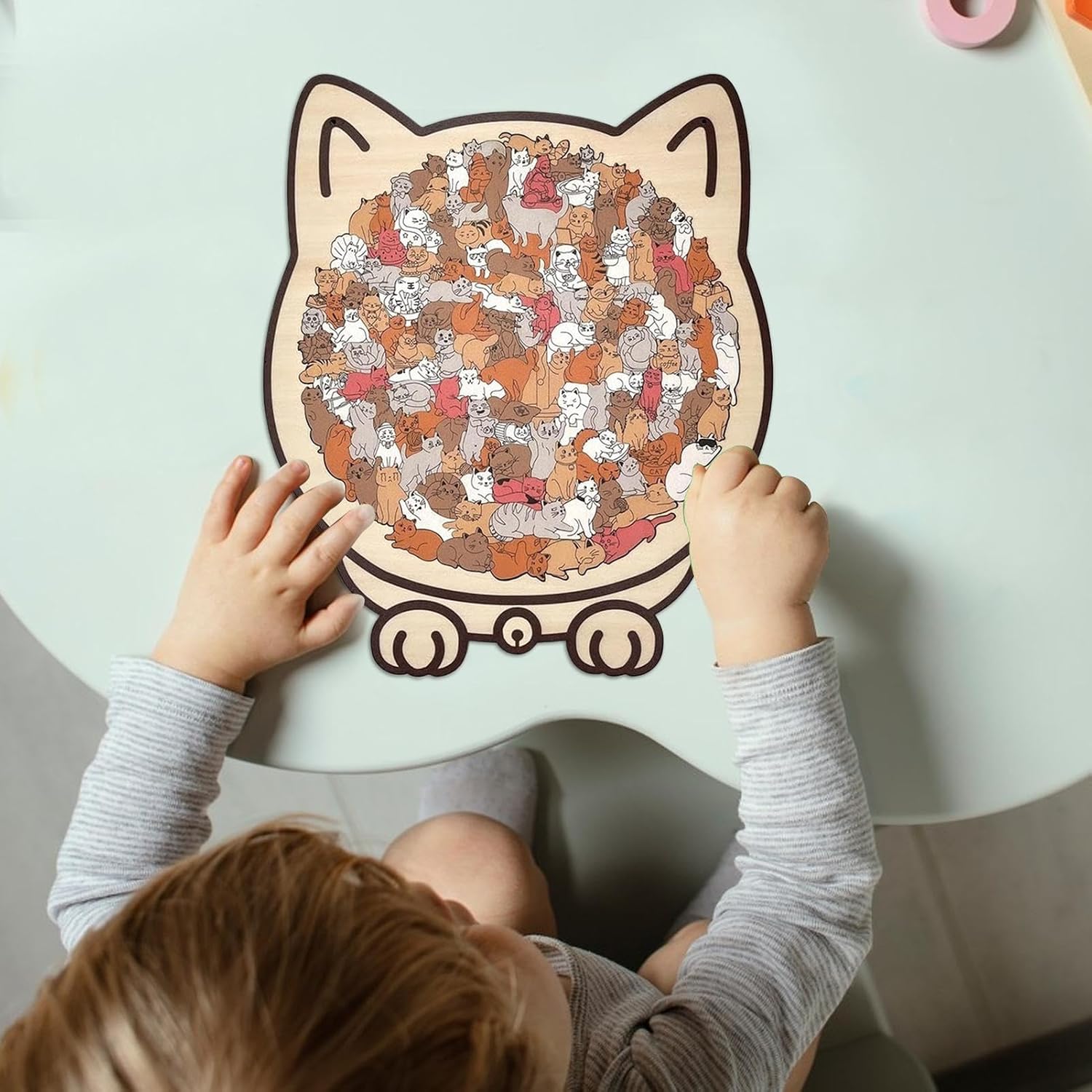 Materiale durevole e affidabile: progettato in legno di alta qualità, questi puzzle di gatto per adulti hanno una consistenza ecologica e bordi con cura, lisci e sicuri, creando una piacevole esperienza tattile. Perfetti per rilassarsi dopo il lavoro o per sessioni di gioco mindfulness, combinano robustezza e comfort, garantendo un uso prolungato senza usura prematura. Il loro design durevole li rende adatti a momenti di calma o socializzazione, gratificante Distintivo forma di gatto: questo puzzle gatto presenta pezzi di puzzle artistici con una struttura attraente in una forma di gatto unica, offrendo un assemblaggio coinvolgente migliorando la concentrazione e la creatività durante il tempo di gioco o le attività di rafforzamento dei legami familiari, per momenti di complicità e di apprendimento. Regalo divertente ed estetico: questo giocattolo puzzle per gatti combina intrattenimento ed estetica, funzionante come un pezzo di arte decorativa che migliora il calore della casa. La sua natura decorativa e collezionabile lo rende una scelta regalo ideale, creando spazi accoglienti dove gatti e proprietari rafforzano i loro legami attraverso interazioni in un ambiente elegante. Questo innovativo giocattolo per gatti offre una soluzione pratica per arricchire la vita quotidiana con stile e complicità. Relax e divertimento: i puzzle di gatto offrono un'esperienza di concentrazione coinvolgente che lenisce e riduce lo stress durante i momenti di svago o le serate tranquille a casa. Questo gioco di relax e divertimento ideale per intrattenere durante le pause calme, promuovendo un benessere mentale grazie al suo design coinvolgente e rilassante. Attività di rafforzamento della pazienza: Questo puzzle di gatto presenta 135 pezzi tagliati con precisione accurata, progettati per testare la logica e rafforzare la pazienza. Offre una stimolazione cerebrale ideale e un momento di relax in serate tranquille o attività ricreative che richiedono una concentrazione sostenuta, perfetto per gli amanti delle sfide mentali e del relax.