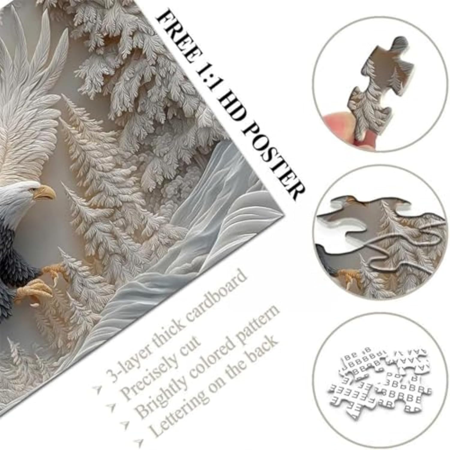 Un maestoso motivo di un'aquila calva offre un'esperienza visiva sofisticata: questo puzzle presenta una maestosa aquila calva annidata in un paesaggio selvaggio e innevato, evidenziandone la postura dinamica e la potente presenza. La combinazione di colori monocromatici di bianco, grigio e marrone chiaro evidenzia la delicata trama dell'aquila creando al tempo stesso un puzzle calmo da 1000 pezzi per un'esperienza coinvolgente per gli adulti: questo puzzle da 1000 pezzi combina sfida e senso di realizzazione e richiede di distinguere accuratamente i pezzi dello stesso colore. Questa sfida favorisce la concentrazione e consente agli adulti di prendersi una pausa rilassante dai dispositivi elettronici. Cartone a tre strati, robusto e facile da montare: questo puzzle di alta qualità da 1000 pezzi è realizzato in cartone a tre strati di alta qualità, che garantisce maggiore stabilità e mantenimento della forma e consente un assemblaggio ripetuto senza pieghe. La superficie liscia e priva di bave e il preciso sistema di inserimento garantiscono un montaggio fluido e confortevole. Doppiamente pratico: questo puzzle in stile Art Déco non è solo un fantastico gioco di puzzle, ma anche una vera attrazione. Può essere appeso al muro o appoggiato sul tavolo, aggiungendo un tocco di fascino naturale al soggiorno o allo studio. In pochissimo tempo si trasforma da oggetto di intrattenimento in pratico oggetto decorativo. MULTIUSO: questo avvincente puzzle per adulti è perfetto per rilassarsi, trascorrere del tempo con la famiglia o competere con gli amici. Così il tuo tempo libero sarà ancora più piacevole e divertente.