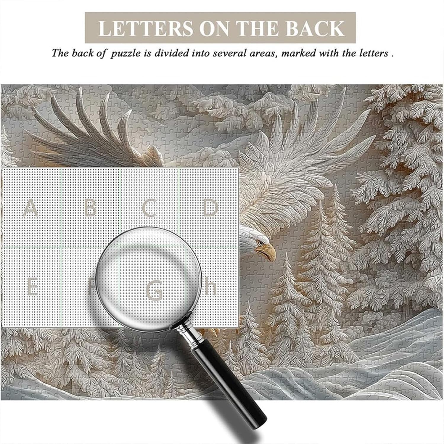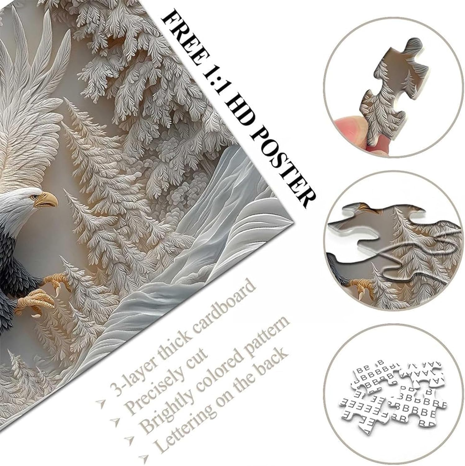 Design "Maestosa Aquila Calva": Una potente aquila calva immortalata in volo con le ali completamente spiegate, simbolo di libertà e forza attraverso intricati dettagli intagliati. Sfondo forestale strutturato: Lo sfondo della foresta presenta alberi scolpiti e un fogliame dai toni tenui e chiari, aggiungendo strati di texture e profondità artistica alla scena del puzzle. Elegante palette monocromatica: Realizzata con bianchi, grigi e delicati marroni, la combinazione di colori sereni favorisce la concentrazione e la calma durante il montaggio. Sfida impegnativa e gratificante: Con 1000 pezzi tagliati con precisione, questo puzzle offre una sfida appagante per gli adulti, ideale per rilassarsi, concentrarsi e rafforzare i legami familiari. Opera d'arte degna di essere esposta: Una volta completata, la maestosa aquila e la foresta strutturata formano uno splendido pezzo da esposizione, perfetto per l'arredamento di casa o dell'ufficio.