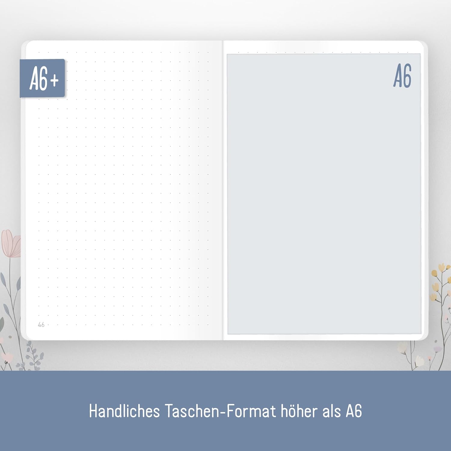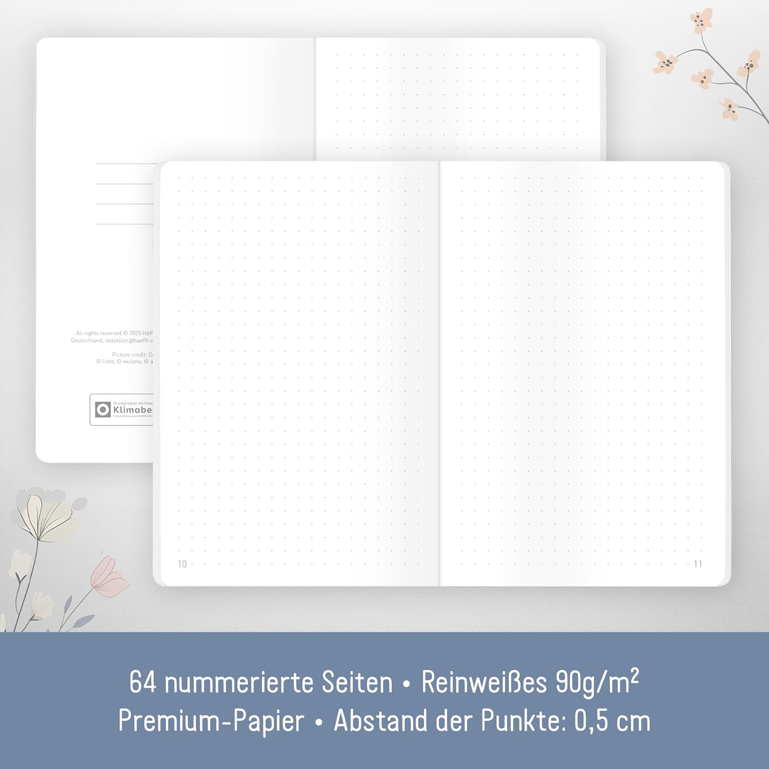APPUNTI SEMPRE A PORTATA DI MANO - Quaderno compatto della Häfft-Verlag per annotare idee spontanee, cose da fare, schizzi veloci o pensieri creativi! Dimensioni: 10,6 x 16,1 cm PERFETTO PER I VIAGGI - La copertina morbida e flessibile è perfetta per i pantaloni o le tasche delle mani e gli angoli arrotondati proteggono il taccuino dalle orecchie degli asinelli. LINEA A PUNTI FLESSIBILE - 64 pagine a punti numerati offrono molteplici possibilità per scrivere, pianificare, disegnare o come mini diario nel pratico formato A6+. SOSTENIBILE E RISPETTOSA DEL CLIMA Sii creativo con la coscienza pulita: per amore dell'ambiente, la nostra carta premium da 90 g/m² è certificata FSC (FSC N004440) e stampata in modo rispettoso del clima. LOCALE E RESPONSABILE - Tutti i nostri articoli sono progettati con amore a Monaco e stampati esclusivamente in Germania o nei paesi limitrofi. Ciò mantiene brevi i percorsi di consegna e fornisce anche un importante contributo alla protezione del clima.