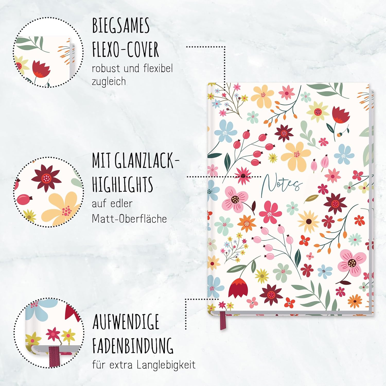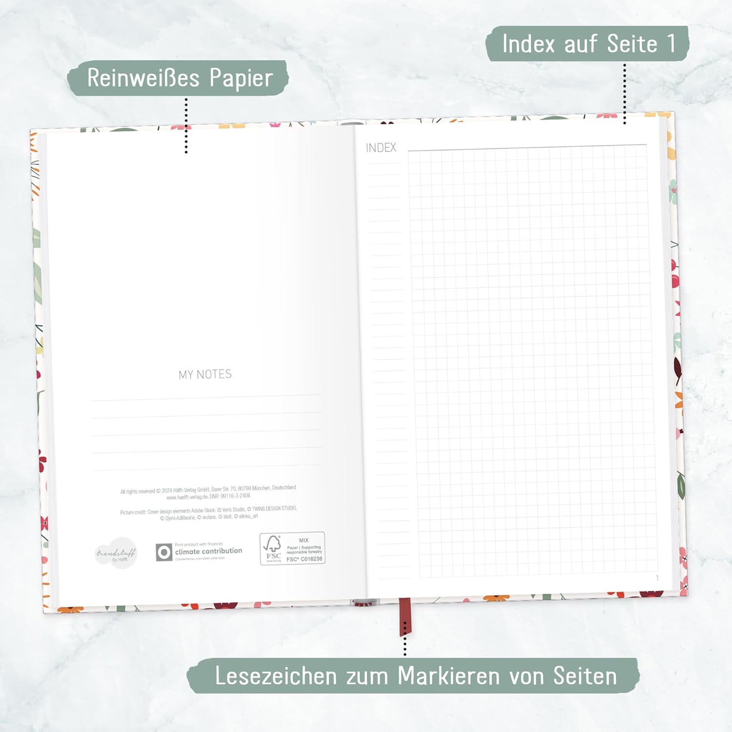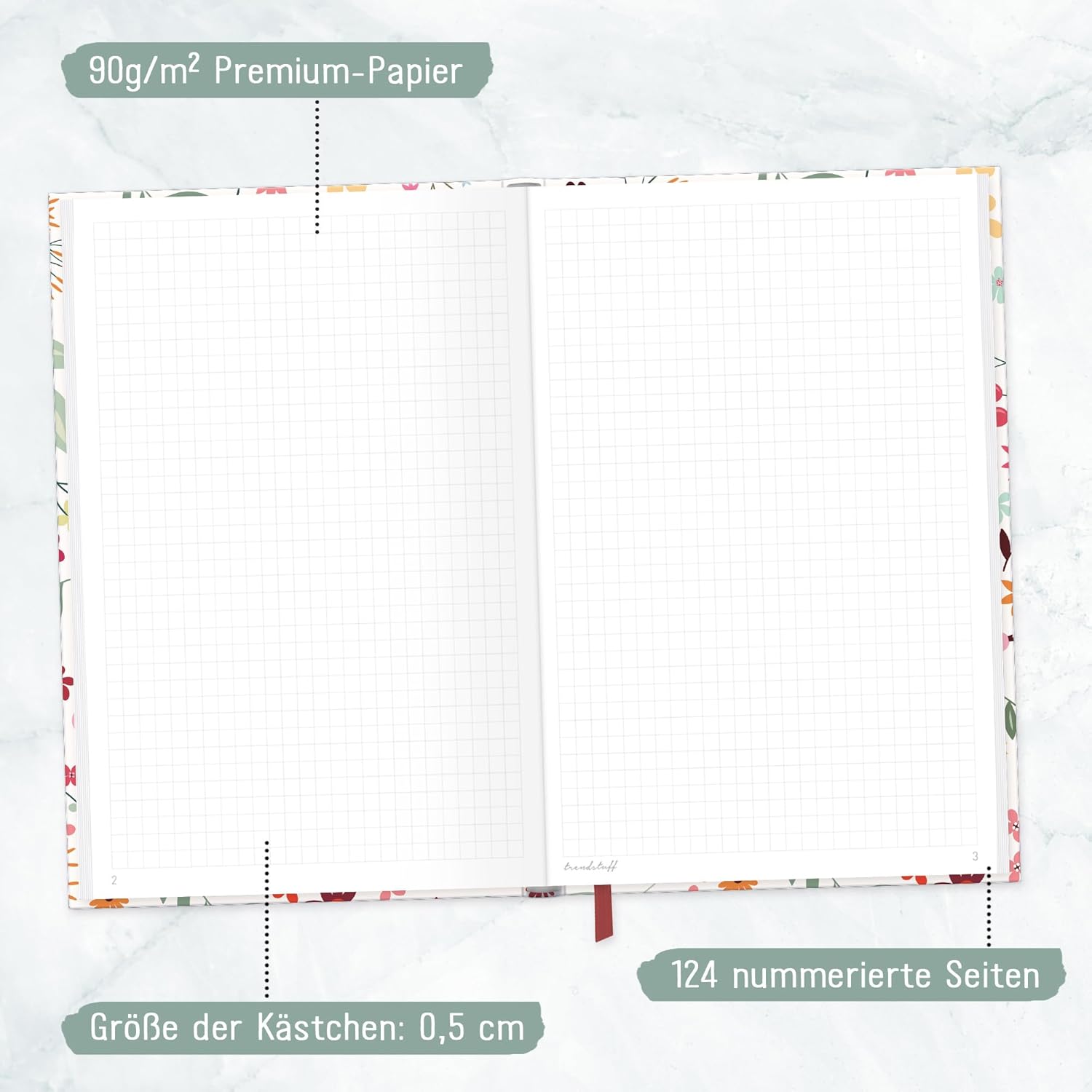Elegante taccuino con nastro da lettura per uso universale: come diario, per obiettivi, schizzi, progetti e pensieri, come diario o per bullet journaling - sempre con te e a portata di mano quando Wildflower annuncia! Un compagno fedele: la copertina flexo flessibile ma stabile unisce le migliori caratteristiche della copertina rigida e della copertina morbida, è inoltre resistente agli schizzi e cancellabile. La rilegatura cucita intricata e robusta impedisce che le pagine si strappino. Una carta che promuove il buon uso delle foreste: la nostra carta Premium da 90 g/m² è certificata FSC (FSC N004440). Per fare un confronto, la carta standard ha solitamente uno spessore di soli 70 g/m². Carta e penna piuttosto che smartphone: scrivere a mano i tuoi pensieri, sentimenti, idee o obiettivi può aiutarti ad essere più chiaro e ad avere più successo! Pratico quaderno formato: DIN A5 (15 x 21 x 1 cm), righe: a quadretti, pagine: 124