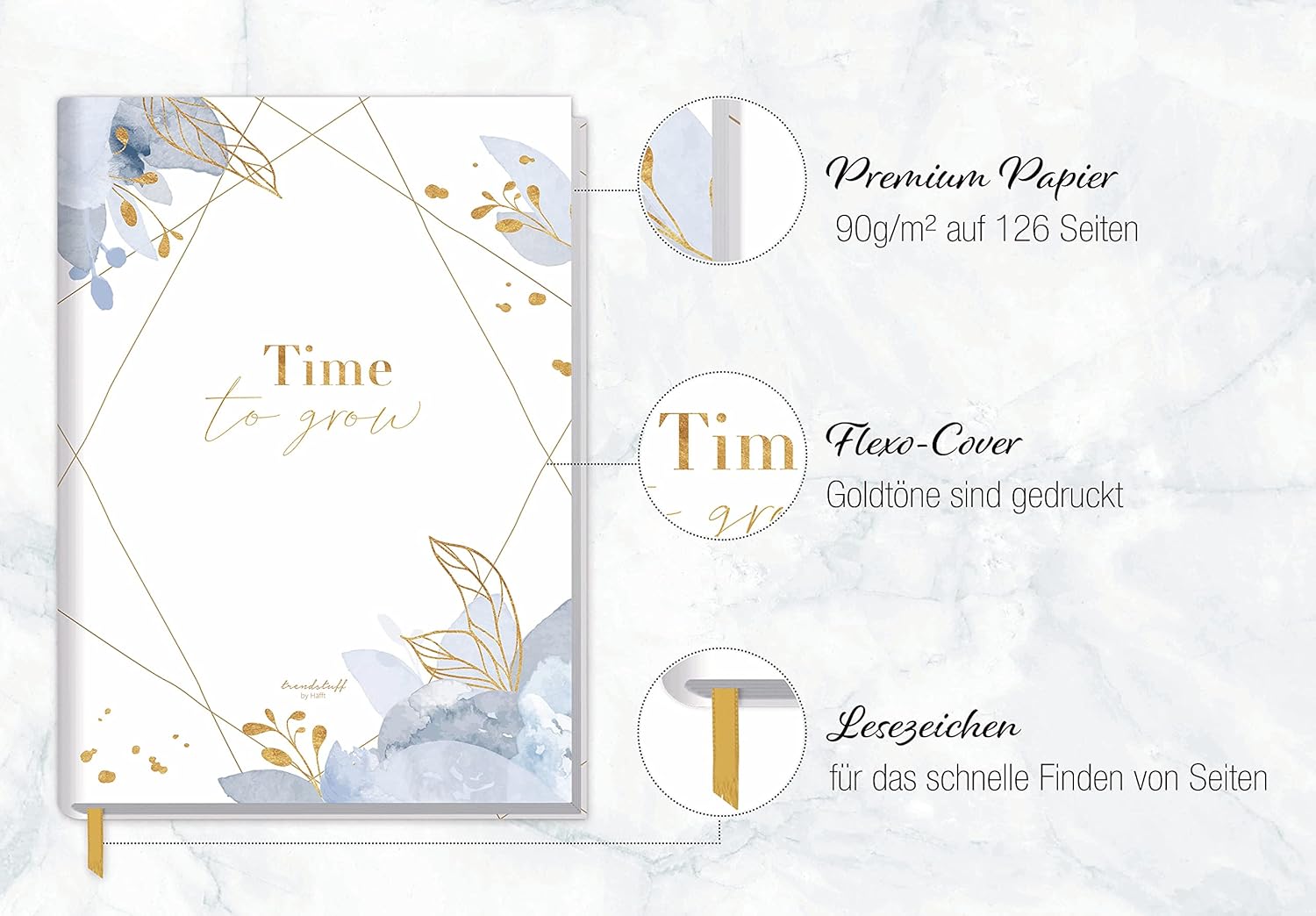 Elegante quaderno a righe con nastro da lettura per uso universale: come diario, per obiettivi, schizzi, progetti e pensieri, come diario o per bullet journaling - sempre con te e a portata di mano quando colpisce un lampo di genio! Un compagno fedele: la copertina flexo flessibile ma robusta unisce le migliori caratteristiche delle copertine rigide e morbide, è resistente agli schizzi e cancellabile. La rilegatura a filo intricata e robusta tiene insieme le pagine in modo sicuro. La carta promuove il buon uso delle foreste: la nostra carta di alta qualità da 90 g/m² è certificata FSC (FSC N004440) e stampata nel rispetto del clima. Carta e penna piuttosto che smartphone: scrivere a mano i tuoi pensieri, sentimenti, idee o obiettivi può aiutarti ad essere più chiaro e ad avere più successo! Pratico quaderno formato: DIN A5 (15 x 21 x 1 cm), righe: a righe, pagine: 124