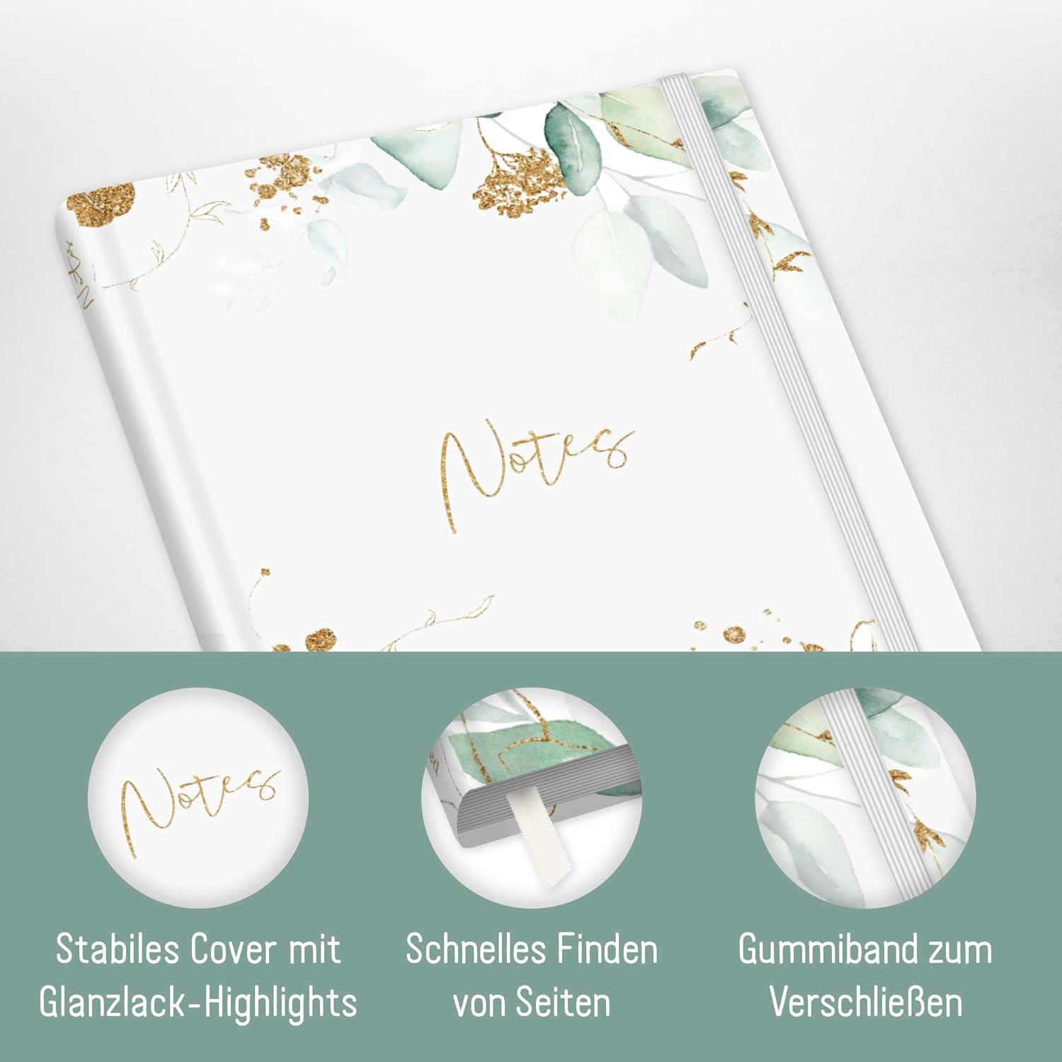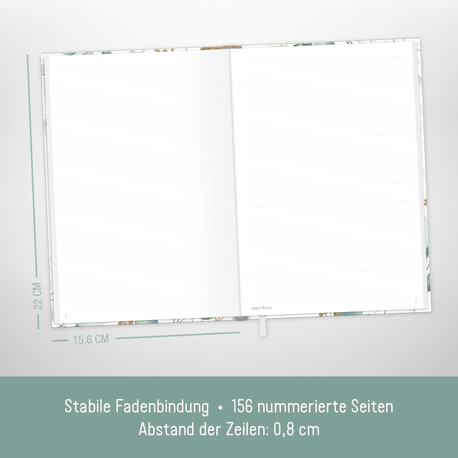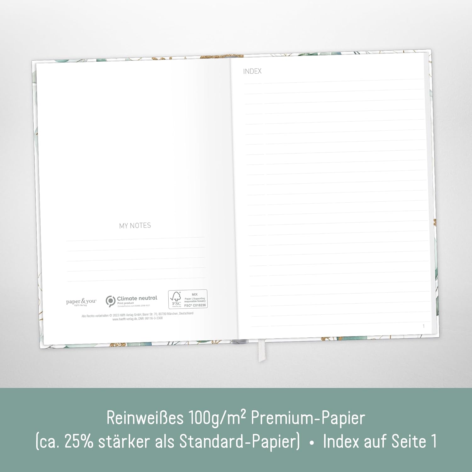 QUADERNO A RIGHE - Della Häfft-Verlag, leggermente più grande del formato A5 (15,6 x 21,7 cm), con pratico elastico per la chiusura e nastro da lettura per segnare le pagine. Libro per prendere appunti di ogni genere, obiettivi, schizzi, diario, progetti e pensieri! SOSTENIBILE E RISPETTOSA DEL CLIMA - Prendi appunti con la coscienza pulita: per il bene dell'ambiente, la nostra carta premium da 100 g/m² proviene da fonti controllate, certificata FSC (FSC N004440) e stampata nel rispetto del clima. UN COMPAGNO FEDELE - La copertina flexo combina il meglio della copertina rigida e della copertina morbida: è robusta, flessibile, resistente agli schizzi e cancellabile. La resistente rilegatura a filo tiene insieme le pagine in modo sicuro. FAI UN REGALO A TE STESSO E AGLI ALTRI - Ideale per uso personale o come regalo carino per i tuoi cari, questo taccuino chic ti fa venire voglia di posare lo smartphone e tirare fuori la penna! DIMENSIONI PRATICHE - Il quaderno Dory inserisce ordinatamente fogli A5 staccati o fogli A4 piegati, se necessario.