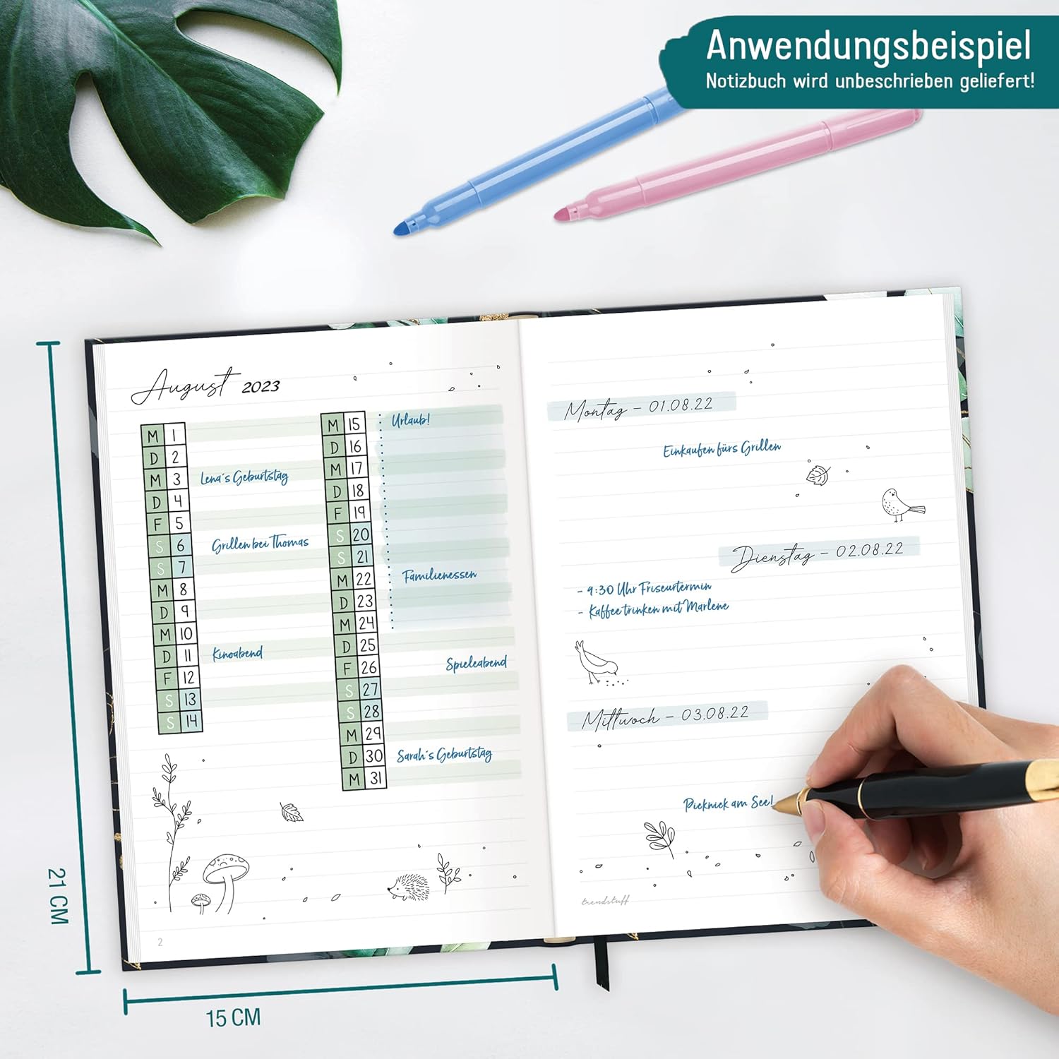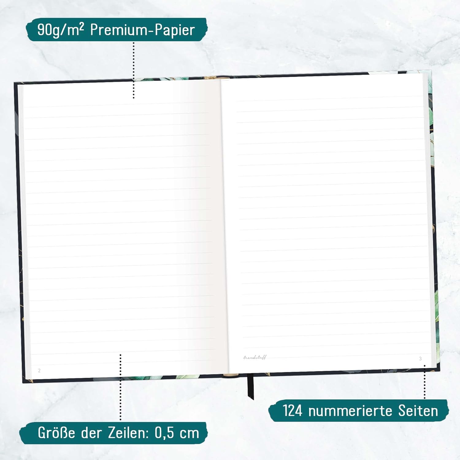 Elegante quaderno a righe con nastro da lettura per uso universale: come diario, per obiettivi, schizzi, piani e pensieri, come diario o per bullet journaling - sempre con te e a portata di mano quando i fiori dell'annuncio! Un compagno fedele: la copertina flexo flessibile ma robusta unisce le migliori caratteristiche delle copertine rigide e morbide, è resistente agli schizzi e cancellabile. La rilegatura a filo intricata e robusta tiene insieme le pagine in modo sicuro. La carta promuove il buon uso delle foreste: la nostra carta di alta qualità da 90 g/m² è certificata FSC (FSC N004440) e stampata nel rispetto del clima. Carta e penna piuttosto che smartphone: scrivere a mano i tuoi pensieri, sentimenti, idee o obiettivi può aiutarti ad essere più chiaro e ad avere più successo! Pratico quaderno formato: DIN A5 (15 x 21 x 1 cm), righe: a righe, pagine: 124