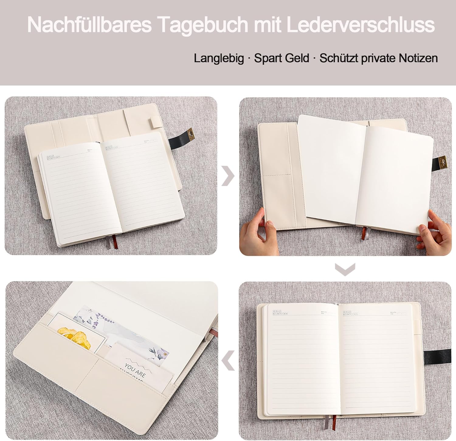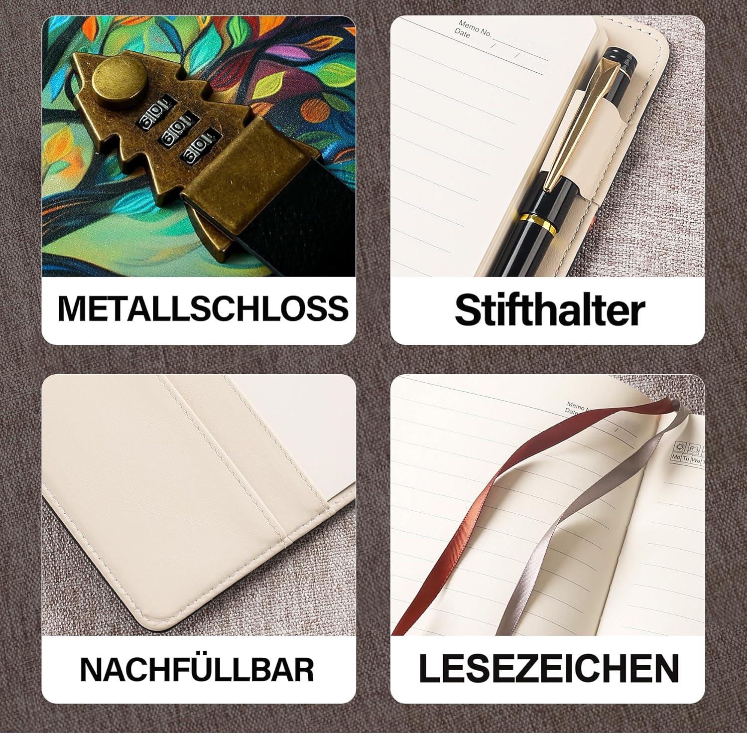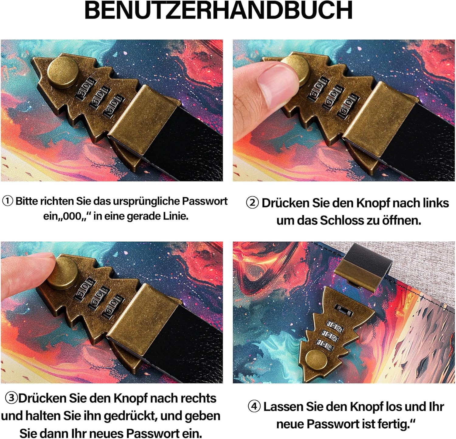 Diario chiudibile con lucchetto a combinazione: questo diario è dotato di un lucchetto a combinazione a tre cifre che mantiene i tuoi pensieri, ricordi e idee al sicuro: ideale per la privacy quotidiana, i viaggi o la scuola. 244 pagine a righe - Carta premium: con 244 pagine a righe di carta spessa da 100 g/m², il diario offre molto spazio per annotazioni quotidiane, appunti creativi, schizzi o pianificazione degli obiettivi - Nessun flusso di sangue o sanguinamento di inchiostro. Elegante pelle PU - Elegante e resistente: la morbida copertina in pelle vegana si adatta comodamente alla mano e conferisce al diario un aspetto elegante e professionale, perfetto per donne, uomini e adolescenti. Uso versatile e ottimo regalo: ideale come diario, diario di viaggio, diario o agenda: un regalo premuroso per compleanni, lauree, Natale o come regalo per te stesso. Compatto e sempre a portata di mano: pratico formato A5 (circa 14,5 x 21 cm), il taccuino entra facilmente in ogni borsa. Perfetto per i viaggi, l'ufficio, la scuola o la casa: il tuo compagno quotidiano per scrivere, pensare e sognare.