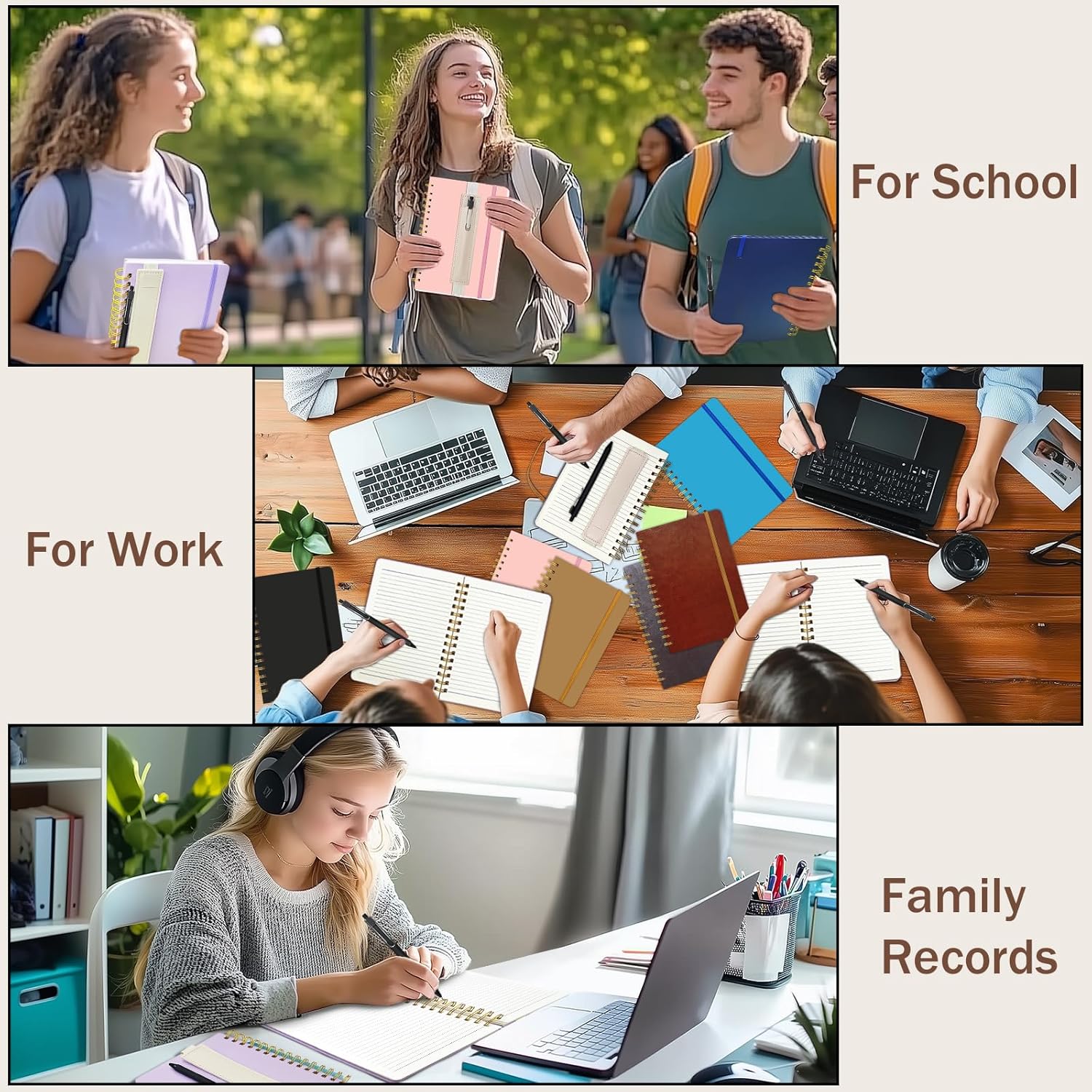 Un joli cahier sous une couverture simili cuir noir avec des feuilles muni de lignes le tout détachables car le cahier est en spirale. Ce cahier est muni du stylo qui l'accompagne et assorti ainsi qu'un porte stylo de couleur beige simili cuir également Les feuilles sont plus épaisse que la moyenne et donc de qualités ! Il est agréable d'écrire avec le stylo sur celui-ci qui est refermeable !