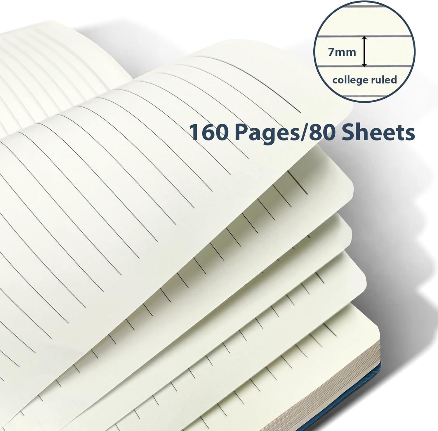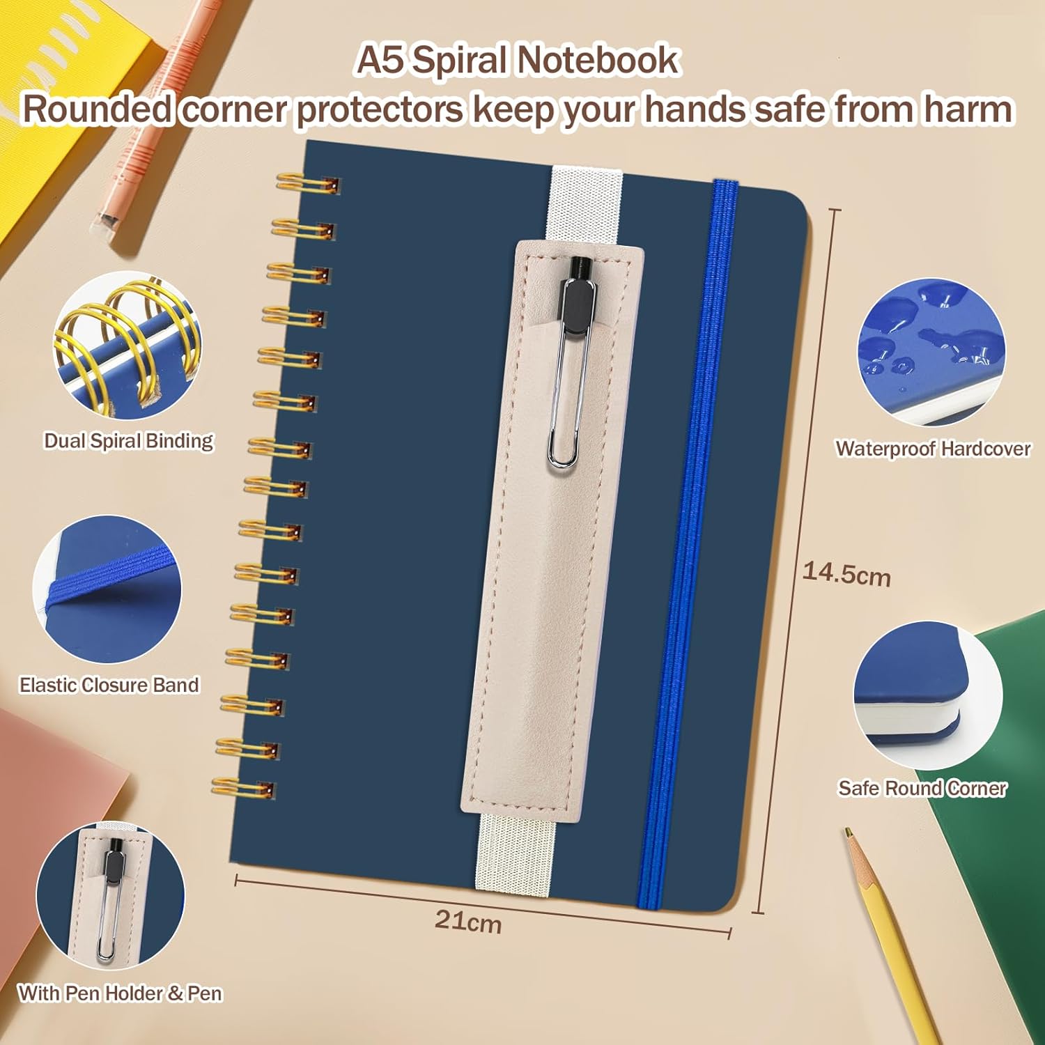 Contenuto della confezione: include un blocco a spirale A5, un portapenne rimovibile e una penna a sfera nera. Il taccuino blu navy ha un'elegante copertina rigida in ecopelle impermeabile, angoli arrotondati e un elastico. Formato A5 perfetto: questo leggero taccuino a righe A5 misura 21 x 14,5 cm e si adatta facilmente a borse, zaini e borse da viaggio, ideale per gli spostamenti. La robusta copertina in pelle blu scuro aggiunge un tocco elegante alla scrittura di tutti i giorni Carta di alta qualità: 80 fogli (160 pagine) di carta liscia bianco avorio (80 g/m²). Ideale per professionisti o studenti che cercano un pratico quaderno per il lavoro, l'ufficio, la scuola o per i corsi di studio. Buona rilegatura a spirale: il taccuino a spirale mantiene il taccuino piatto per una facile visualizzazione o piegatura delle pagine. Una corretta perforazione semplifica lo strappo delle pagine per elenchi di cose da fare, note e promemoria in movimento. Buono regalo: diffondi ispirazione e nuove possibilità. Il taccuino con penna ha un bell'aspetto e un design pratico. Il quaderno a spirale A5 è un regalo premuroso per compleanni, lauree o altre occasioni speciali