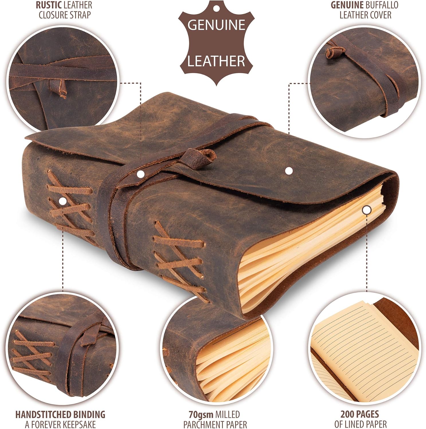 A differenza dei deludenti diari in finta pelle realizzati da altri marchi, il diario da viaggio in pelle Moonster è realizzato al 100% in pelle di bufalo naturale tagliata a mano e carta KRAFT di alta qualità. Fatto a mano in India, il nostro diario rilegato in pelle ha un DESIGN AUTENTICO INCANTEVOLE, che sorprenderà sicuramente le persone che lo riceveranno. MENTRE MOLTI DIARI IN ECOPELLE SONO SBAGLIATI, CON RILEGATURA INCOLLATA E PAGINE CHE CADONO, il nostro diario è qualcosa che conserverai per il resto della tua vita. La sua rilegatura in pelle ANTICA cucita a mano consente alle pagine di rimanere saldamente al loro posto. Composto da 200 fogli / 400 pagine di CARTA PERGAMENA a righe, il nostro quaderno RIMANE PIATTO, per un maggiore piacere nel descrivere. IL TACCUINO MEDIO CONTIENE CARTA DI BASSA QUALITÀ, CHE DETERRA IL GIOCO DELLA DESCRIZIONE. Realizzato con materiali di QUALITÀ PREMIUM, il nostro taccuino in pelle RIUTILIZZABILE è dotato di CARTA A RIGHE BIANCA PREMIUM DA 70 G/M2, ideale per scrivere. Puoi utilizzare qualsiasi penna a sfera, stilografica o matita sui fogli a righe di questo bellissimo taccuino. QUESTO TACCUINO DA DISEGNO È UN BEL REGALO PREmuroso CHE DÀ IN RICAMBIO. Per ogni acquisto, Moonster dona una percentuale dei suoi profitti alla sua organizzazione no-profit preferita con sede in Africa, che lavora per PREVENIRE E PROTEGGERE I BAMBINI DALLA CRUDELTÀ E DAGLI ABUSI. Il nostro taccuino vintage per donna e uomo è splendidamente confezionato in un SACCHETTO DI COTONE ecologico. TACCUINO DA DISEGNO SODDISFATTO O RIMBORSATO PER UN ANNO: se il tuo taccuino ricaricabile originale arriva danneggiato o se riscontri un difetto di fabbricazione, CONTATTACI DIRETTAMENTE entro un anno. Ti invieremo un ARTICOLO DI SOSTITUZIONE, GRATUITAMENTE, o TI RIMBORSEREMO COMPLETAMENTE, senza fare domande. È un regalo ideale per un compleanno, una laurea o San Valentino! Ne vuoi 2, 3 o 4? RISPARMIA FINO A 6€! GUARDA TUTTE LE NOSTRE OFFERTE QUI SOTTO.