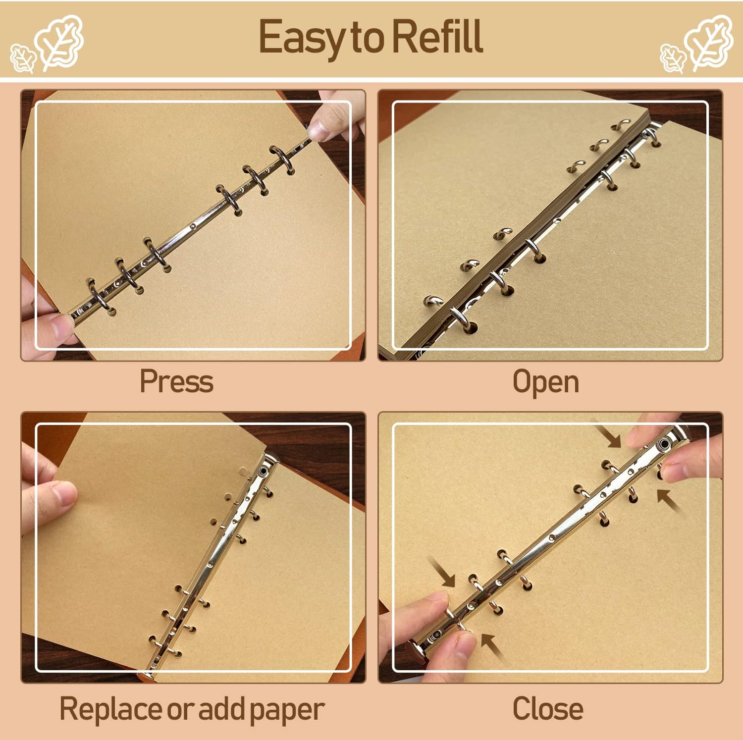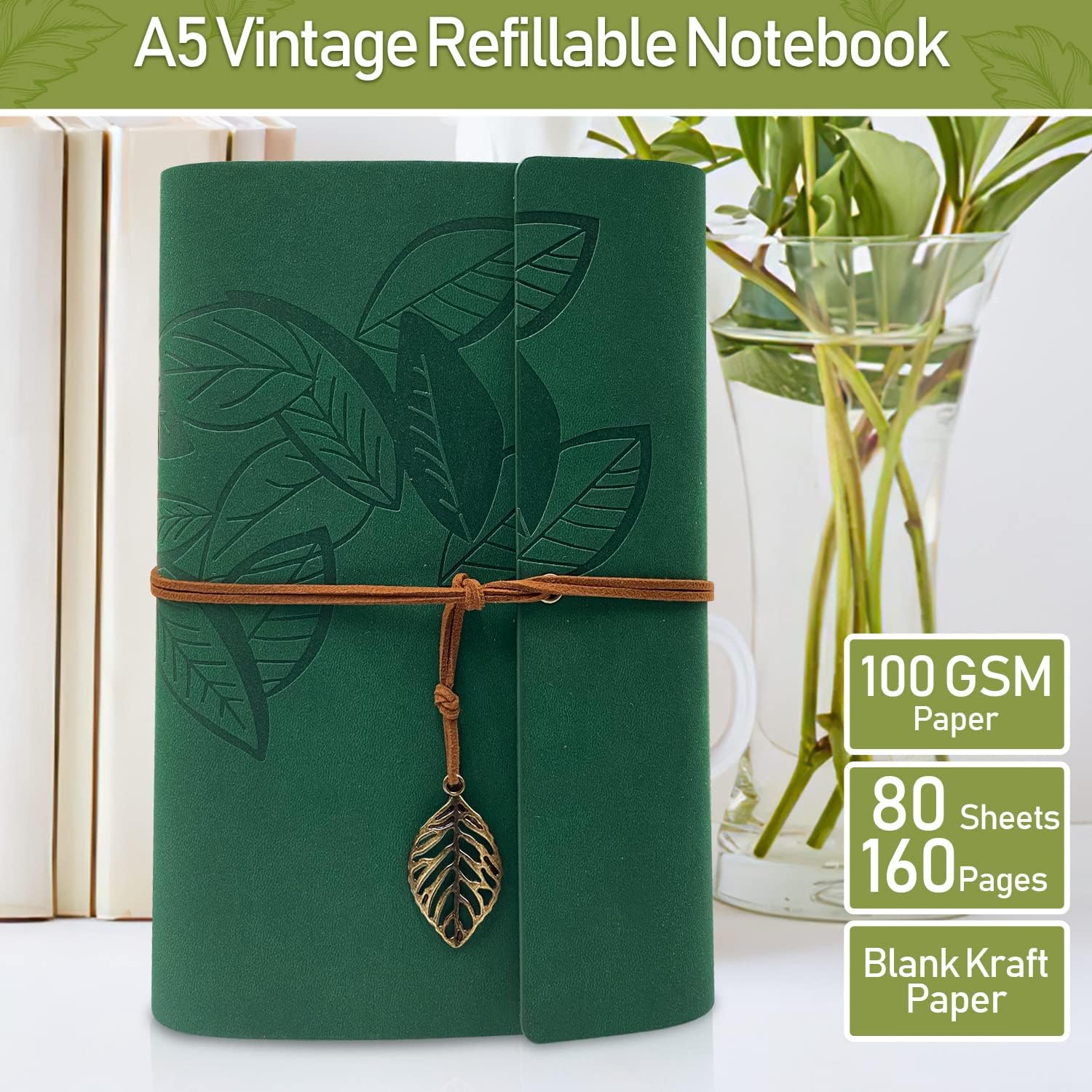 Diario vintage di alta qualità: realizzato in ecopelle di alta qualità, il taccuino ricaricabile ha un tocco morbido ed è adatto per viaggi, avventure all'aria aperta, attività all'aperto e college. Il piccolo raccoglitore integrato semplifica l'aggiunta di diari e pagine di calendario. Carta spessa e resistente all'inchiostro: la carta ricaricabile A5 (80 fogli/160 pagine) è realizzata in carta spessa e priva di acidi che resiste ai danni della luce e dell'aria e protegge gli occhi. È perfetto per penne stilografiche, penne gel, penne a sfera, evidenziatori, matite, penne colorate, ecc. Design portatile e ampia applicazione: carta standard A5, dimensione perfetta per borse, zaini e zaini scolastici. È perfetto come diario di scrittura, libro dei ricordi, libro da disegno, quaderno di schizzi, quaderno di viaggio, diario, album fotografico, ecc. Pergamena vuota e quaderni compilabili: senza carta millimetrata, puoi disegnare liberamente mappe mentali, abbozzare idee o scrivere note sulla pagina. La carta può essere facilmente rimossa o inserita, consentendoti di utilizzarla sempre e ovunque. Ottima scelta regalo: stile senza tempo e semplice versatilità si uniscono in questa scelta popolare per l'uso quotidiano. Un regalo ideale per compleanni, Natale e altre festività memorabili