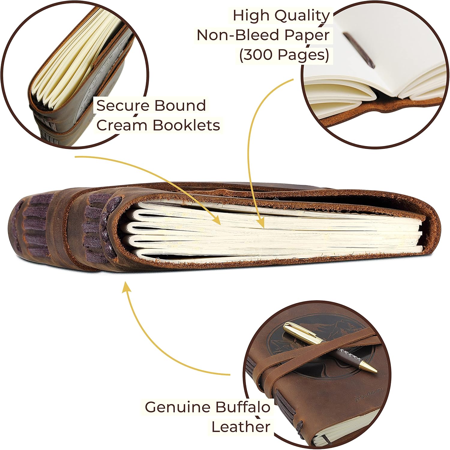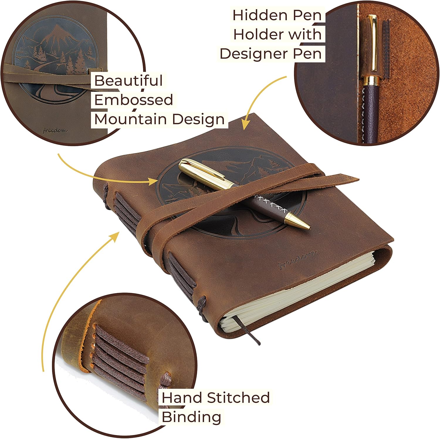 ✑ DESIGN RUSTICO con morbida copertina con motivo montuoso in rilievo realizzata in morbida vera pelle: sensazione morbida e delicata ma super resistente con un meraviglioso odore di vecchia pelle. Aspetto invecchiato e rivestito con oli speciali in modo che i segni svaniscano quando vengono strofinati. Le cuciture decorative sul dorso aggiungono fascino ✑ REGALO ELEGANTE PER SCRITTORI - Disegna, scarabocchia e fai schizzi a tuo piacimento in questo bellissimo quaderno in pelle di bufalo per mamma, papà, famiglia e amici. Scrivi subito in questo bellissimo diario rilegato in pelle marrone, poiché questo esclusivo set di diari in pelle presenta un'elegante penna, un passante portapenne nascosto e un segnalibro in iuta. ✑ Carta color crema di QUALITÀ, pagine lisce e spesse 300, senza sbavature anche con le penne. Questi diari senza tempo non sono ricaricabili: per ricordi, piani quotidiani o idee per romanzi. Il cinturino in pelle anticata circonda in modo sicuro il tuo diario retrò per tenere al sicuro appunti e pensieri. ✑ Blocco note in pelle invecchiata di dimensioni compatte, perfetto, 21x15 cm, facile da trasportare per avventure di viaggio, a casa, all'università o al lavoro. La classica confezione regalo rende il vecchio diario un regalo ideale per compleanno, Natale, laurea, fidanzamento o matrimonio. ✑ SODDISFAZIONE Garantita Nell'improbabile caso in cui non ami completamente il tuo album da disegno, hai fino a un anno per richiedere un rimborso completo o una sostituzione gratuita. Quindi il tuo acquisto aiuterà le famiglie in Africa, poiché doneremo una percentuale dei nostri profitti in beneficenza
