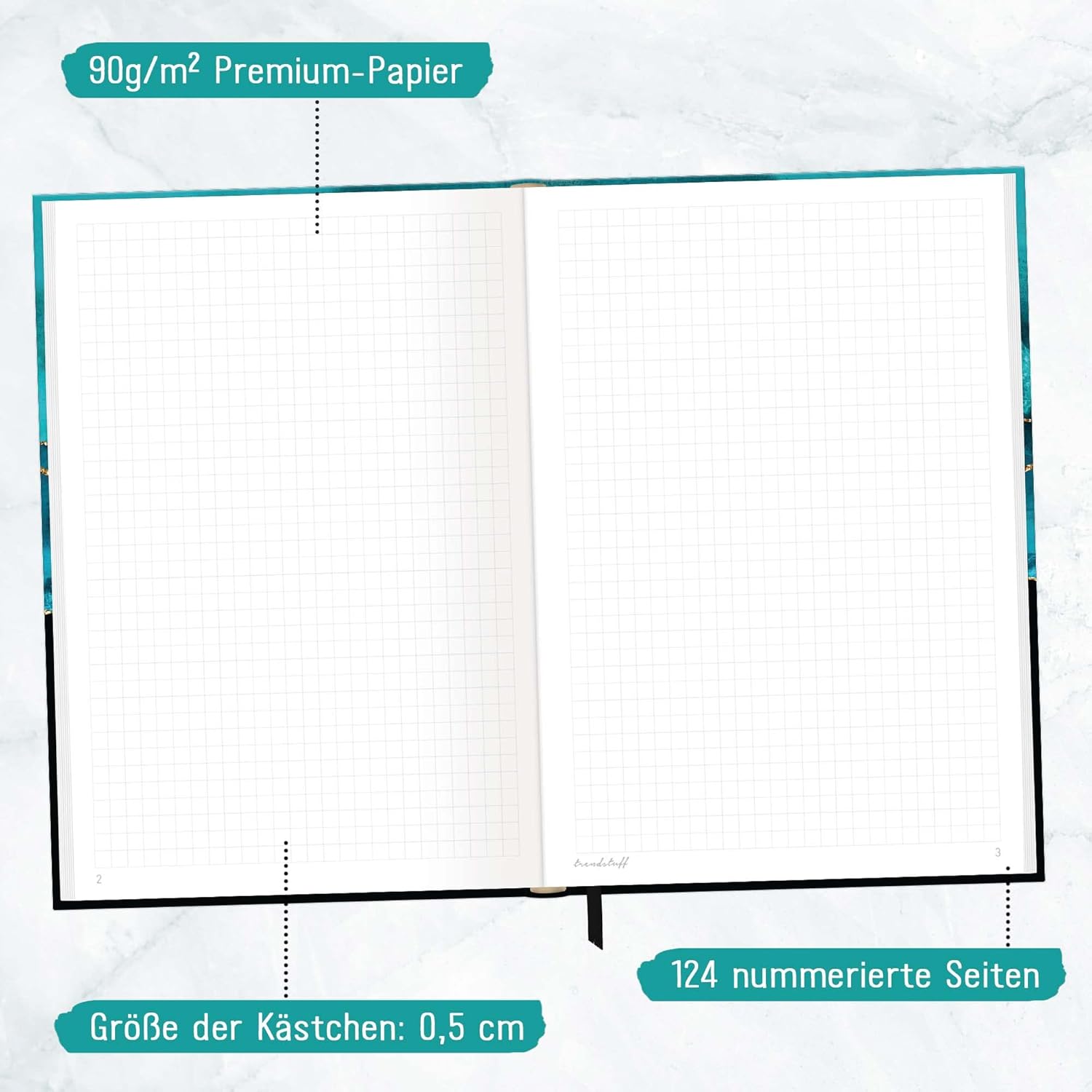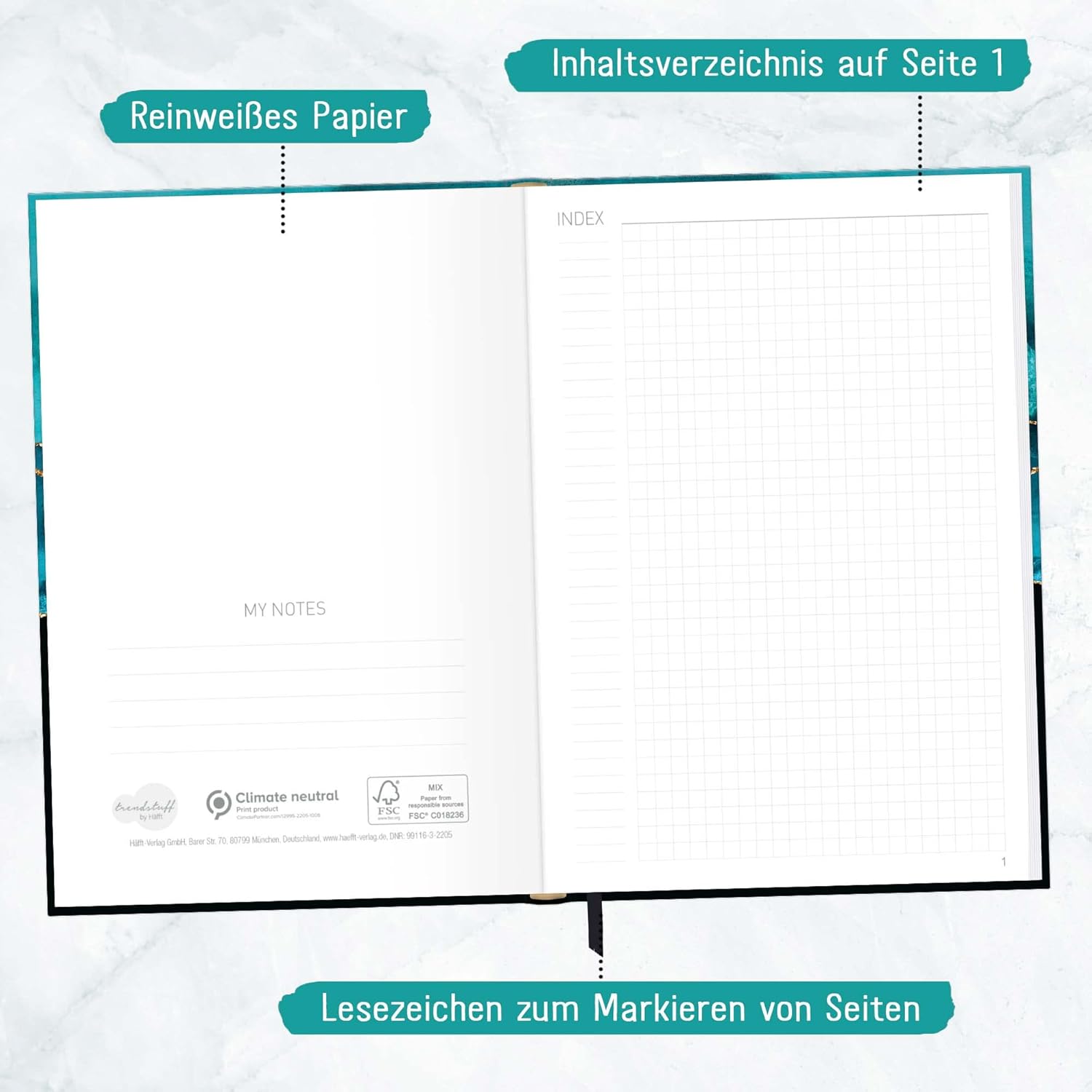 Elegante taccuino con nastro da lettura per uso universale: come diario, per obiettivi, schizzi, piani e pensieri, come diario o per bullet journaling - sempre con te e a portata di mano quando annuncia il turchese brillante! Un compagno fedele: la copertina flexo flessibile ma stabile unisce le migliori caratteristiche della copertina rigida e della copertina morbida, è inoltre resistente agli schizzi e cancellabile. La rilegatura cucita intricata e robusta impedisce che le pagine si strappino. Una carta che promuove il buon uso delle foreste: la nostra carta Premium da 90 g/m² è certificata FSC (FSC N004440). Per fare un confronto, la carta standard ha solitamente uno spessore di soli 70 g/m². Carta e penna piuttosto che smartphone: scrivere a mano i tuoi pensieri, sentimenti, idee o obiettivi può aiutarti ad essere più chiaro e ad avere più successo! Pratico quaderno formato: DIN A5 (15 x 21 x 1 cm), righe: a quadretti, pagine: 124