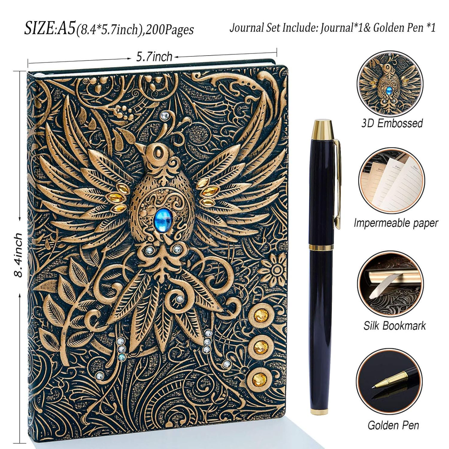 Quaderno vintage in pelle goffrata 3D con penna dorata, A5, vecchio diario Quaderno da viaggio foderato in pelle vintage Blocco note Blocco note fatto a mano