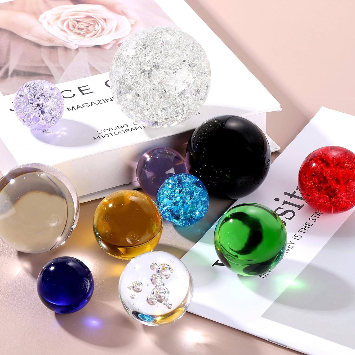 Sfera di cristallo: questa sfera di cristallo ha un diametro di 40 mm/1,6" e un design in vetro con fessura del ghiaccio, si prega di notare che una sfera decorativa solida non viene fornita con un supporto. Materiale di qualità: la sfera di cristallo è realizzata in vetro con una superficie liscia, che la rende resistente e visivamente accattivante, aumentandone il valore decorativo. Sfera di cristallo decorativa: le crepe interne del ghiaccio sono tutte diverse, quindi ogni sfera è unica e il design chiaro e trasparente della sfera consente alla luce di riflettere e rifrangere, creando uno spettacolo dinamico e affascinante. e crea un effetto sorprendente Ottima decorazione: posiziona la sfera di cristallo su una superficie piana o in un supporto decorativo per mostrare la sua bellezza, adatta come regalo ad amici e familiari, questa è la scelta perfetta per te quando scegli i regali Ampia applicazione: questa sfera di vetro solida è perfetta per oggetti di scena fotografici, composizioni decorative, divinazione, predizione del futuro, decorazione a cascata con fontana da tavolo e altro ancora, aggiungendo sapore alle tue creazioni artistiche un tocco mistico