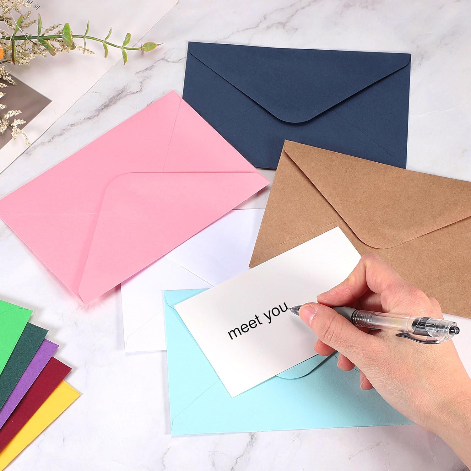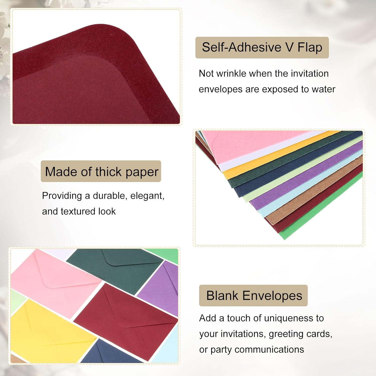 Confezione e dimensioni: Riceverai 50 buste con dimensioni 15,8 x 10,8 cm / 6 x 4 pollici. Possono contenere facilmente documenti fino a 4 x 6 pollici, adatte per foto, lettere, posta, corrispondenza personale o inviti, ecc. Materiale cartaceo: Le buste per cartoline sono realizzate in carta spessa con design a lembo a V, che conferisce un aspetto resistente, elegante e testurato. Una buona scelta di buste riflette il tuo stile elegante e raffinato. Lembo a V autoadesivo: Le buste per cartoline di auguri presentano una striscia autoadesiva che si attiva con l'acqua e si sigilla facilmente senza bisogno di colla o nastro aggiuntivi, rendendo più efficiente la preparazione e l'invio delle cartoline. Le buste non si sgualciscono se esposte all'umidità. Creatività fai-da-te: Queste buste bianche possono diventare un progetto creativo: puoi stampare, disegnare o scrivere parole a tuo piacimento sulla busta per adattarla al tema. Aggiungi un tocco di originalità ai tuoi inviti, cartoline di auguri o comunicazioni aziendali. Ampia applicabilità: Le nostre buste per inviti sono la scelta ideale per numerose occasioni, tra cui matrimoni, compleanni, feste di laurea, Natale, Ringraziamento, celebrazioni, anniversari, appunti, comunicazioni commerciali e qualsiasi altro utilizzo tu desideri.