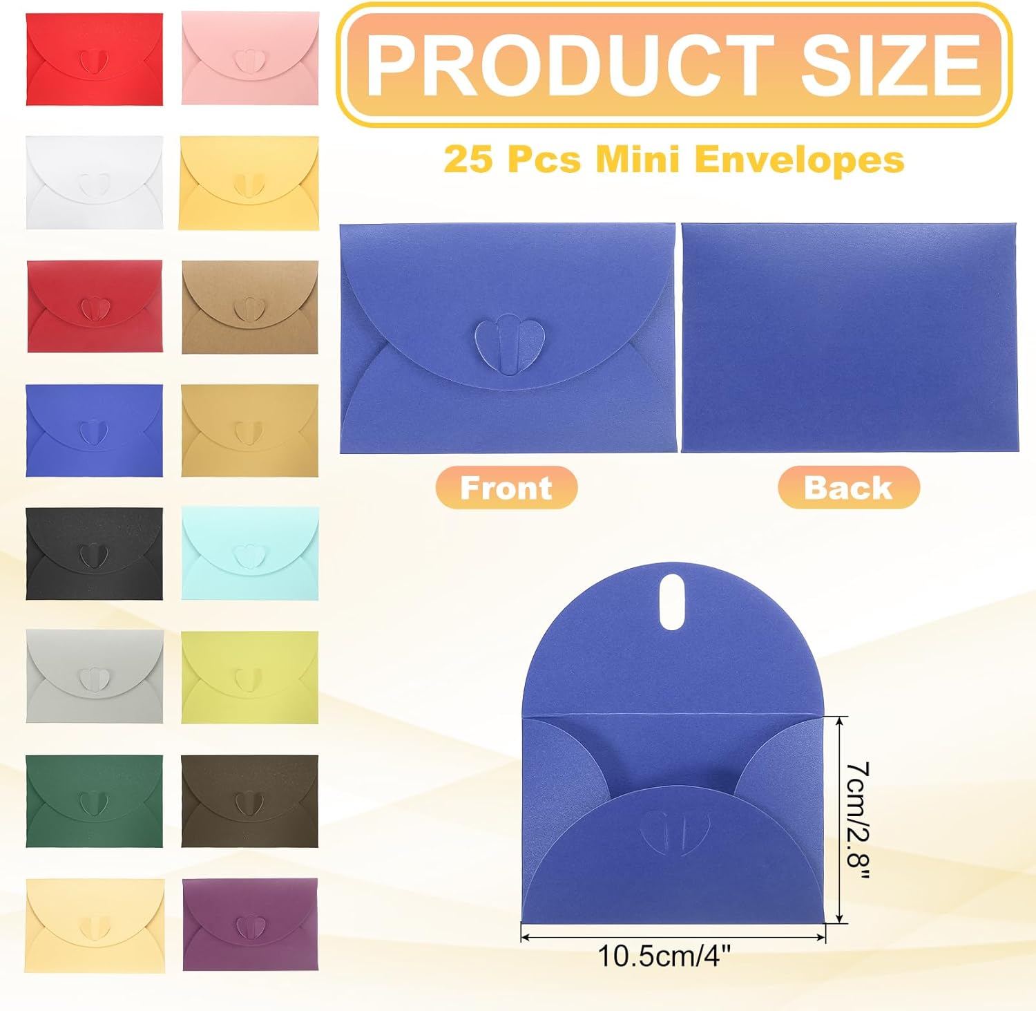 Confezione e Misure: 25 buste (10,5 x 7 cm / 4 x 2,8 pollici). Adatte a foto, lettere, inviti personali e altro. Materiale Cartaceo: Buste in carta spessa, liscia e resistente, con texture elegante e chiusura a cuore per un tocco di raffinatezza. Facili da usare: inserisci la cartolina, piega lungo le pieghe e chiudi con la chiusura a cuore. Senza bisogno di colla o nastro, rende l’invio più efficiente. Creatività Fai da Te: Usare buste bianche è un processo creativo. Puoi stampare, disegnare o scrivere parole a piacere per adattarle al tema, aggiungendo unicità a inviti, biglietti o comunicazioni aziendali. Ampia Utilizzo: Le nostre buste per inviti sono la scelta ideale per matrimoni, feste di compleanno, lauree, Natale, Ringraziamento, celebrazioni, anniversari, appunti, uso aziendale e qualsiasi altro scopo.