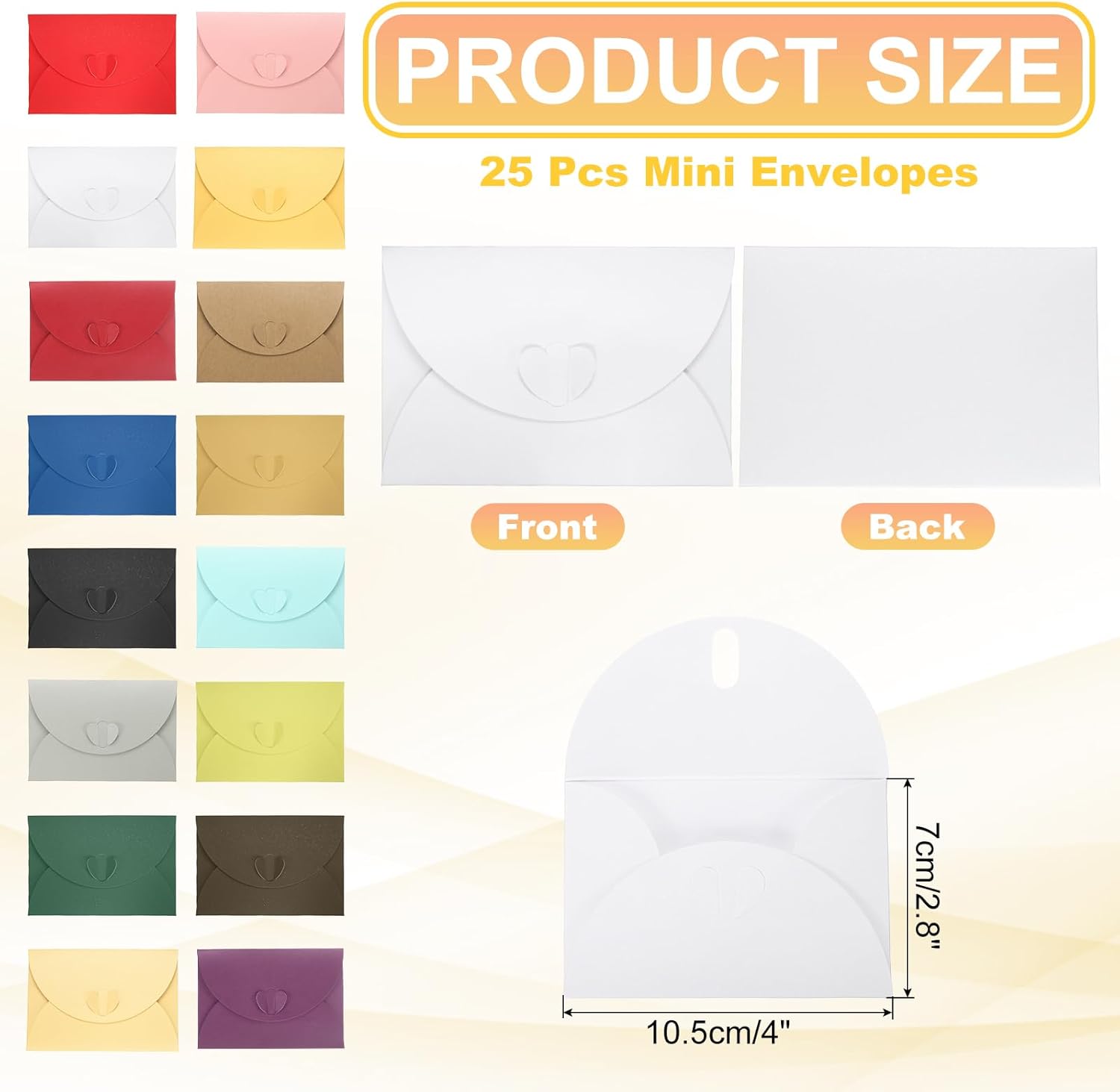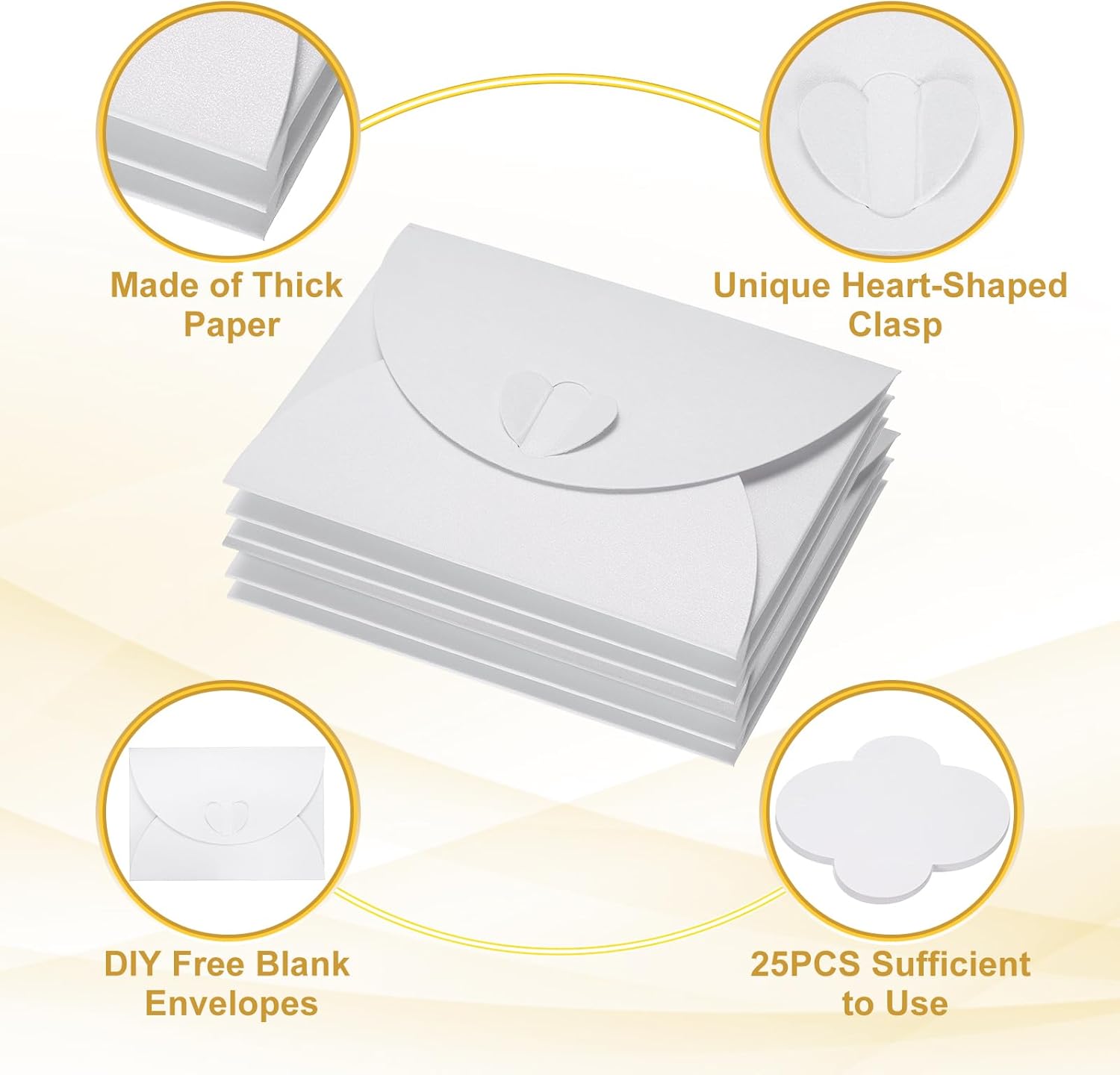 Confezione e Dimensioni: Riceverai 25 buste con dimensioni 10,5 x 7 cm / 4 x 2,8 pollici (L*P). Possono contenere facilmente oggetti cartacei fino a 4 x 2,8 pollici, adatte per foto, lettere, posta, inviti personali, ecc. Materiale Cartaceo: Le buste per cartoline sono realizzate in carta spessa con una texture fine, liscia per scrivere e resistente alla rottura. Offrono un aspetto duraturo, elegante e testurizzato. Con il design a chiusura a cuore, queste buste sono una scelta raffinata che mostra eleganza e raffinatezza. Facili da usare: inserisci la cartolina nella busta, piega la carta lungo le pieghe predisposte e chiudi con la chiusura a forma di cuore. Non è necessaria colla o nastro adesivo aggiuntivo, rendendo la preparazione e l’invio di biglietti d'auguri più efficiente. Creatività fai-da-te: Utilizzare buste bianche può essere un processo creativo. Puoi stampare, disegnare o scrivere parole a tuo piacimento sulla busta per abbinarla al tema. Questo aggiunge un tocco di unicità ai tuoi inviti, biglietti d'auguri o comunicazioni aziendali. Ampia Applicazione: Le nostre buste per inviti sono la scelta ideale per molte occasioni, tra cui matrimoni, feste di compleanno, lauree, Natale, Ringraziamento, celebrazioni, anniversari, appunti, affari e qualsiasi altra esigenza.