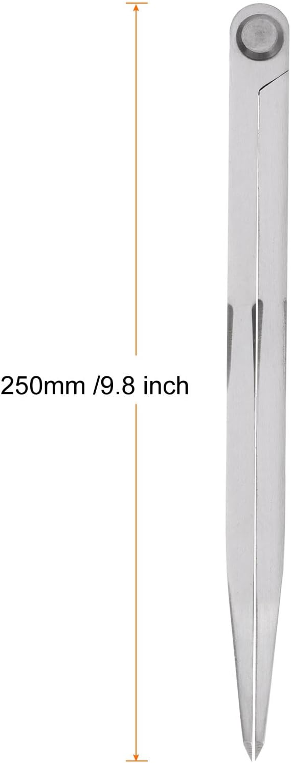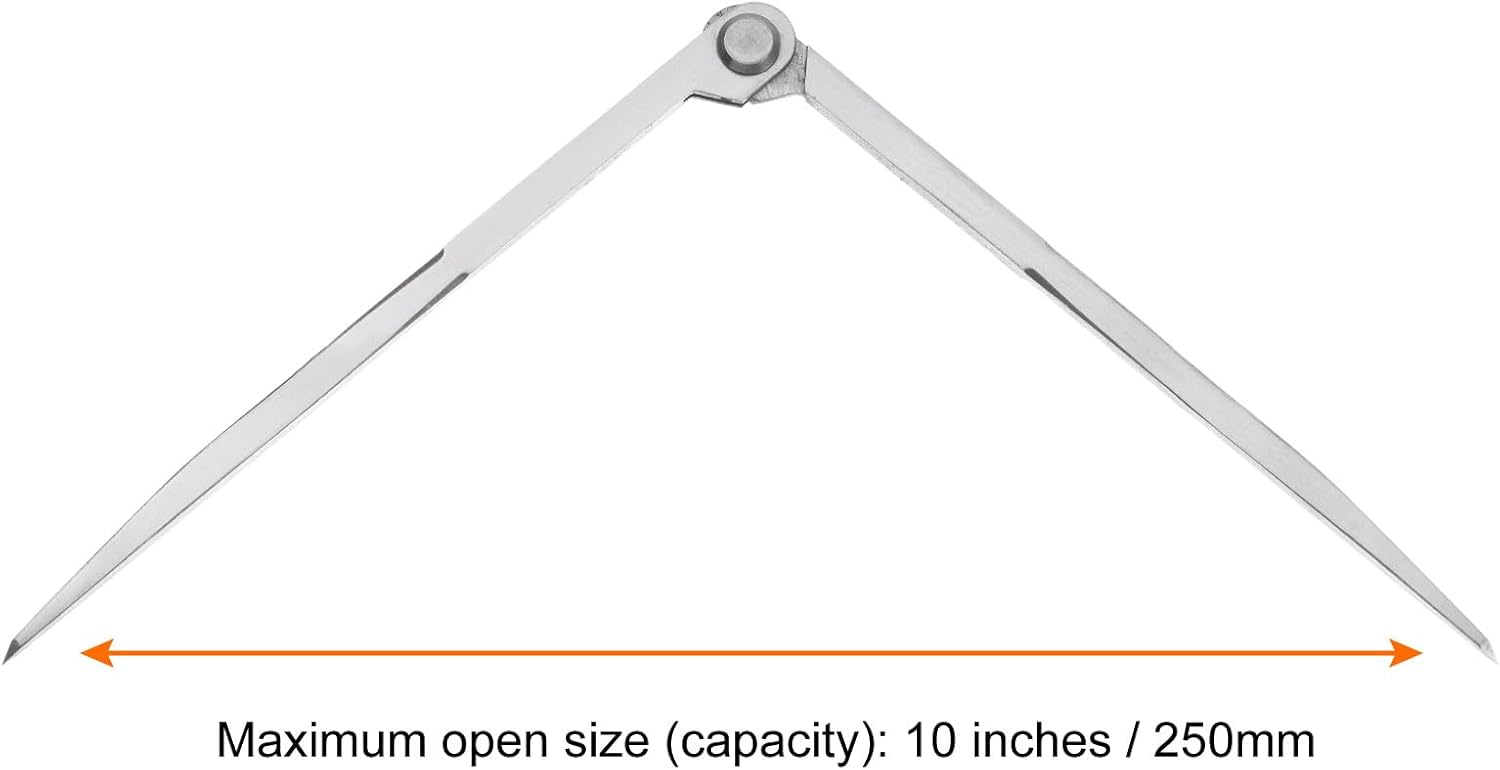 Dimensioni: bussola di navigazione in metallo 250 mm di lunghezza x 20 mm di larghezza x 14 mm di altezza con una lunghezza di apertura massima (capacità) di 10 pollici/250 mm. Materiale: la bussola per carpenteria di precisione è forgiata in acciaio al carbonio, con trattamento termico complessivo, resistenza all'usura, durata e lunga durata. Caratteristica: le aste forgiate in acciaio al carbonio di alta qualità sono dotate di punte temprate per una marcatura precisa del pezzo e una messa a punto precisa semplicemente aprendo o chiudendo l'asta. Applicazione: la bussola è un utile strumento di trasferimento delle misurazioni per misurare la dimensione interna di parti rotonde o oggetti di forma irregolare. Ottimo anche per disegnare cerchi su metallo, linee di divisione, disegnare archi, segmenti di linea, disegni geometrici, ecc. Utilizzo: superficie liscia, misurazione accurata, può essere utilizzato a lungo e non è facile da allentare.