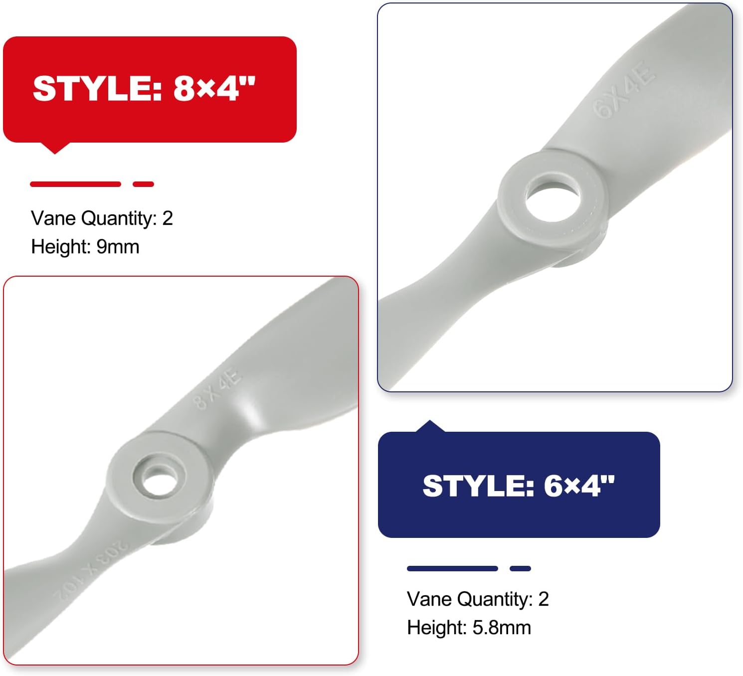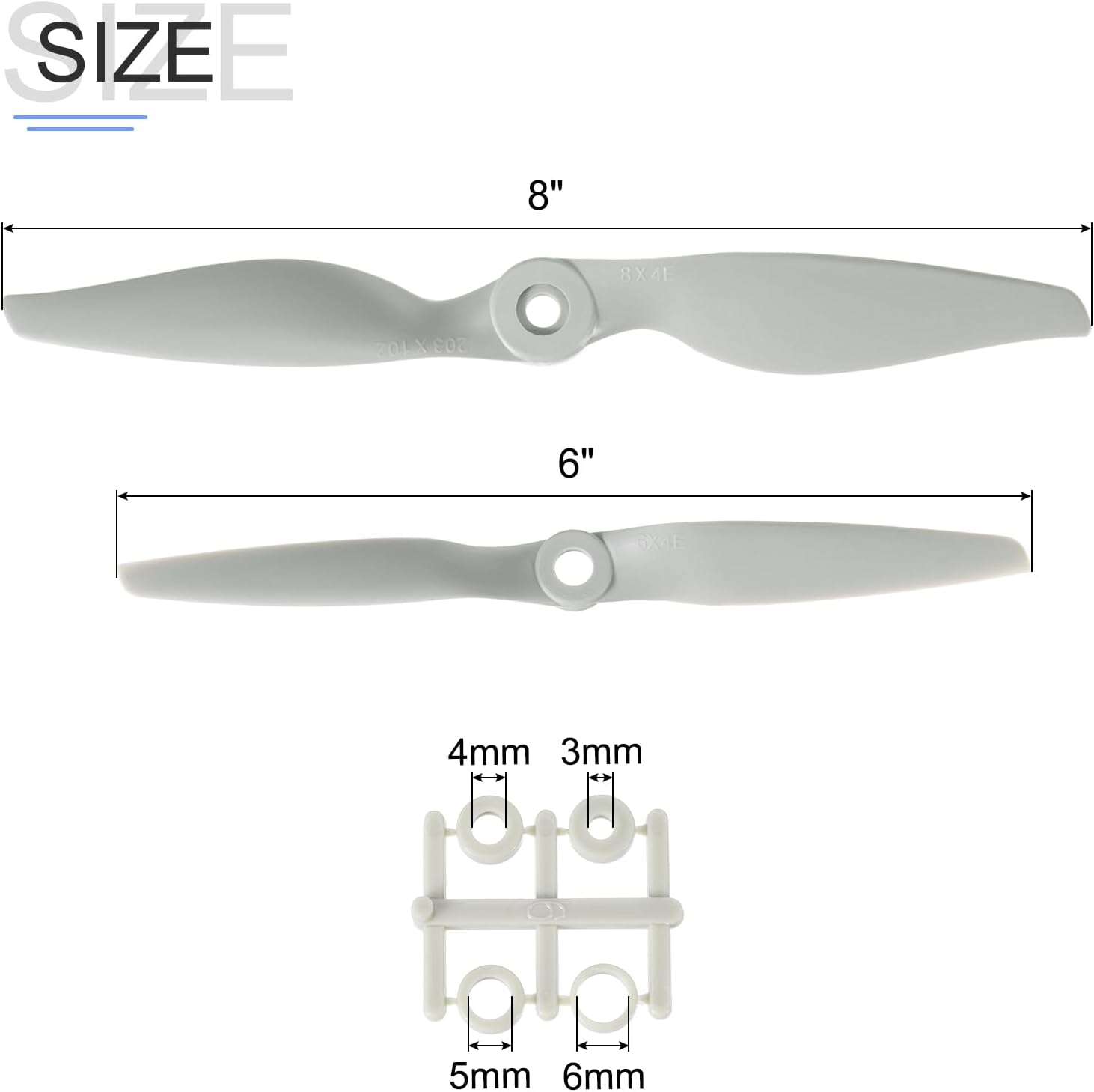 Le eliche RC vengono utilizzate su velivoli ad ala fissa, aeroplani, come eccellenti parti di ricambio per eliche. Contenuto della confezione: 4 eliche per aeroplani ad ala fissa; Quantità di palette: 2; Stile: 6x4, 8x4 pollici; Diametro dell'elica: 6,8 pollici; Altezza: 5,8/9 mm; Dimensioni rondella elica: 5,7/4,8/2,9/4,8 mm (6x4), 3,7/4,8/5,8/2,8 mm (8x4). Questa elica può trovare la dimensione e il passo migliori per il tuo aereo, è davvero facile da bilanciare, il che rende questa elica adatta al tuo aereo elettrico, ottima per il volo generale in aereo. Le eliche per aeroplani RC a 2 palette sono realizzate in materiale plastico che riduce la massa rotante per prestazioni più elevate e una maggiore durata. Si prega di controllare il diametro di rotazione e il passo prima di ordinare per assicurarsi che sia adatto al motore dell'aereo RC.