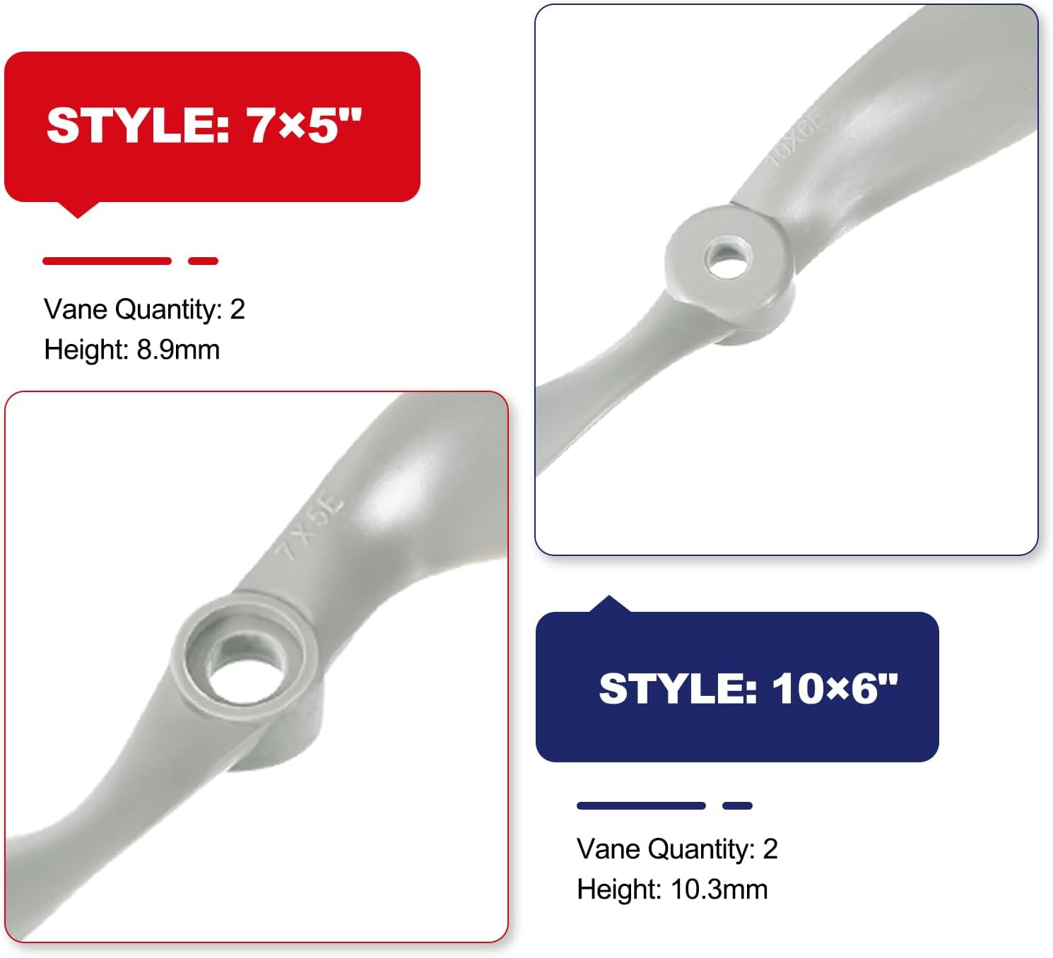 Le eliche RC vengono utilizzate su velivoli ad ala fissa, aeroplani, come eccellenti parti di ricambio per eliche. Contenuto della confezione: 4 eliche per aeroplani ad ala fissa; Quantità di palette: 2; Stile: 7x5, 10x6 pollici; Diametro dell'elica: 7,10 pollici; Altezza: 8,9/10,3 mm; Dimensioni rondella elica: 5,7/4,8/2,9/4,8 mm (7x5), 3,7/4,8/5,8/2,8 mm (10x6). Questa elica può trovare la dimensione e il passo migliori per il tuo aereo, è davvero facile da bilanciare, il che rende questa elica adatta al tuo aereo elettrico, ottima per il volo generale in aereo. Le eliche per aeroplani RC a 2 palette sono realizzate in materiale plastico che riduce la massa rotante per prestazioni più elevate e una maggiore durata. Si prega di controllare il diametro di rotazione e il passo prima di ordinare per assicurarsi che sia adatto al motore dell'aereo RC.