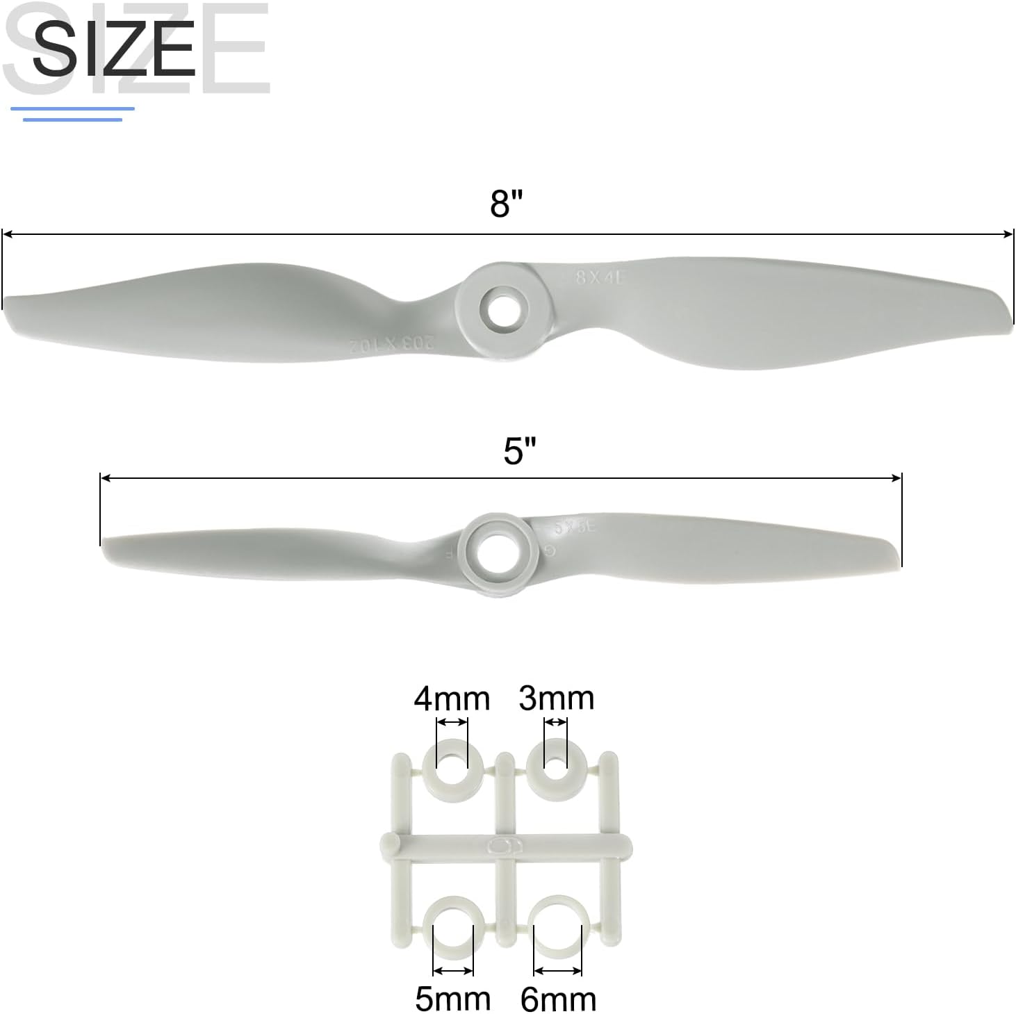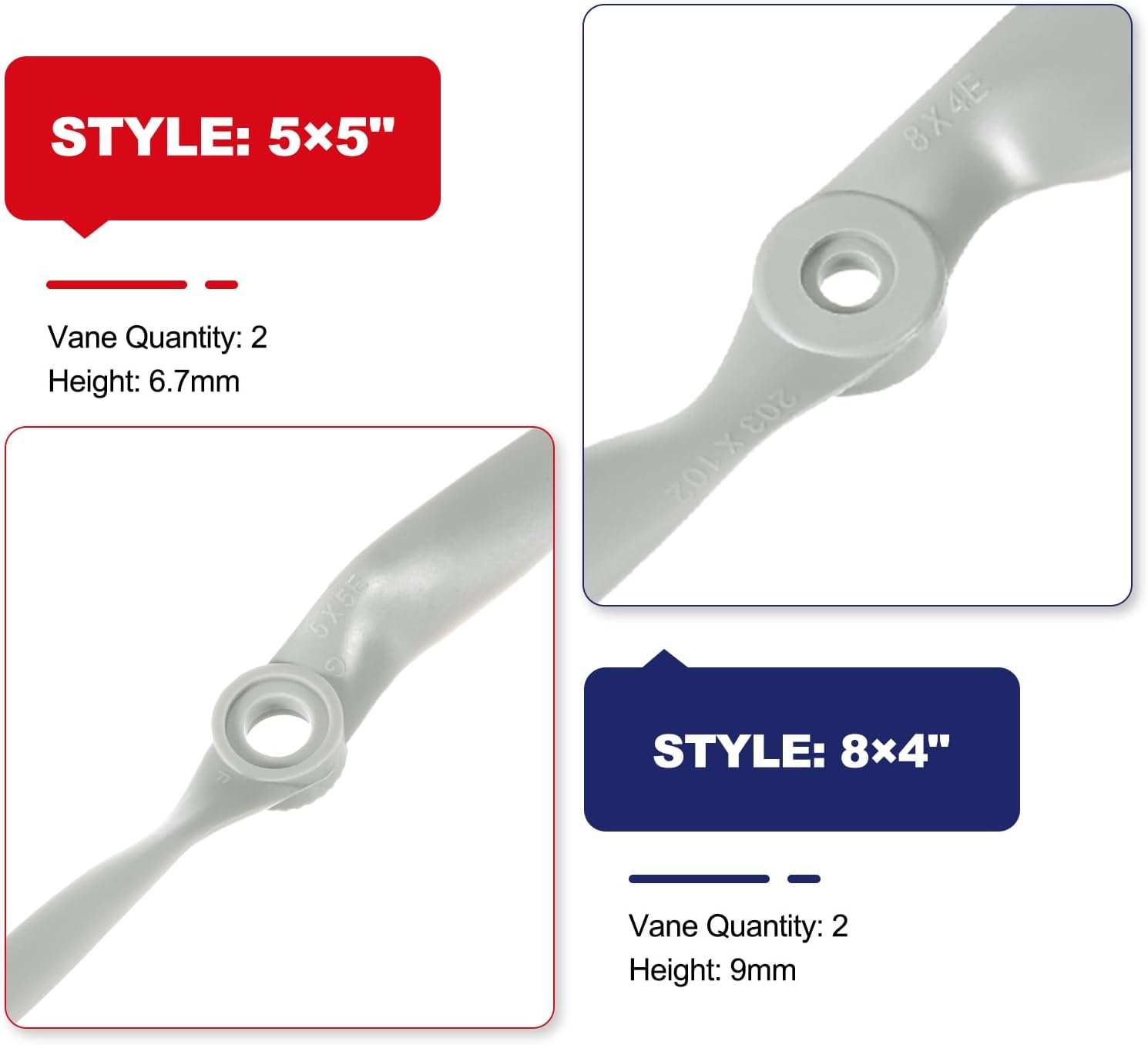 Le eliche RC vengono utilizzate su velivoli ad ala fissa, aeroplani, come eccellenti parti di ricambio per eliche. Contenuto della confezione: 4 eliche per aeroplani ad ala fissa; Quantità di palette: 2; Stile: 8x4,5x5 pollici; Diametro dell'elica: 5,8 pollici; Altezza: 6,7,9 mm; Dimensioni rondella elica: 5,7/4,8/2,9/4,8 mm (8x4), 3,7/4,8/5,8/2,8 mm (5x5) Questa elica può trovare la dimensione e il passo migliori per il tuo aereo, è davvero facile da bilanciare, il che rende questa elica adatta al tuo aereo elettrico, ottima per il volo generale dell'aereo. Le eliche per aeroplani RC a 2 palette sono realizzate in materiale plastico che riduce la massa rotante per prestazioni più elevate e una maggiore durata. Si prega di controllare il diametro di rotazione e il passo prima di ordinare per assicurarsi che sia adatto al motore dell'aereo RC.