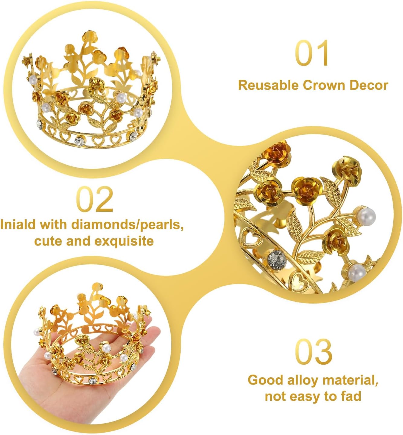 Decorazione Tiara per Torte: Riceverai 1 tiara per torta. È carina ed esquisita, ha un diametro di 8,3 / 3,3 pollici e un'altezza di 5,5 / 2,2 pollici, adatta per torte di varie dimensioni, forme e stili, portando una bellezza unica alla tua celebrazione. Lavorazione Fina: L'esquisita tiara è realizzata con materiali scintillanti in cristallo e lega, che brillano al sole e alle luci, rendendo la tua torta più attraente e mettendo in risalto il bagliore dell'ospite della festa. Facile da Usare: La tiara realizzata con materiali in lega di buona qualità è resistente, non si rompe facilmente ed è riutilizzabile, rendendo la tua festa piena di divertimento e felicità. Si adatta a vari stili di feste e soddisfa le tue diverse esigenze di decorazione. Ampia Applicazione: Le decorazioni per torte con mini corone sono adatte per compleanni, matrimoni, feste di gala e a tema principesse. Puoi mettere una tiara sulla torta per aggiungere il suo fascino, attirare l'attenzione e lasciare un'impressione profonda sugli altri. Puoi anche indossare la tiara come copricapo sulla testa del piccolo ospite della festa. Regali per Principesse e Regine: Queste belle mini corone per torte sono ottimi accessori e decorazioni per torte, perfette per creare sorprese per le membri femminili della famiglia e la fidanzata in occasioni importanti come compleanni, Natale, Capodanno, anniversari, ecc.