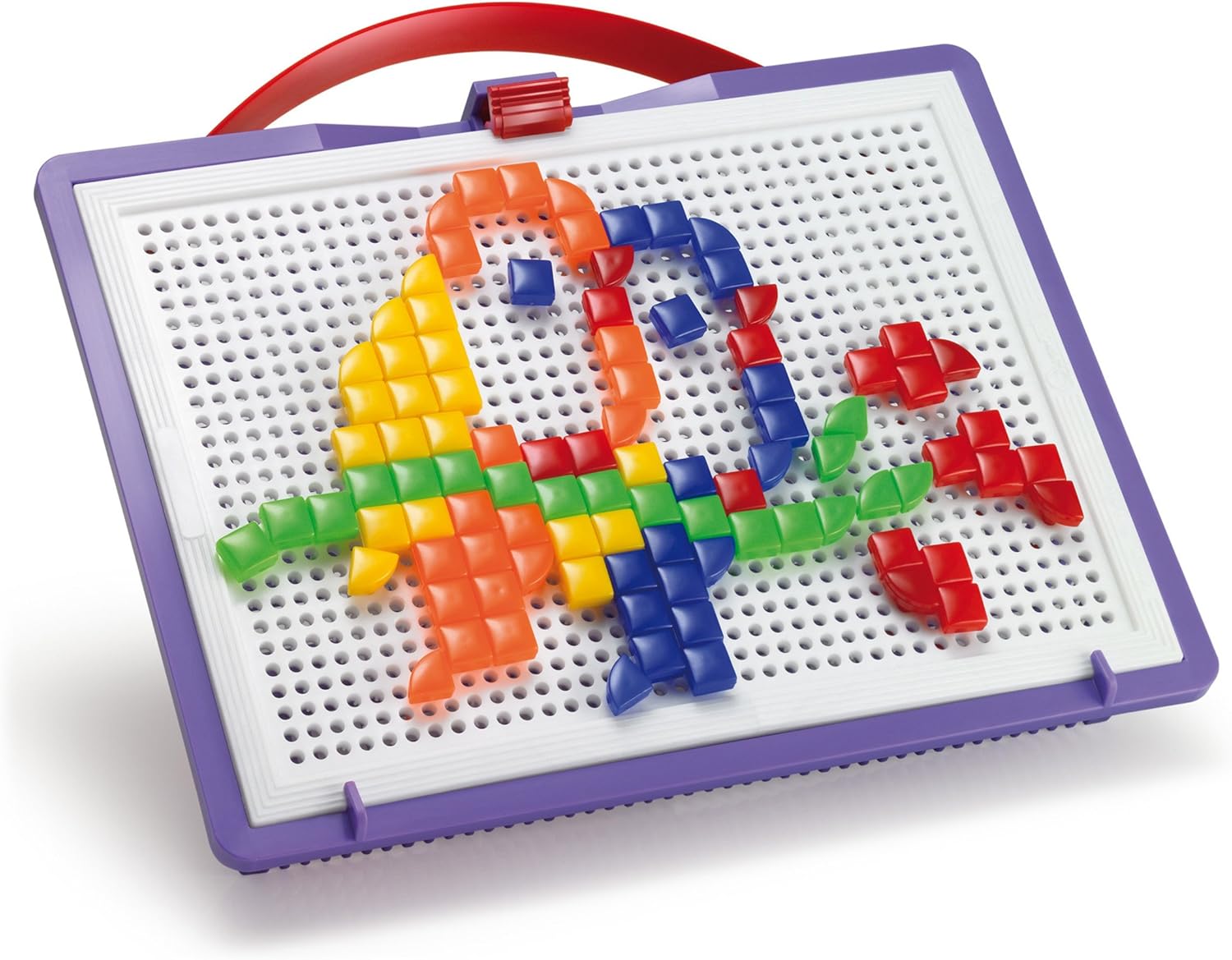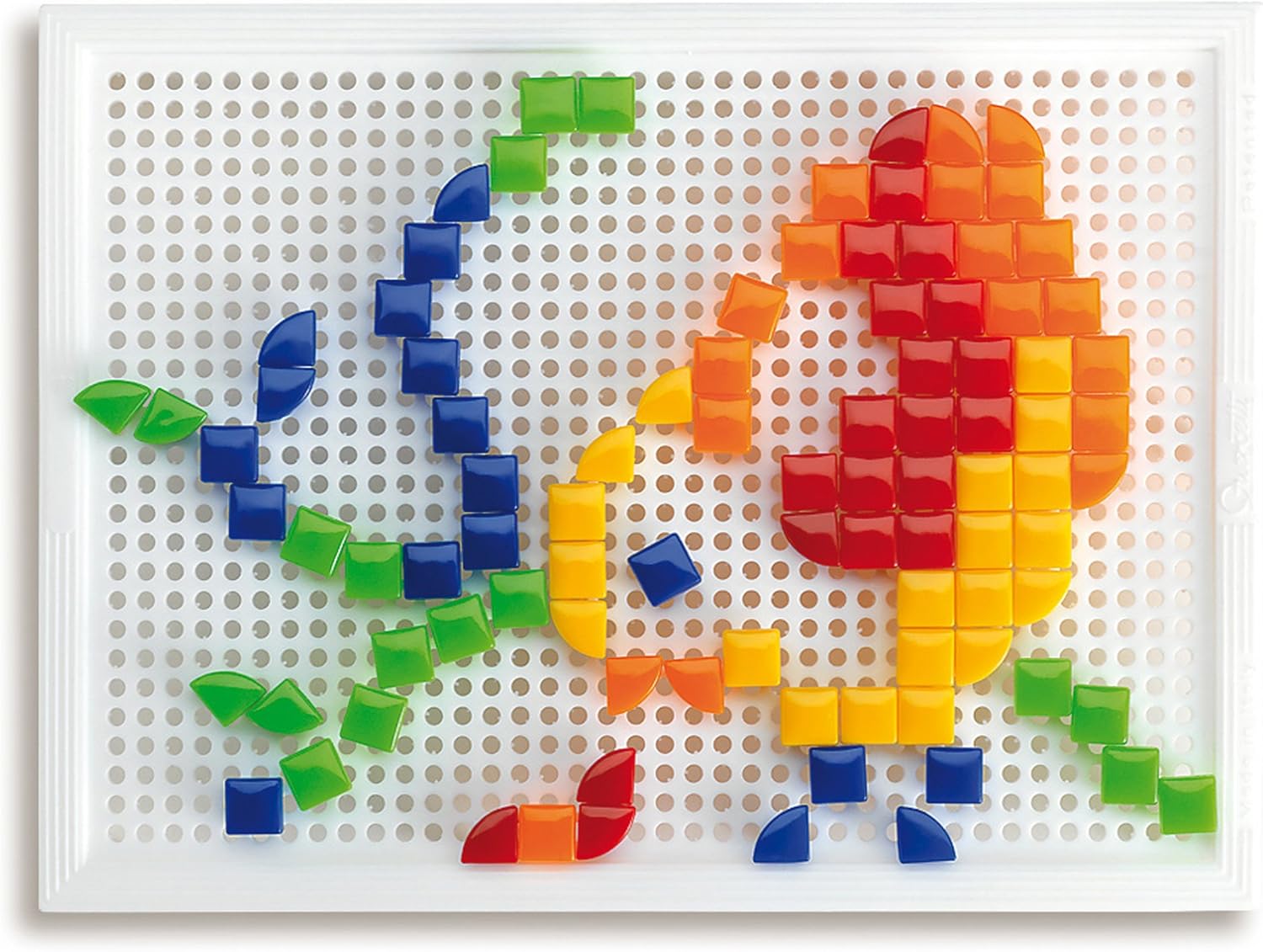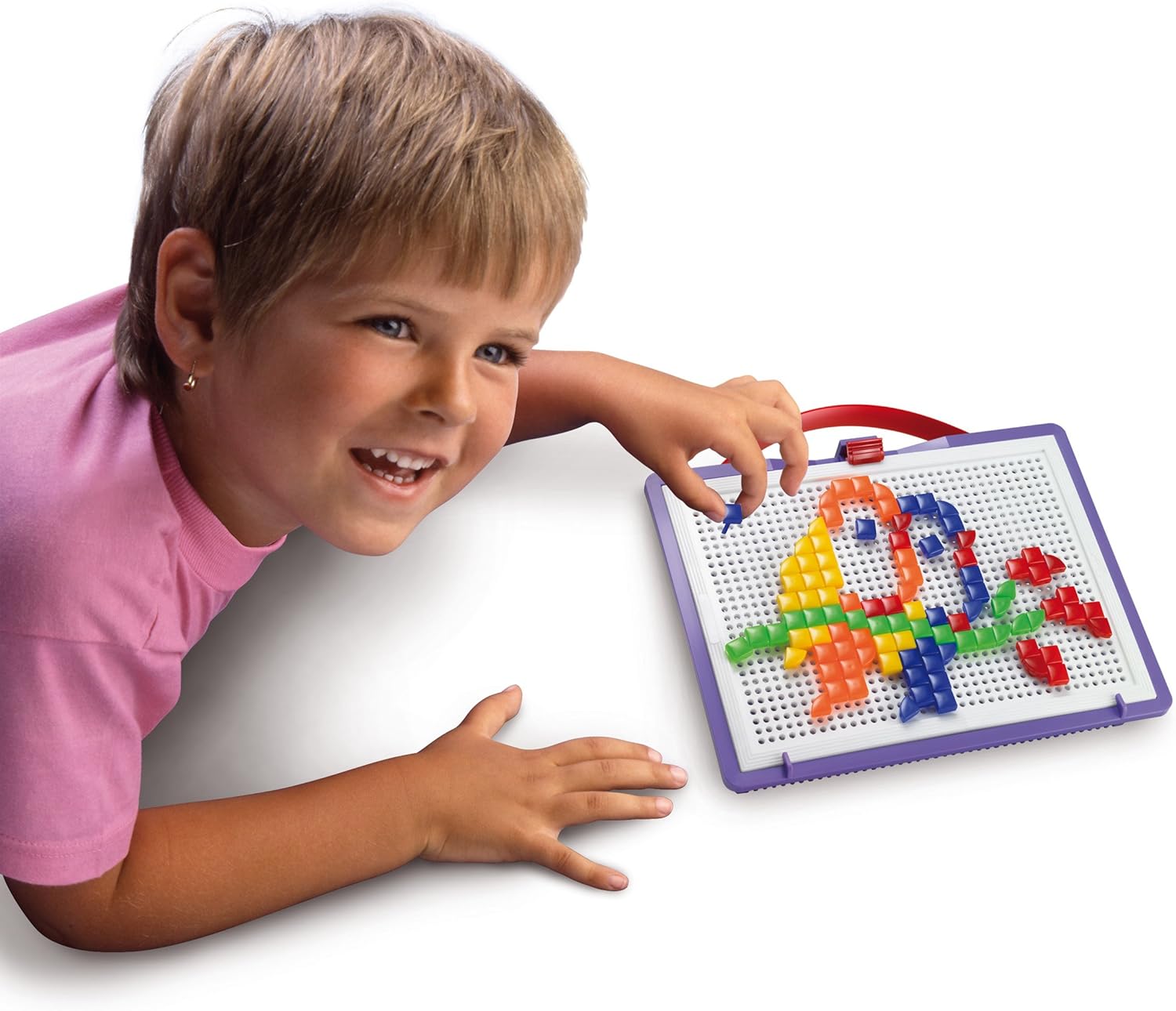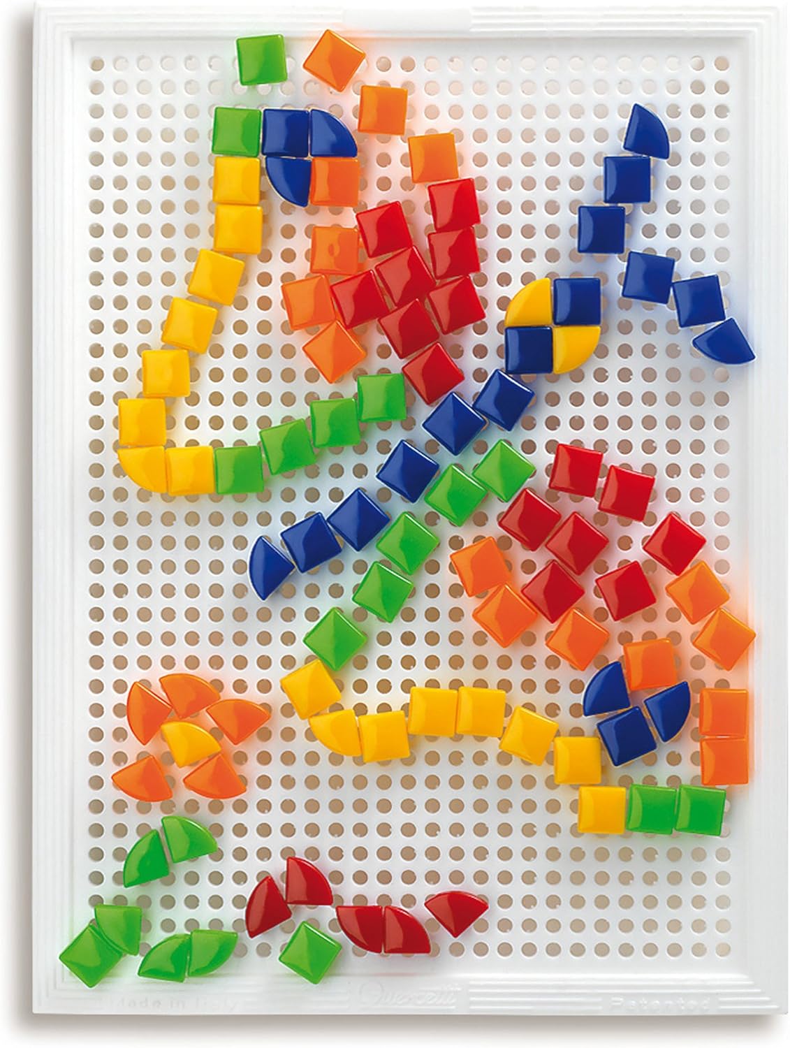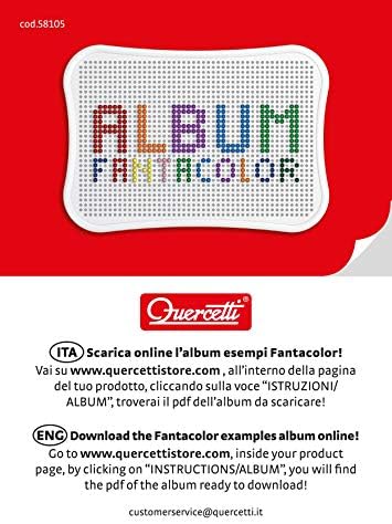 I mitici chiodini Quercetti con cui riprodurre colorati mosaici e disegni Attività divertente, creativa ed educativa, che stimola la sensibilità cromatica, addestra la coordinazione occhio-mano e sviluppa le capacità manipolative Finito di giocare, i chiodini si ripongono nel comodo cestello contenitore Tavoletta rettangolare Small e cestino con chiodini quadrati diametro 10mm e 5 colori Album degli esempi disponibile sul sito ufficiale Quercetti, pagina del prodotto 924 Fantacolor 100% Made in Italy
