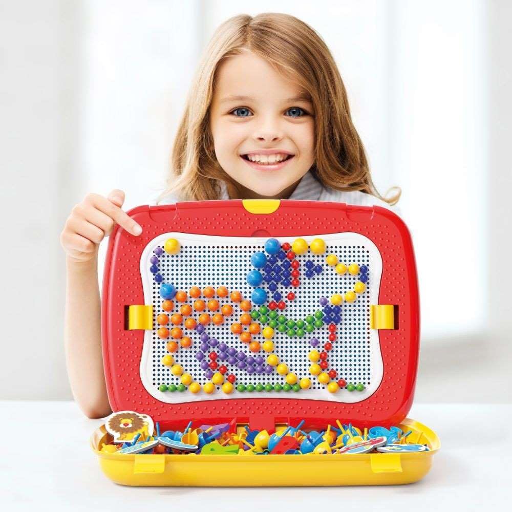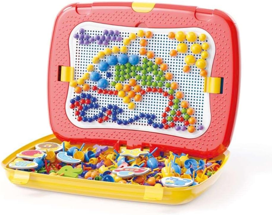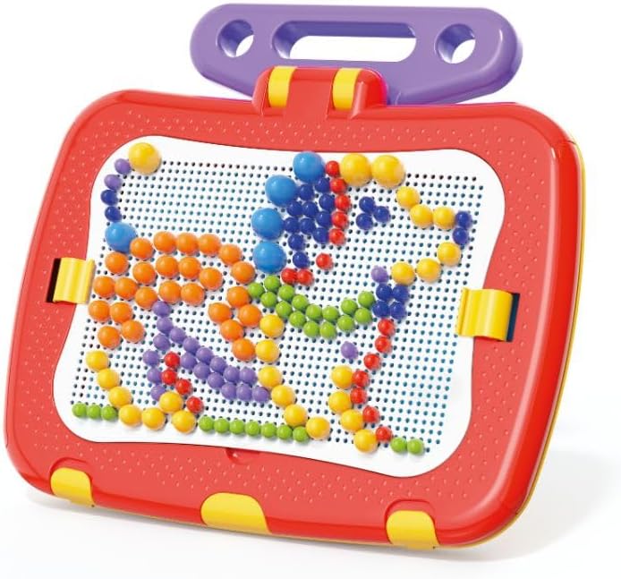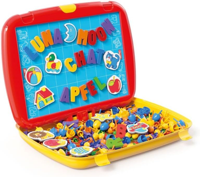 Due giochi in un'unica grande valigetta multifunzione, da una parte impari a leggere e contare con lettere e numeri magnetici, dall'altra ti diverti a disegnare con i chiodini colorati La tavoletta si alza e si abbassa, si sfila e si ribalta con semplici movimenti intuitivi, il tutto facile da trasportare grazie alla manigliona Contiene 300 chiodini (diametro 10,15,20) in 6 colori, 48 lettere magnetiche, 12 tessere magnetiche, 1 tavoletta traforata Prodotta nuova versione della valigetta; giocattolo che stimola la fantasia ed apprendimento 100% made in italy