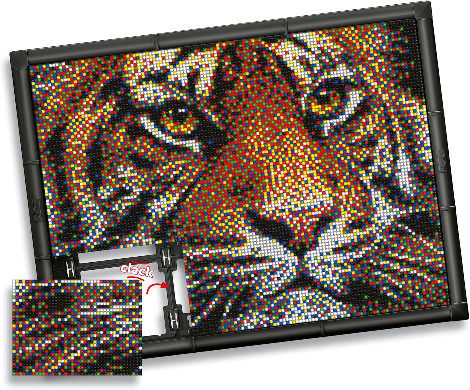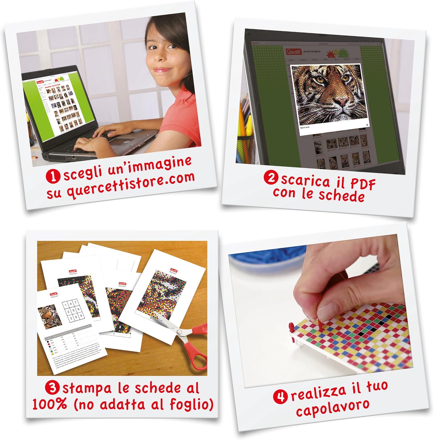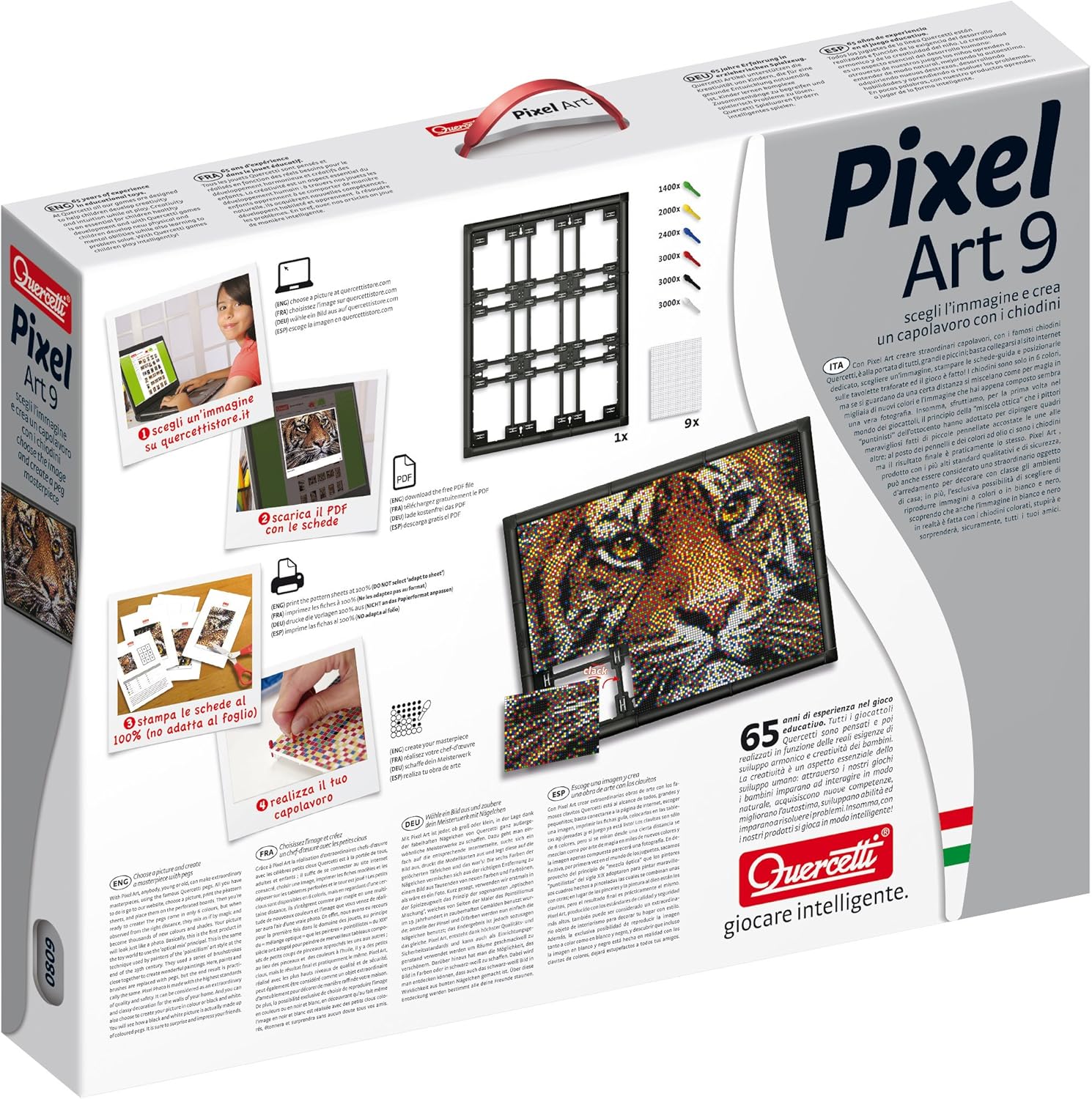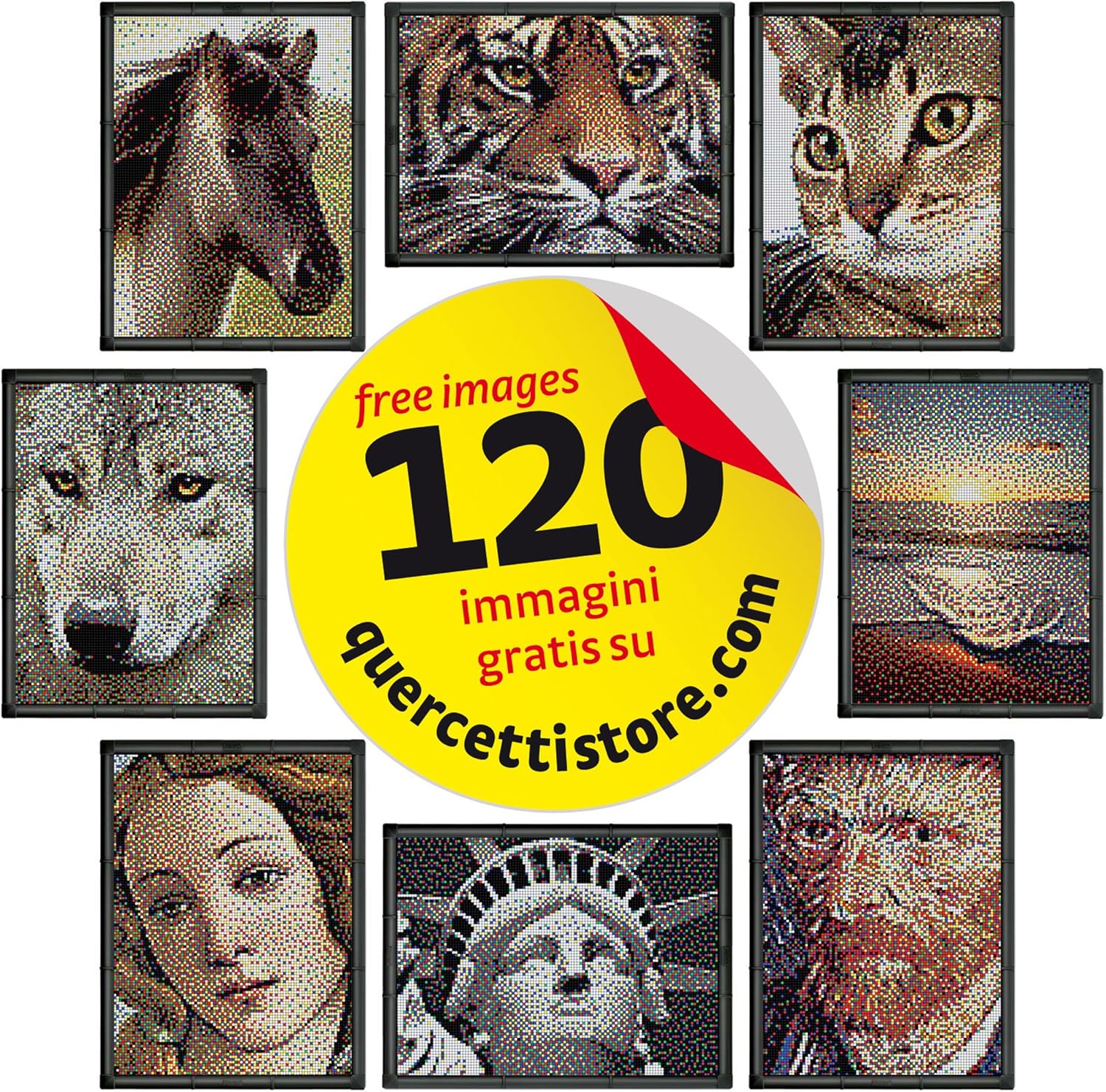 Versione 2.0 Spina Quercetti, gioco per grandi e piccini! Scegli l'immagine dal catalogo Pixel Art Gallery, premi le schede guida per le piastre forate e inserisci i tasselli Versione 9 piastre forate, una cornice e tanti tasselli diametro 4mm Tappi 6 colori ma quando lo vedi da lontano sembra un quadro vero. 100% prodotto in Italia