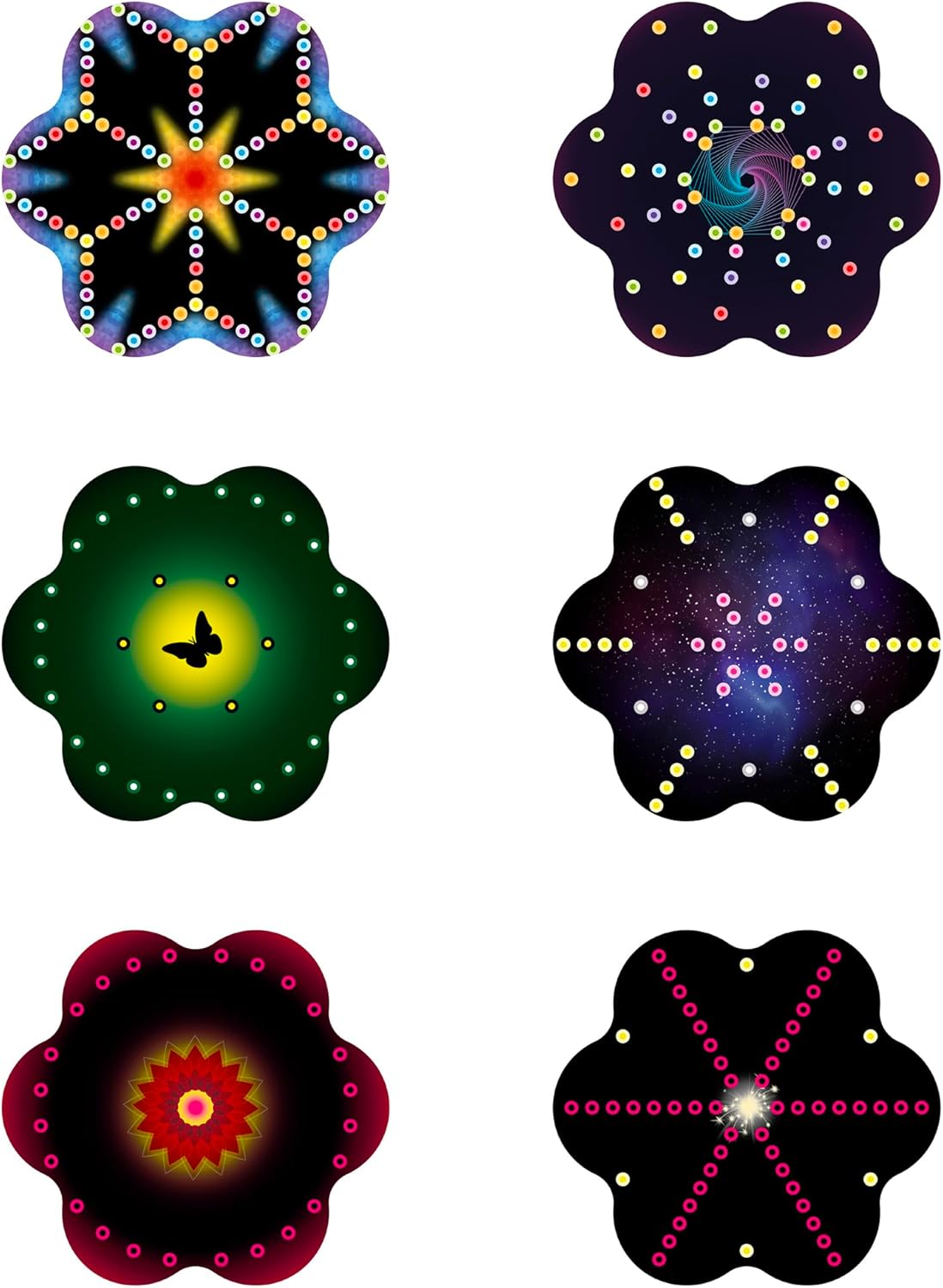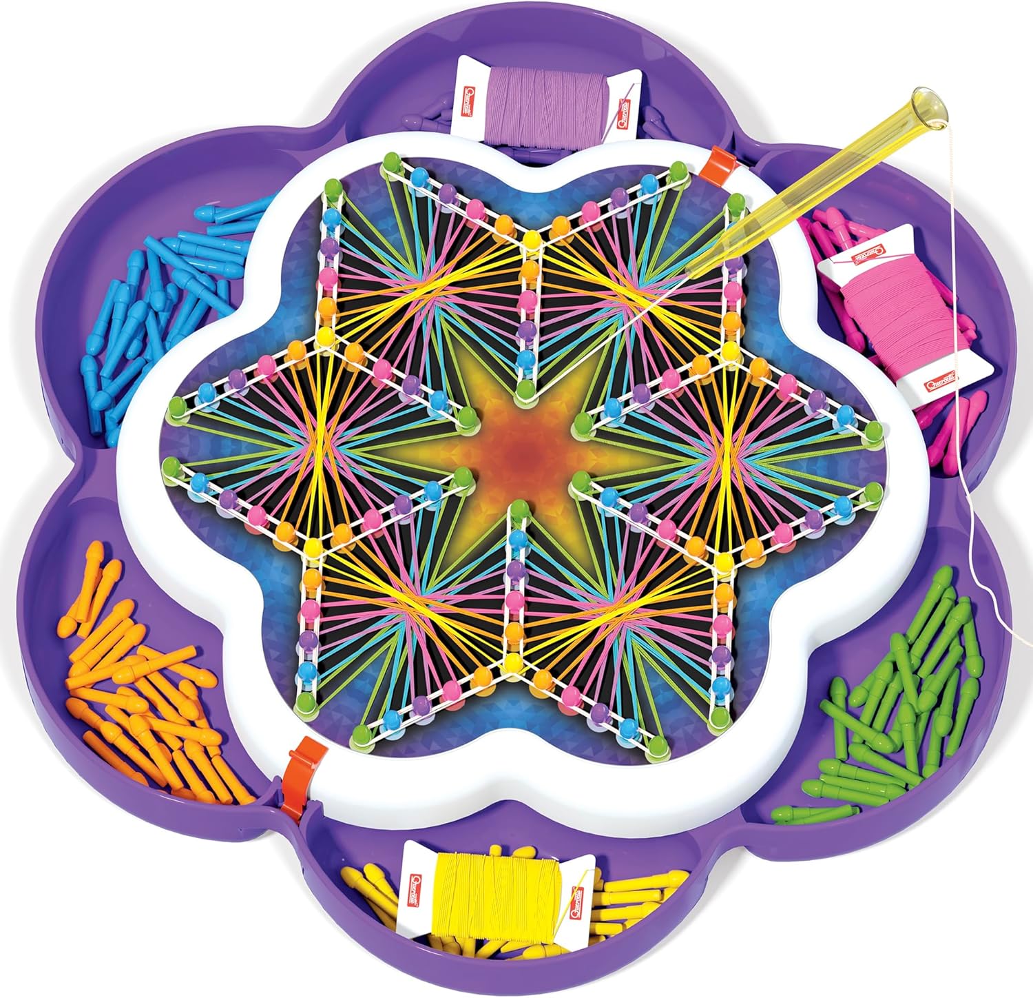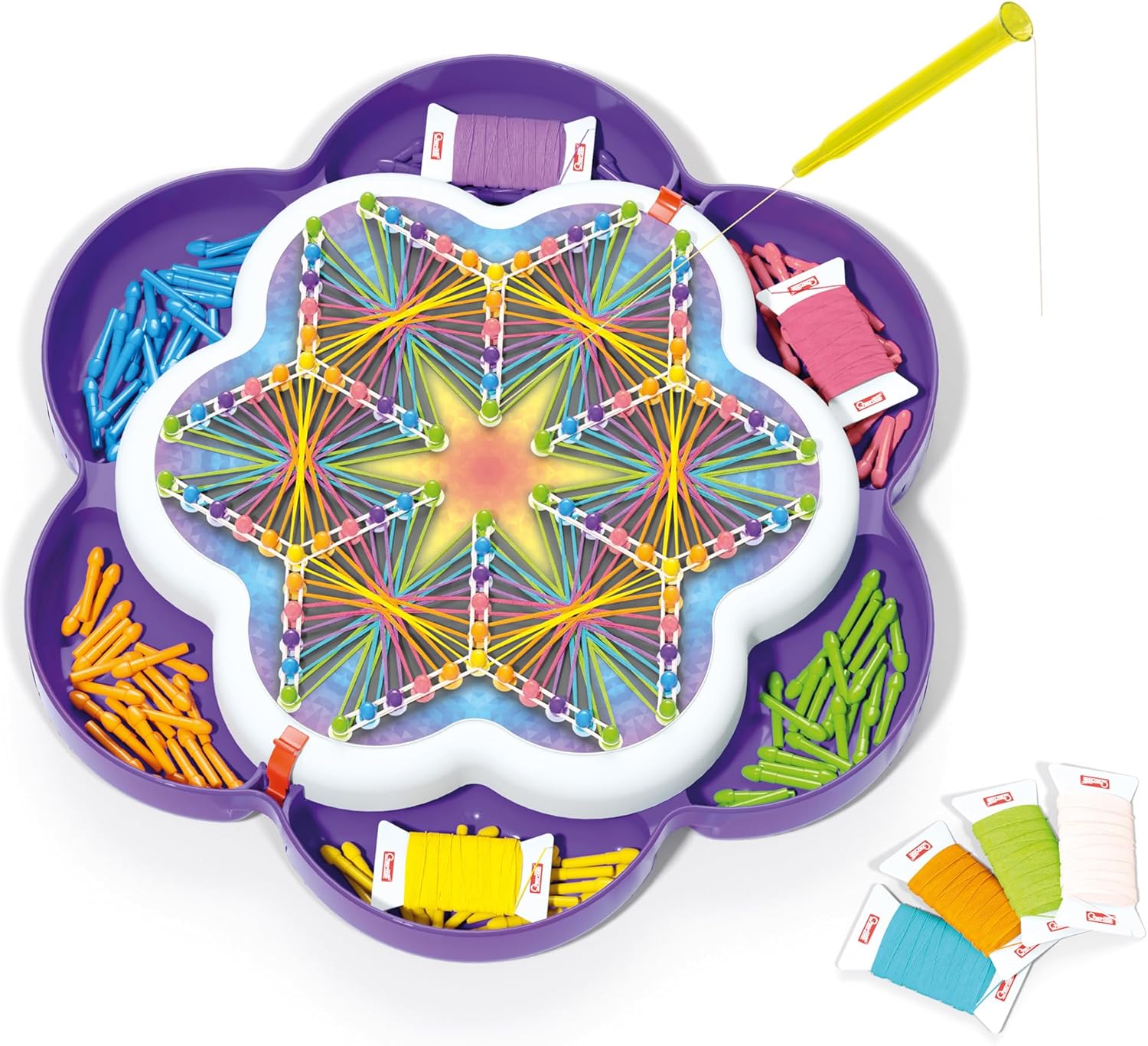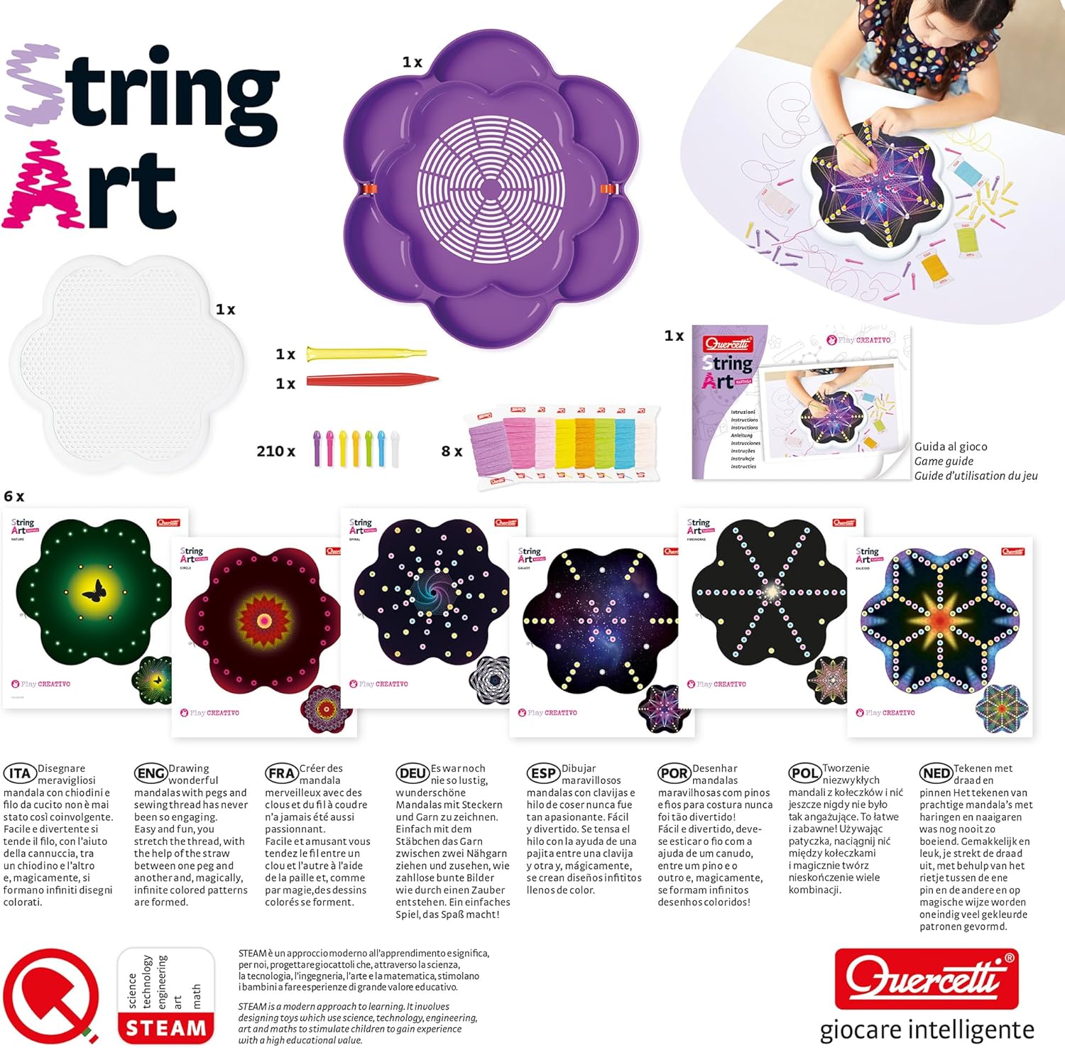 Facile e divertente, fai passare i fili colorati intorno ai chiodini, per creare bellissimi Mandala con String Art Appoggia la scheda alla tavoletta, inserisci i chiodini ed intreccia i fili tra un chiodino e l'altro Disegna il tuo Mandala seguendo le 6 schede guida oppure lasciando libero spazio alla fantasia Adatto per i bambini a partire dai 5 anni Sviluppa la motricità fine, lo sviluppo della manualità, la coordinazione oculo-manuale e il pensiero creativo
