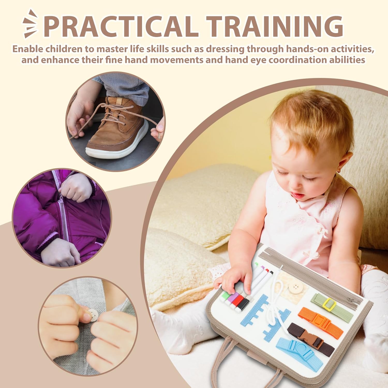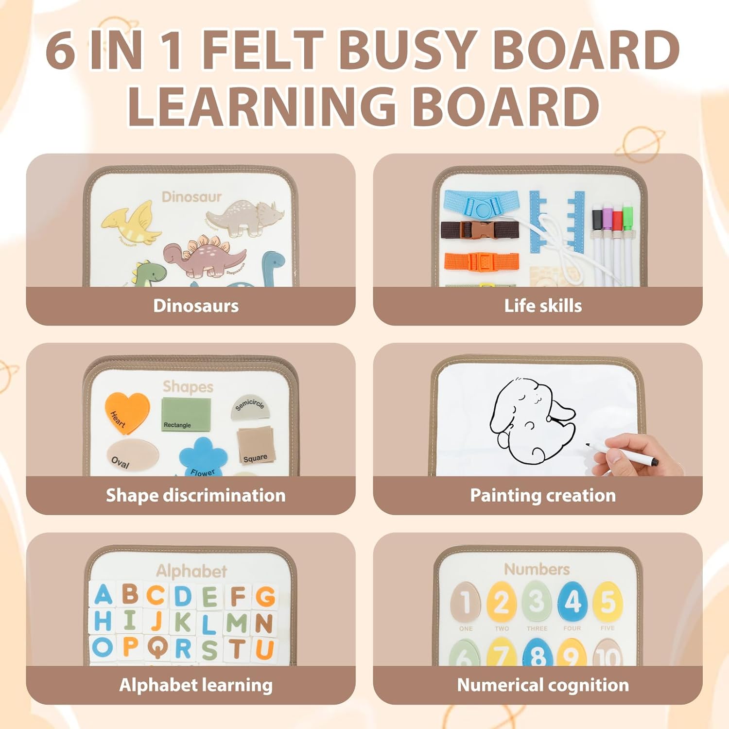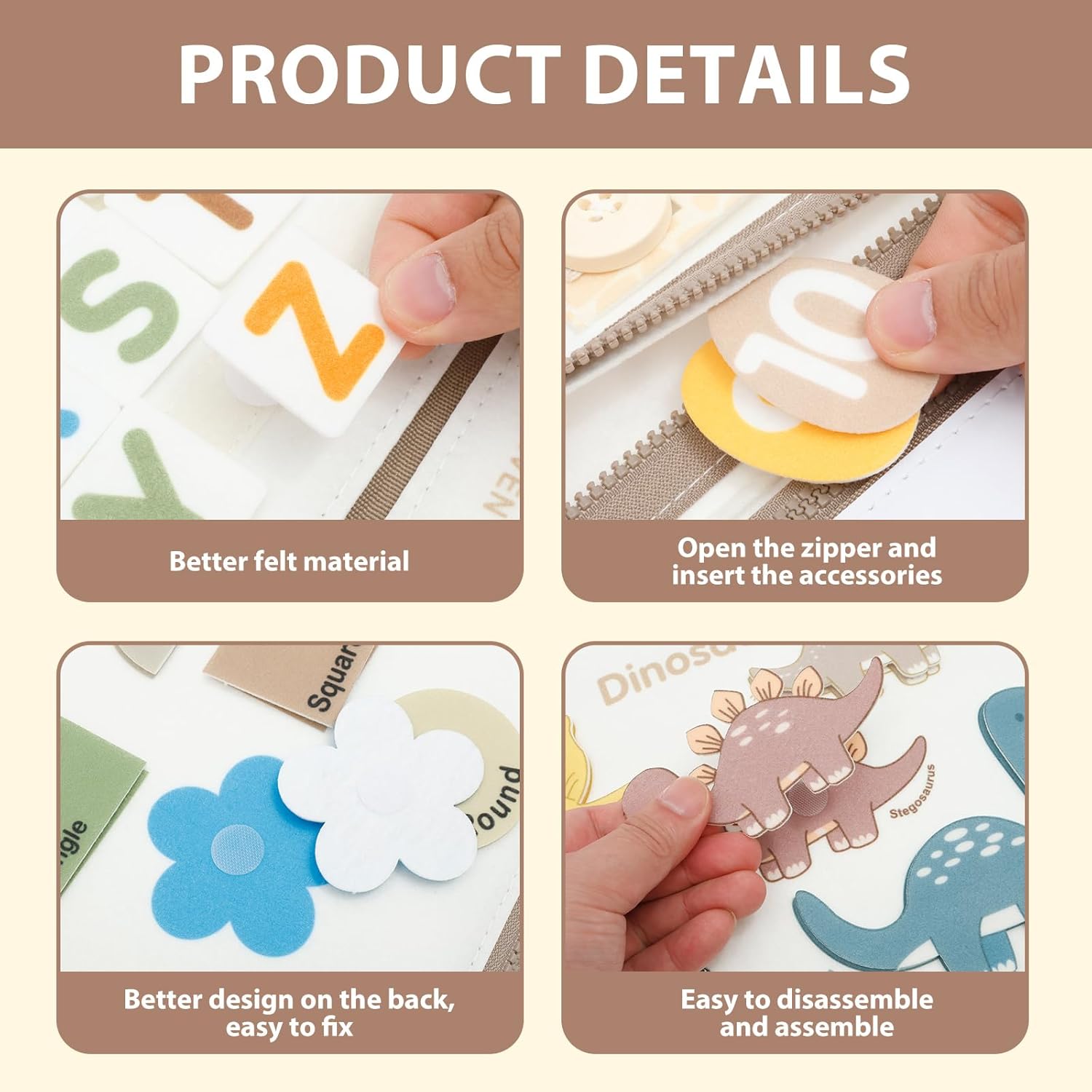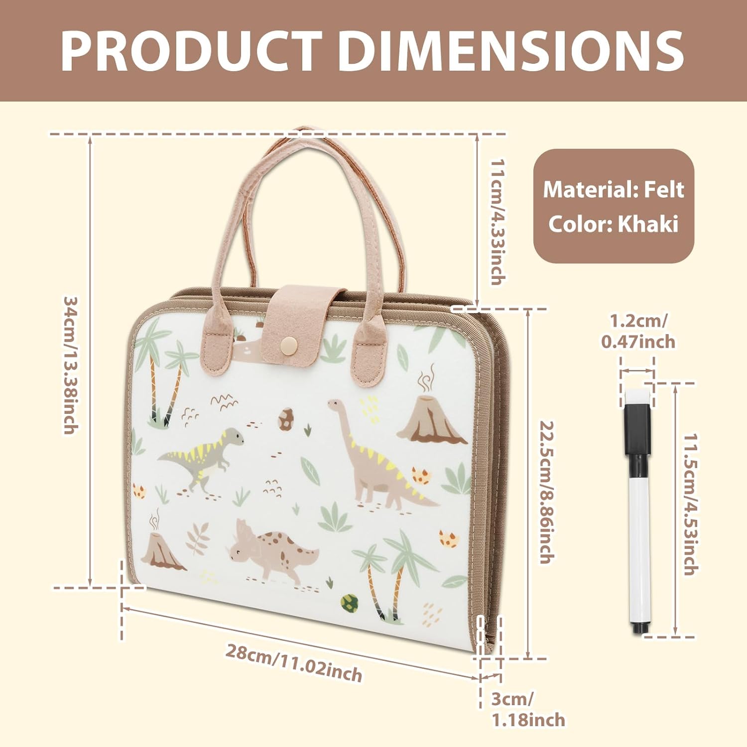 Divertimento con i dinosauri: questa lavagna educativa ha i dinosauri come tema centrale e integra sapientemente il riconoscimento dei numeri, il riconoscimento delle forme, l'apprendimento dell'alfabeto, il disegno e lo sviluppo di abilità di vita. Permette ai bambini di esplorare il mondo dei dinosauri acquisendo allo stesso tempo conoscenze multidisciplinari, che suscita il loro interesse per l'apprendimento. Design compatto e portatile: grazie alle sue dimensioni ridotte, al morbido materiale in feltro e alla maniglia per il trasporto, si adatta facilmente a uno zaino o in una borsa fasciatoio. È adatto per l'uso quotidiano della famiglia, gite all'aperto e lunghi viaggi e offre ai bambini un intrattenimento di apprendimento senza schermo in qualsiasi momento. I blocchi da disegno riutilizzabili stimolano la creatività: la lavagna educativa per bambini viene fornita con un set di pennarelli a 4 colori e un tavolo da disegno riutilizzabile. Questo soddisfa il bisogno dei bambini di un'espressione creativa illimitata e consente loro di disegnare e cancellare liberamente. Tasca con cerniera per una comoda organizzazione: in una pratica tasca con cerniera, i bambini possono conservare tutti i componenti, compresi pennarelli e accessori per dinosauri, senza preoccuparsi di perdere piccoli oggetti. Imparare le abilità di vita: include attività pratiche come legare scarpe, ganci per cintura, bottoni e chiusure lampo. Mentre i bambini si esercitano, sviluppano abilità di vita come il serraggio indipendente, migliorano le capacità motorie e la coordinazione occhio-mano.