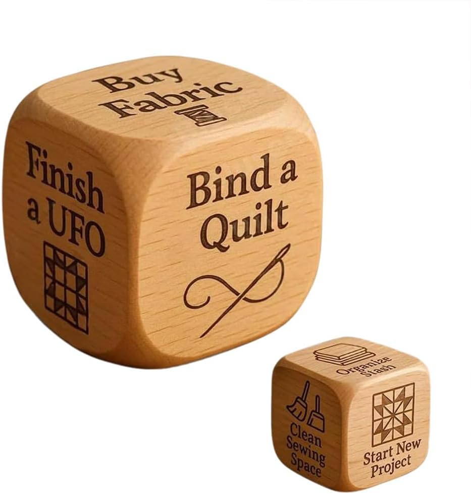 Articoli unici: 6 progetti di cucito con motivi, idea regalo 2025, dadi , progetti come "Organizza la tua collezione", "" o "Inizia un nuovo progetto": libera la creatività nel tuo lavoro quotidiano Legno lavorato a mano: realizzato in legno robusto con bordi lisci e incisione nitida per un utilizzo duraturo su qualsiasi tavolo da cucito Motivazione per il quilting creativo: aggiungi divertimento e spontaneità al tuo percorso di cucito. Tira i dadi per decidere il tuo prossimo progetto di quilting e rimani produttivo senza sforzo Il regalo perfetto per i quilter: un regalo premuroso e giocoso per quilter, sarti o appassionati di cucito, per compleanni, festività e ritiri di cucito Per Unico spunto di conversazione: per gruppi di quilting e cucito. Scatena la risata, accende la creatività e rende qualsiasi attività creativa più coinvolgente