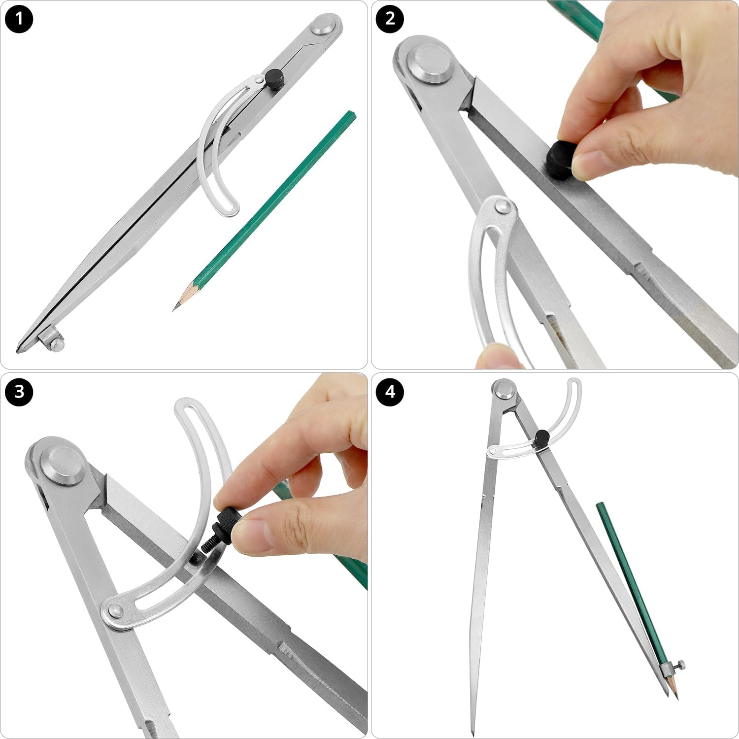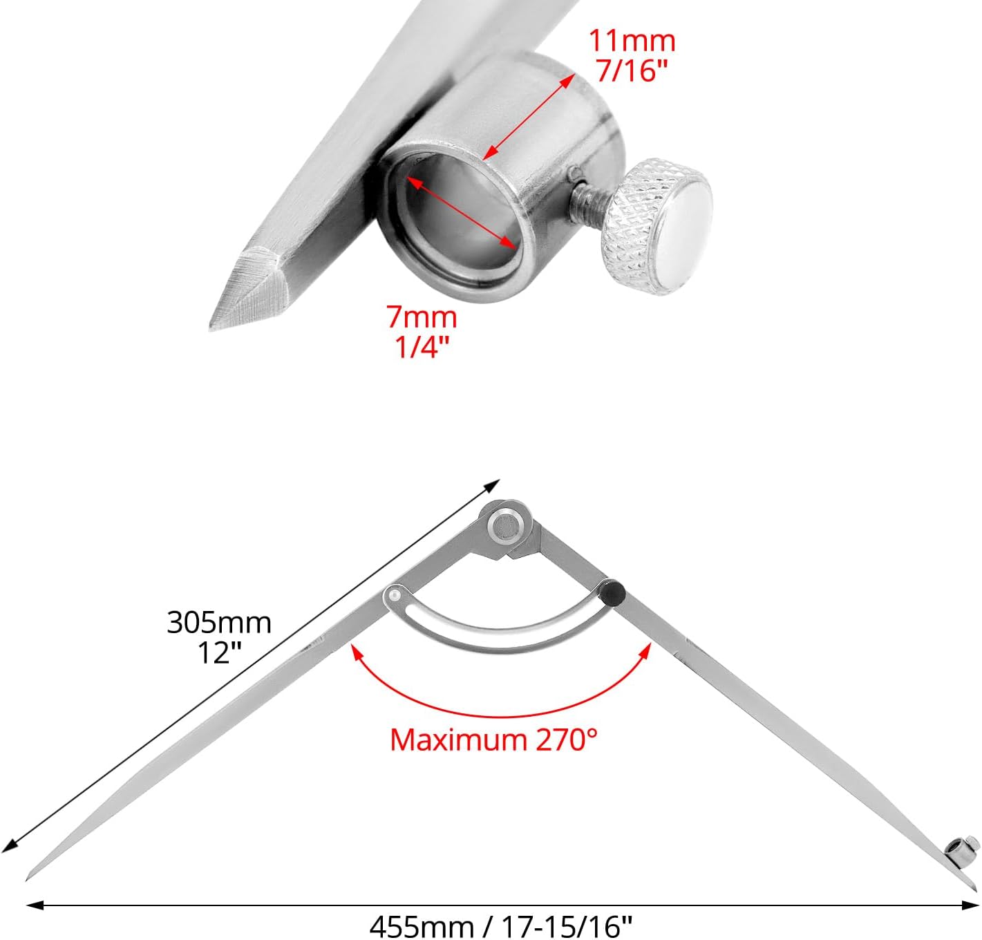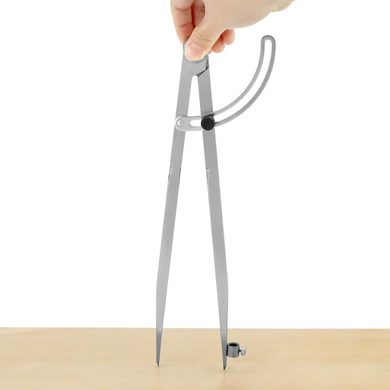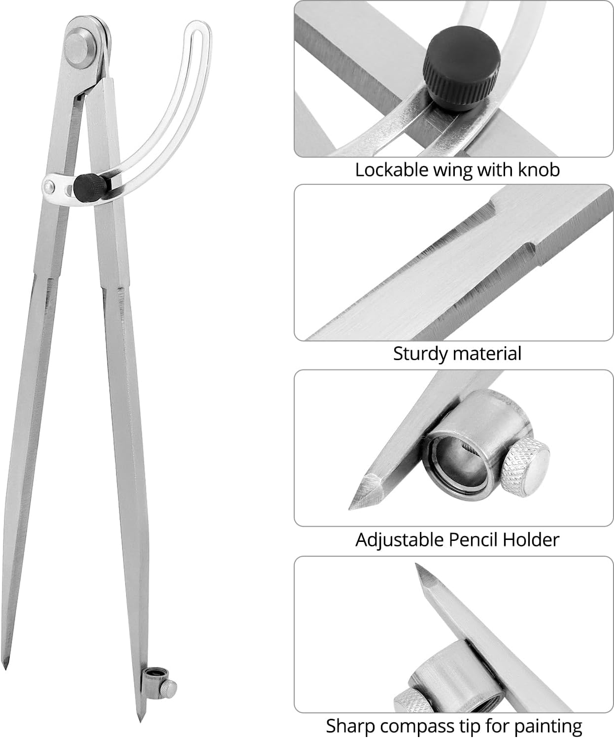 Materiale: realizzato in acciaio al carbonio, che ne garantisce la durata e la resistenza alla deformazione, consentendogli di resistere a una maggiore pressione durante l'uso e garantire precisione e stabilità a lungo termine. Dimensioni: 12 pollici di lunghezza possono soddisfare la maggior parte delle esigenze di disegno. Questo prodotto è ideale se devi disegnare cerchi di grande diametro. Design: il design a forma di ala aumenta la stabilità durante la presa e può posizionare una matita con un diametro di 8 mm sulla bussola. Distanza regolabile: gli utenti possono regolare la distanza tra le due gambe della bussola secondo necessità per soddisfare le diverse esigenze di disegno. Questa flessibilità rende il disegno più efficiente. Viti di fissaggio: dotato di viti di fissaggio, l'angolo regolato può essere fissato saldamente per evitare spostamenti o modifiche durante l'uso, garantendo la precisione e la stabilità del disegno, soprattutto quando si disegnano modelli complessi.
