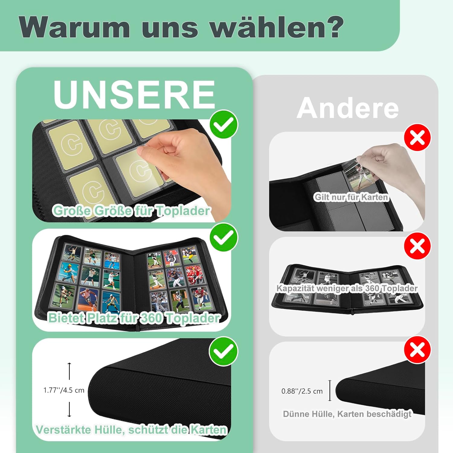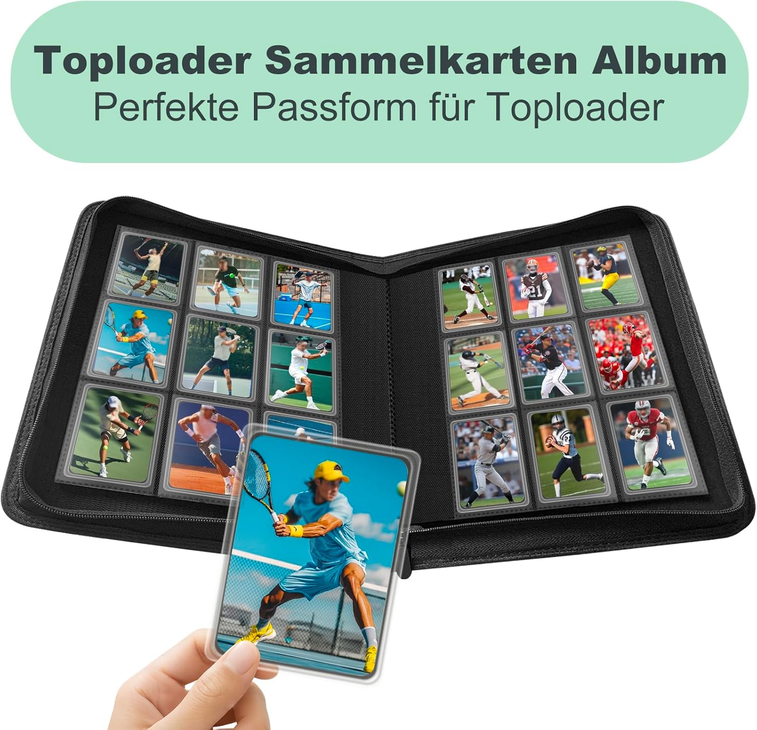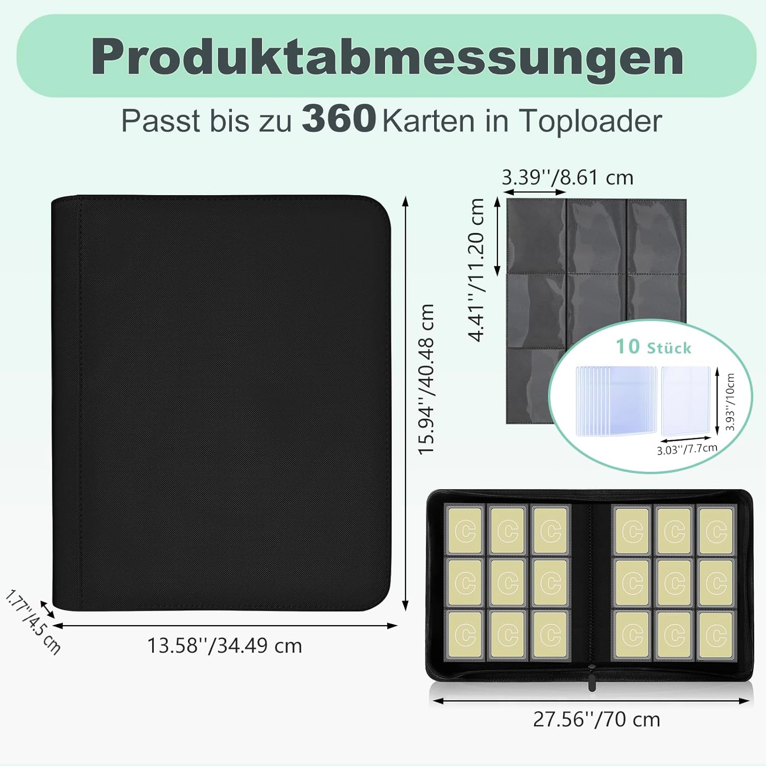 Album di carte collezionabili con caricamento dall'alto e 360 di grande capacità: questo album di carte collezionabili di grandi dimensioni da nove pagine ha 20 pagine e può contenere 360 carte dall'alto in formato 3 x 4 pollici. Offre molto spazio per le tue carte collezionabili o per la collezione di carte sportive in edizione limitata. Alta qualità: il guscio in PU impermeabile con cerniera impedisce la caduta del porta carte e protegge da acqua e polvere. Le pagine interne trasparenti senza PVC del raccoglitore con caricamento dall'alto prevengono lo sbiadimento e consentono di ordinare le carte per serie e tipo. Compatibile con una varietà di carte: il raccoglitore per carte collezionabili è adatto per carte rigide da 3,4 x 4 pollici per carte da gioco, carte collezionabili, carte TCG, carte sportive, carte da calcio, ecc. e soddisfa tutte le esigenze di raccolta. Inoltre, viene fornito con 10 squisiti toploader. Conservazione sicura: il raccoglitore di carte è progettato per l'inserimento laterale delle carte, in modo che possano essere facilmente rimosse e non cadano. Tra i singoli scomparti si trova uno strato tampone che impedisce alle carte di graffiarsi e deformarsi. REGALO IDEALE: questo album da collezione di carte combina design alla moda e funzionalità. Non è solo la scelta ideale per i collezionisti di cartoline, ma anche un ottimo regalo per ragazzi e ragazze che amano collezionare cartoline per compleanni o Natale.