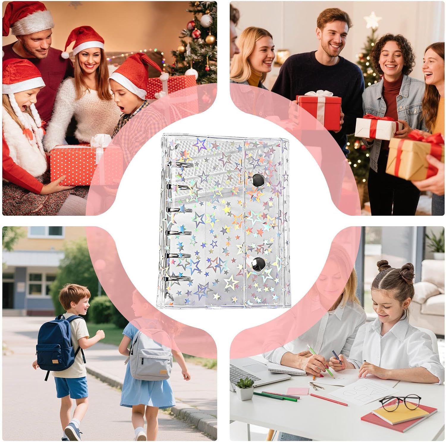 Gestione Ordinata: Offre soluzioni pratiche per organizzare adesivi, carte e oggetti da collezione con spazi dedicati e liberi da ingombri. Garantisce integrazione nelle routine quotidiane mantenendo l'ordine grazie al design funzionale del raccoglitore trasparente. Regalo Festivo: Esprimi il tuo affetto con raccoglitori trasparenti regalati a bambini e ragazzi per compleanni, occasioni festive, Natale o fine anno, creando ricordi positivi attraverso un oggetto utile nella vita quotidiana dei giovani studenti Trasporto Quotidiano Senza Sforzo: Profilo sottile e costruzione portatile permettono comodo riporlo in borse o tasche, scelta ideale per chi cerca funzionalità e facilità di trasporto nella vita di ogni giorno Effetto Luce Accattivante: Design trasparente con decorazioni a stelle crea un bagliore luminoso sotto la luce, migliora la visibilità di adesivi e carte all'interno aggiungendo un tocco artistico a collezioni ed esposizioni Design Adattabile: Fornitura di un meccanismo ad anelli a apertura agevole per diverse necessità di archiviazione, consente di regolare il volume secondo necessità e aggiungere/rimuovere elementi con flessibilità per maggiore comodità d'uso