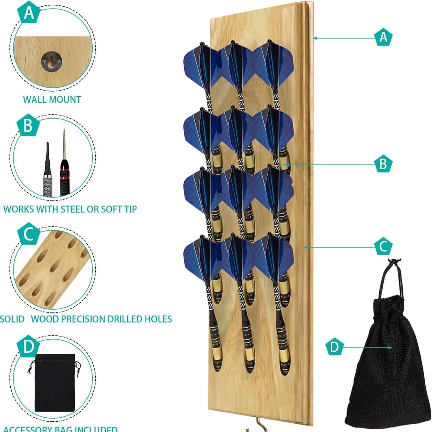 Installazione rapida: installare facilmente il supporto da parete del dardo con viti e staffe a parete. Risparmia tempo organizzando le freccette e sollevando la tua sala giochi. Configurazione sicura ed elegante in pochissimo tempo Design compatto: semplifica la configurazione del tuo gioco Dart con questo supporto da parete per freccette leggero e compatto. Progettato per ridurre al minimo la quantità di spazio utilizzato, questo supporto efficiente è facile da riporre e visualizzare Ampiamente utilizzato: mantiene tutto garantendo la sicurezza della famiglia e dei colleghi. Usalo per sale di intrattenimento per famiglie o luoghi di formazione professionale, e goditi lo stoccaggio di freccette e accessori Soluzione di archiviazione sicura: mantieni le tue freccette al sicuro con il nostro supporto da parete che dispone di 12 scomparti per evitare scivolamenti o collisioni, proteggendo la canna e la punta per uno schermo sicuro Materiale di alta qualità: il supporto da parete del dardo è realizzato con materiale in legno di alta qualità, assicurando che non sia facile da danneggiare e fornisce una buona durata