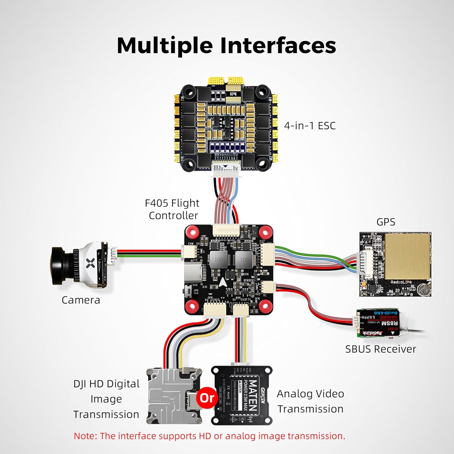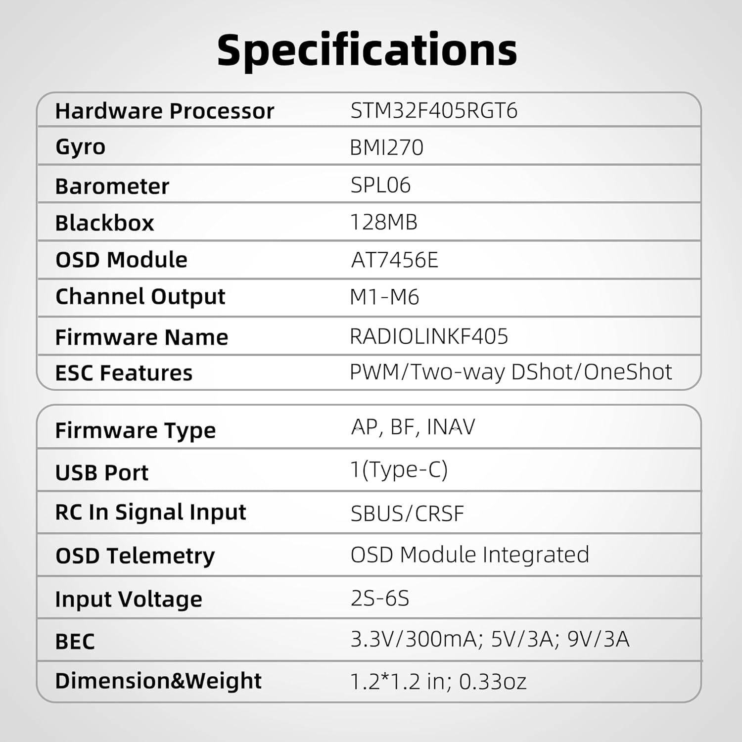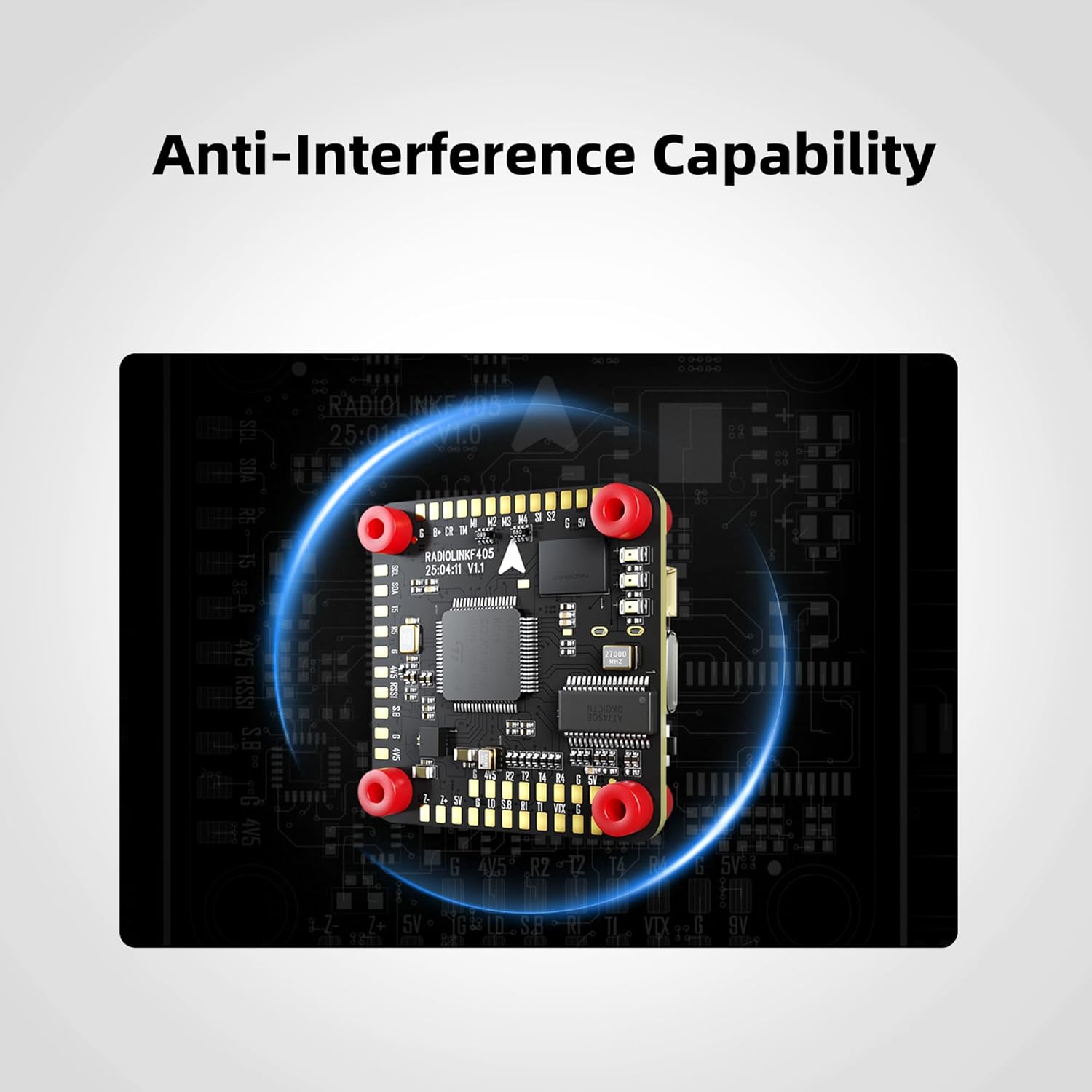 Supporta diversi firmware open source: F405, completamente compatibile con i firmware open source più diffusi di ArduPilot, Betaflight e INAV, garantisce una reattività straordinaria per gli scenari di gara e una solida stabilità per il volo autonomo. I parametri possono essere regolati tramite Radiolink e il Mission Planner open source, Betaflight e INAV Configurator, monitorando al contempo le impostazioni critiche. Parametri come tensione e assetto in tempo reale tramite l'interfaccia OSD. Capacità di archiviazione: Blackbox ad alta capacità da 128 MB, che consente una registrazione completa dei dati di volo e supporta la tracciabilità dei guasti a lungo termine. BEC multicanale integrato: Uscite da 3,3 V/300 mA, 5 V/3 A e 9 V/3 A supportano periferiche esterne, inclusi ricevitori, trasmettitori FPV, telecamere, servocomandi, strisce LED e altri tipi di dispositivi. Interfacce Plug-and-Play All-in-One: Compatibile DJI O3/O4,plug-and-play e una compatibilità perfetta con periferiche come GPS, OSD e trasmettitori video, offrendo un'espandibilità senza pari. La potenza di trasmissione video può essere attivata direttamente tramite il radiocomando, oppure parametri come la potenza e la frequenza di trasmissione possono essere regolati tramite la sinergia tra occhiali FPV e telecomando. Capacità anti-interferenza: La tecnologia PCB in rame spesso 2 once aumenta la capacità di corrente del 50% e riduce le interferenze elettromagnetiche (EMI). L'ampio filtraggio dei condensatori garantisce segnali di circuito più puliti e un funzionamento più stabile del chip. La protezione a triplo strato con perline di ferrite, diodi TVS e chip CC resistenti all'alta tensione sopprime efficacemente le sovratensioni da campi elettromagnetici inversi del motore, riducendo al minimo i rischi di burnout della scheda di controllo di volo. Compatibilità versatile: In un ingombro compatto di 30,5×30,5 mm, l'F405 supporta 6 canali di uscita ed è compatibile con un'ampia gamma di modelli, inclusi multirotori a 2-6 assi, velivoli ad ala fissa, elicotteri, ali volanti, automobili, barche, robot, tosaerba e barchette.