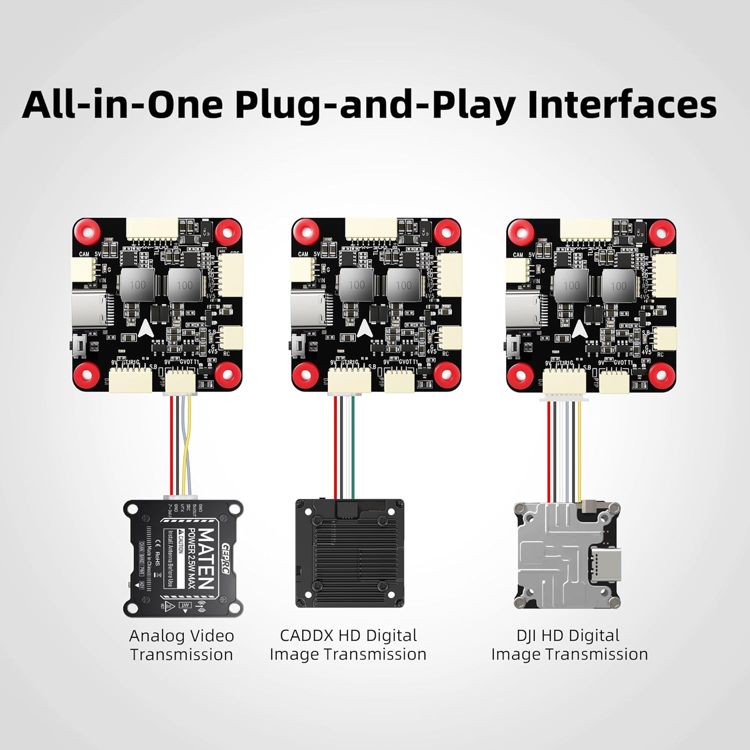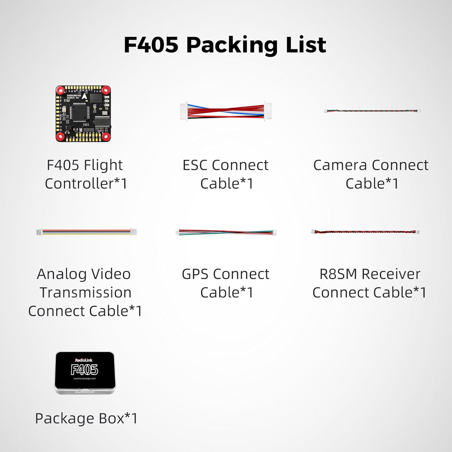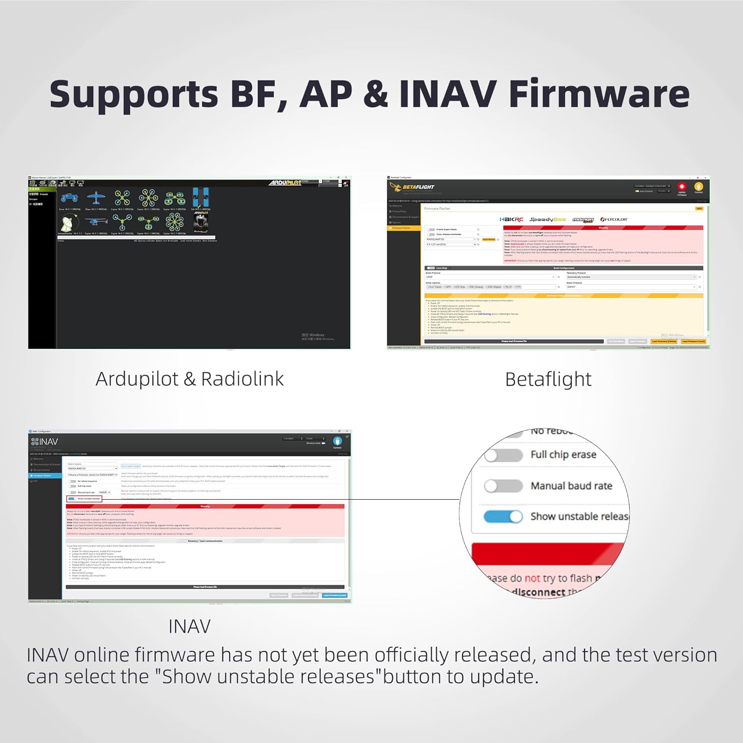 Supporta diversi firmware open source: F405, completamente compatibile con i firmware open source più diffusi di ArduPilot, Betaflight e INAV, garantisce una reattività straordinaria per gli scenari di gara e una solida stabilità per il volo autonomo. I parametri possono essere regolati tramite Radiolink e il Mission Planner open source, Betaflight e INAV Configurator, monitorando al contempo le impostazioni critiche. Parametri come tensione e assetto in tempo reale tramite l'interfaccia OSD. Capacità di archiviazione: Blackbox ad alta capacità da 128 MB, che consente una registrazione completa dei dati di volo e supporta la tracciabilità dei guasti a lungo termine. BEC multicanale integrato: Uscite da 3,3 V/300 mA, 5 V/3 A e 9 V/3 A supportano periferiche esterne, inclusi ricevitori, trasmettitori FPV, telecamere, servocomandi, strisce LED e altri tipi di dispositivi. Interfacce Plug-and-Play All-in-One: Compatibile DJI O3/O4,plug-and-play e una compatibilità perfetta con periferiche come GPS, OSD e trasmettitori video, offrendo un'espandibilità senza pari. La potenza di trasmissione video può essere attivata direttamente tramite il radiocomando, oppure parametri come la potenza e la frequenza di trasmissione possono essere regolati tramite la sinergia tra occhiali FPV e telecomando. Capacità anti-interferenza: La tecnologia PCB in rame spesso 2 once aumenta la capacità di corrente del 50% e riduce le interferenze elettromagnetiche (EMI). L'ampio filtraggio dei condensatori garantisce segnali di circuito più puliti e un funzionamento più stabile del chip. La protezione a triplo strato con perline di ferrite, diodi TVS e chip CC resistenti all'alta tensione sopprime efficacemente le sovratensioni da campi elettromagnetici inversi del motore, riducendo al minimo i rischi di burnout della scheda di controllo di volo. Compatibilità versatile: In un ingombro compatto di 30,5×30,5 mm, l'F405 supporta 6 canali di uscita ed è compatibile con un'ampia gamma di modelli, inclusi multirotori a 2-6 assi, velivoli ad ala fissa, elicotteri, ali volanti, automobili, barche, robot, tosaerba e barchette.