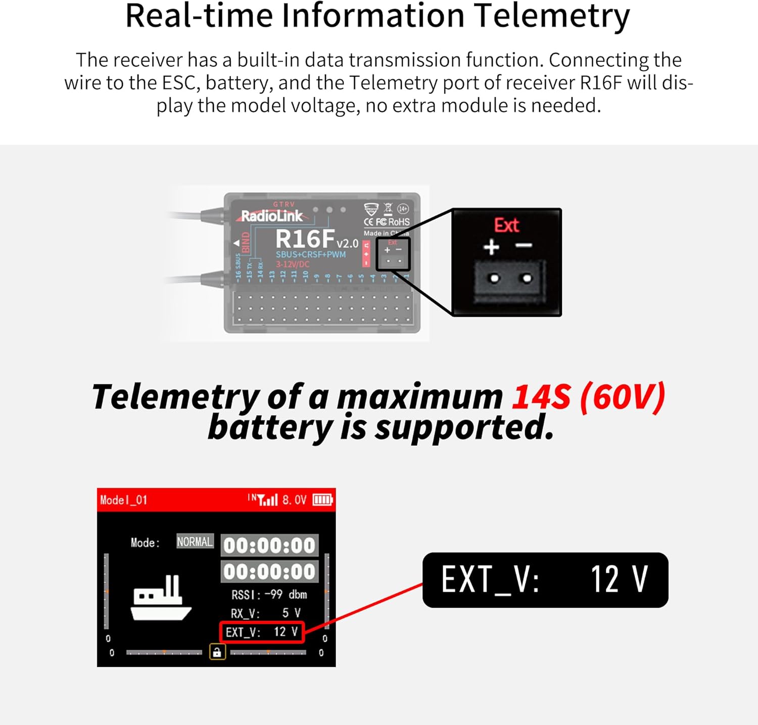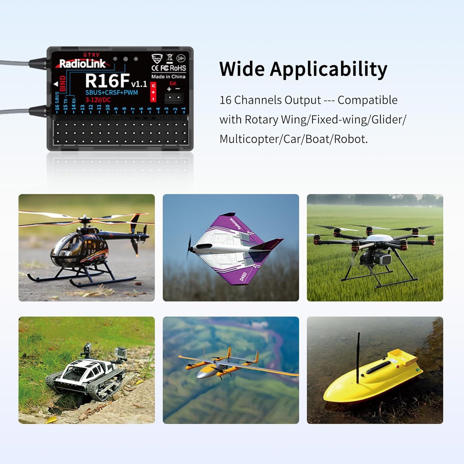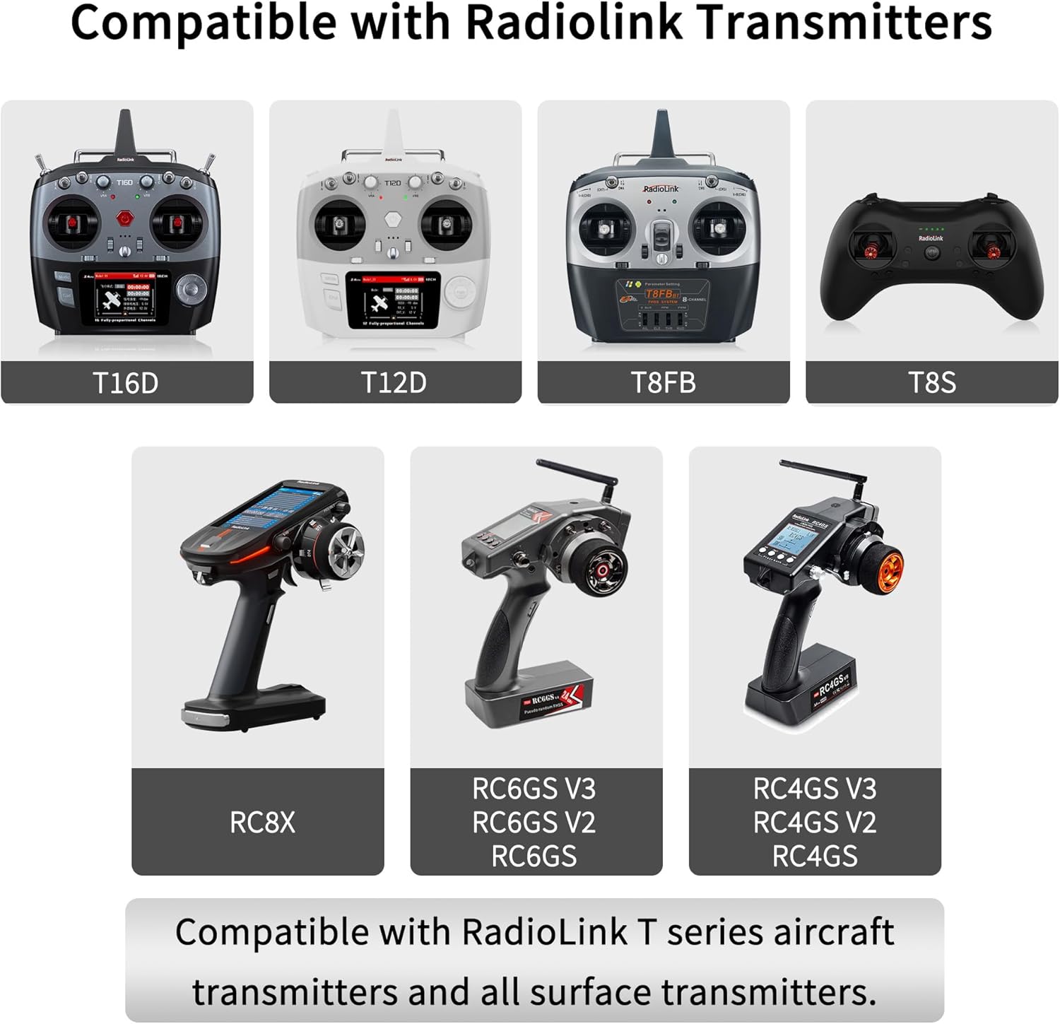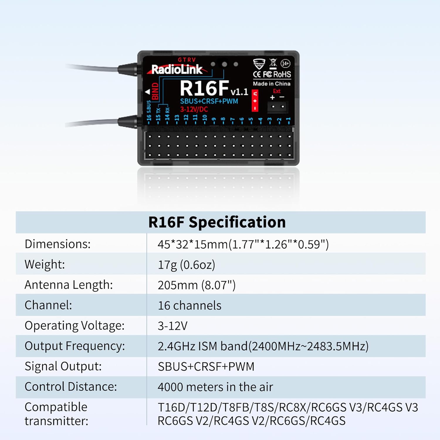 Distanza di controllo di 4000 metri: distanza di controllo offshore stabile di 600 metri e distanza di controllo aereo di 4000 metri. L'algoritmo FHSS Spread Spectrum e il salto di frequenza pseudo-casuale a 67 canali garantiscono eccellenti prestazioni anti-interferenza. Segnale PWM, SBUS e CRSF supportato: gli utenti possono personalizzare la modalità di uscita del segnale, compatibile con elicotteri, alianti, multirotori, veicoli di ingegneria, barche da corsa, robot, tosaerba, barche esca, mecha e altri modelli sul mercato. Supporto simulatore open source: può essere utilizzato con simulatori senza richiedere un dongle. È compatibile con AeroFly, Uncrashed, Liftoff, Tryp FPV, FPV LogicV, Velocidrone e altro. Per ottenere questa funzione, il firmware di R16F deve essere aggiornato alla versione V1.7. Telemetria dati in tempo reale: telemetria integrata per il monitoraggio in tempo reale della potenza del segnale, della tensione della batteria, della tensione del ricevitore e altro ancora quando funziona con i trasmettitori T12D/T16D. Protezione anti-polarità: alimentazione tramite ampia tensione, anche se le polarità vengono collegate per errore, il ricevitore non verrà danneggiato. La potenza di 3-12 V supporta servo ad alta tensione. Il ricevitore supporta l'aggiornamento online: con un cavo di tipo C (per la trasmissione dati) che collega l'R16F al computer, le ultime funzioni all'avanguardia possono essere facilmente aggiunte senza alcun dispositivo extra. Compatibile con i trasmettitori Radiolink: T12D, T16D, RC8X, RC6GS V3, RC4GS V3, RC4GS V2, RC6GS V2, T8FB, T8S. Nota: non compatibile con telecomandi non Radiolink.