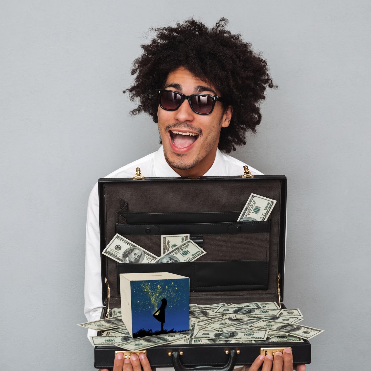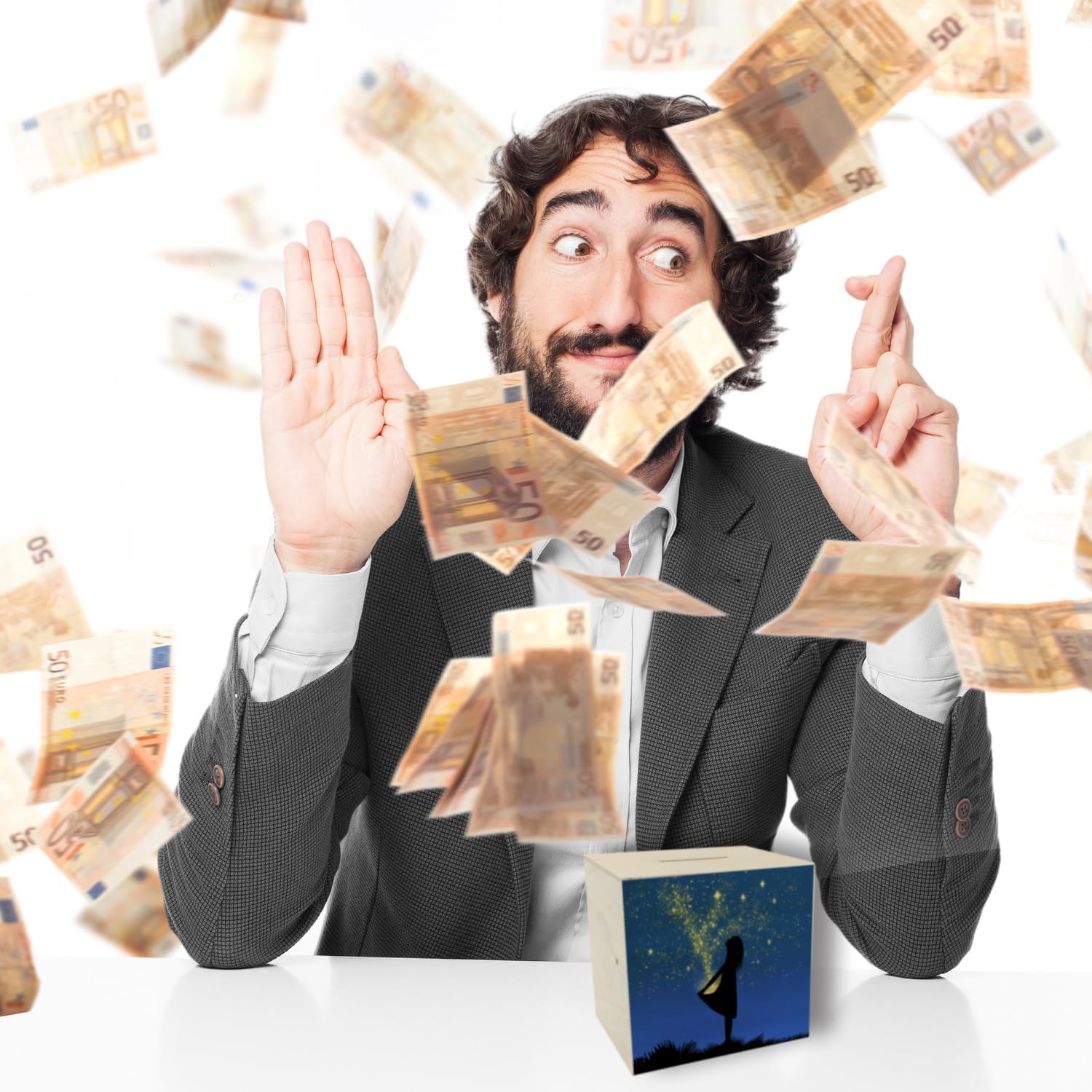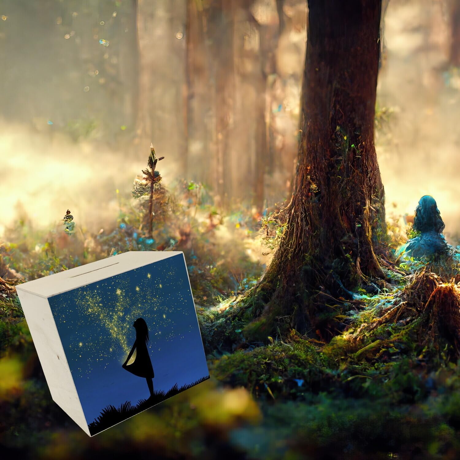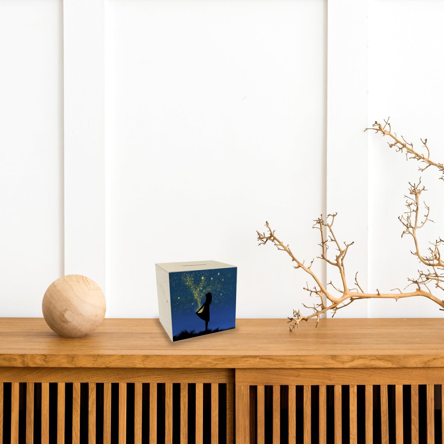 Fornitura: 1x salvadanaio ragazza con vestito a stella in legno con motivo fiabesco. Un bellissimo salvadanaio per i bambini che vogliono risparmiare la loro paghetta. Poiché il motivo ricorda la famosa fiaba Sterntaler, il salvadanaio è anche un bellissimo elemento decorativo e sta bene in ogni cameretta. Il salvadanaio mostra una ragazza davanti a un bellissimo cielo stellato. Le stelle si trasformano in monete e volano nel vestito della ragazza. Perfetto per il periodo natalizio quando il salvadanaio può essere regalato. Grazie al bellissimo motivo fiabesco il salvadanaio è particolarmente adatto ai bambini. Salvadanaio in legno di alta qualità con stampa colorata sulla parte anteriore. Con tappo in plastica per prelevare denaro sul fondo. Altezza ca. 9,8 cm, larghezza ca. 10,1 cm e profondità ca. 8 cm. Peso ca. 74 g.