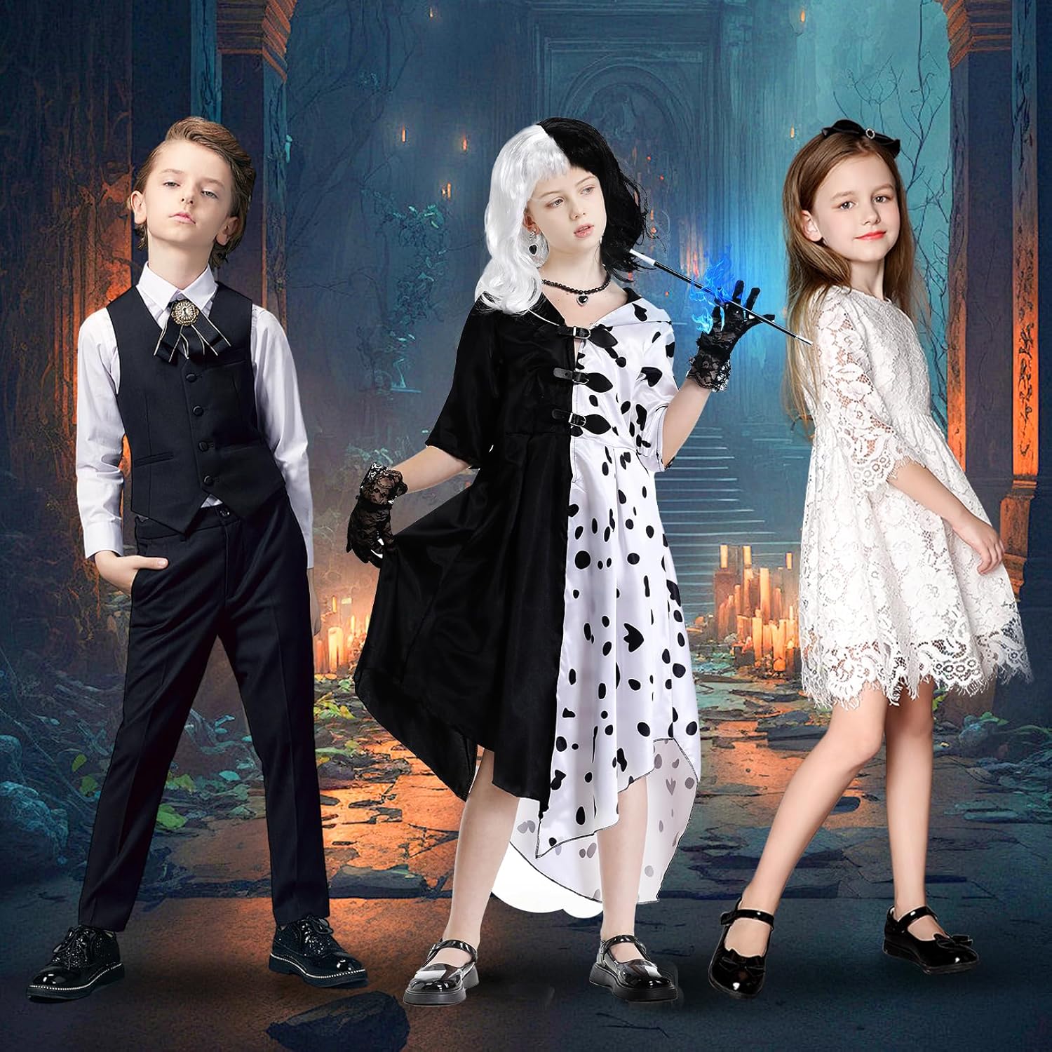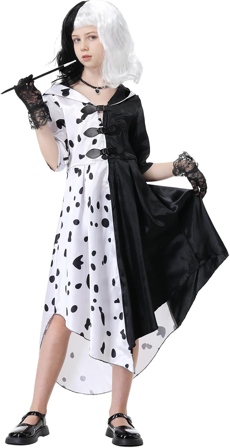 Ragazze in costume da diavolo Crudelia, ragazze in costume da Crudelia, costumi da Crudelia de vil con accessori per parrucche di Crudelia, costumi di carnevale per cosplay di carnevale, travestimenti per feste di Halloween