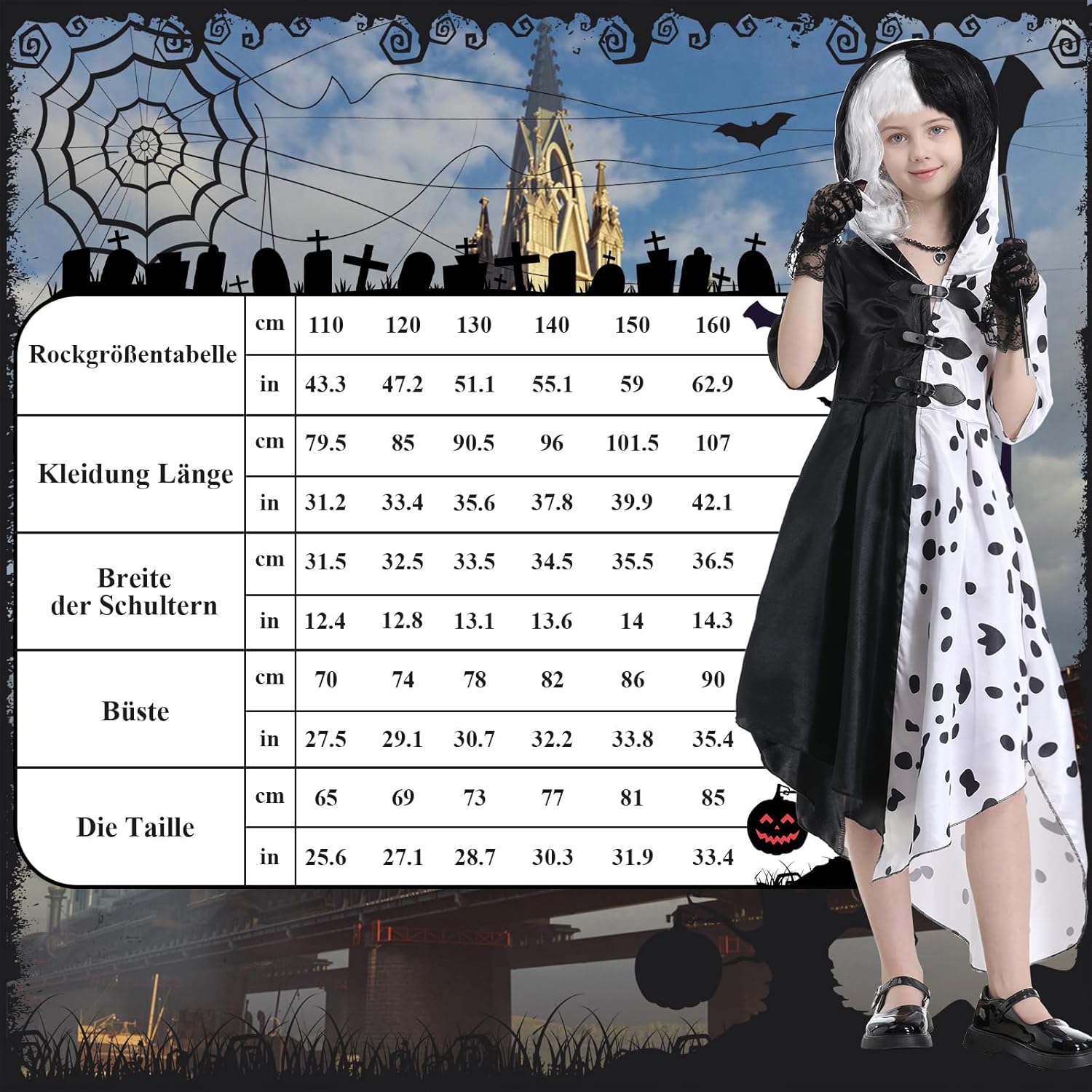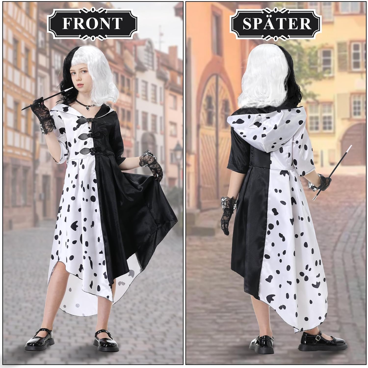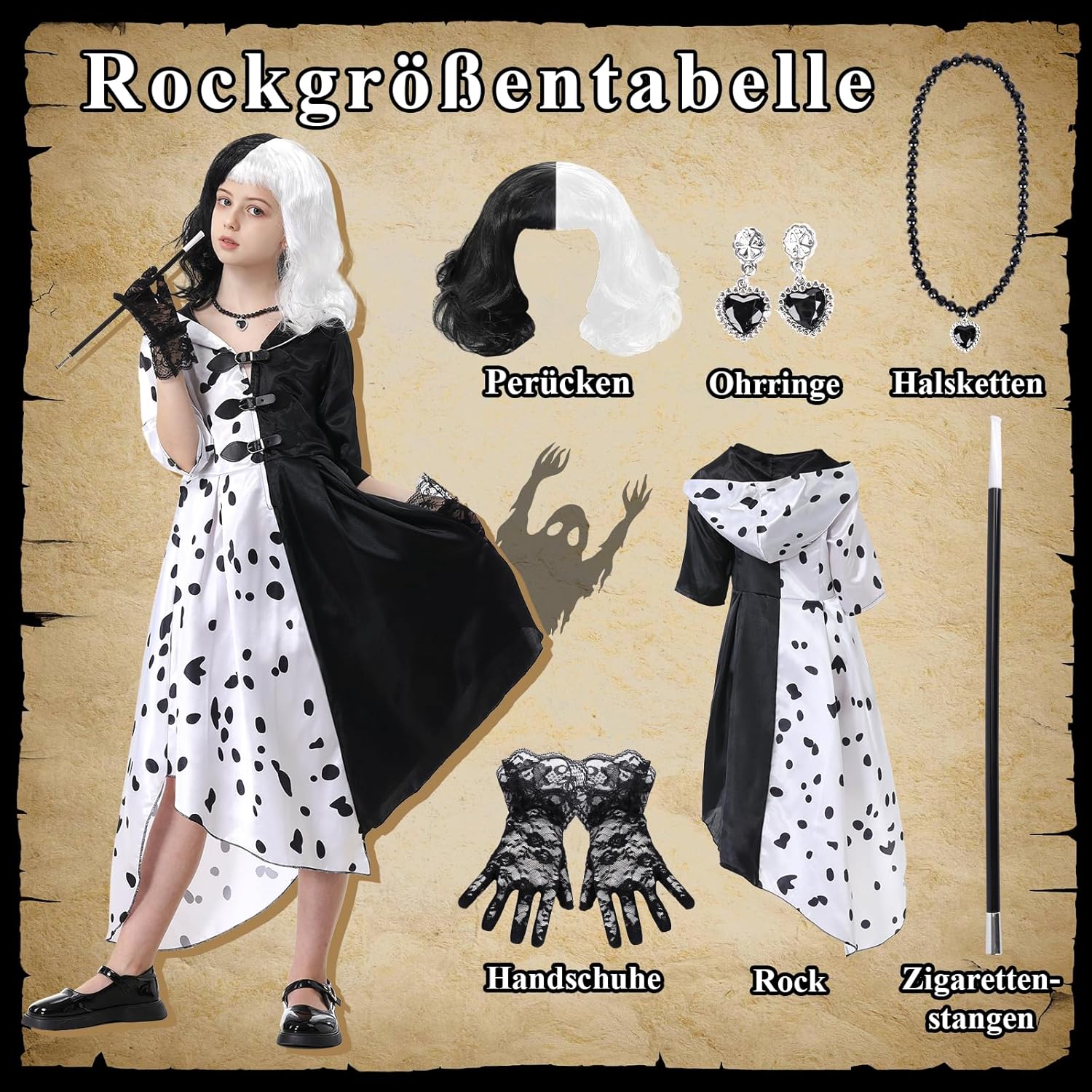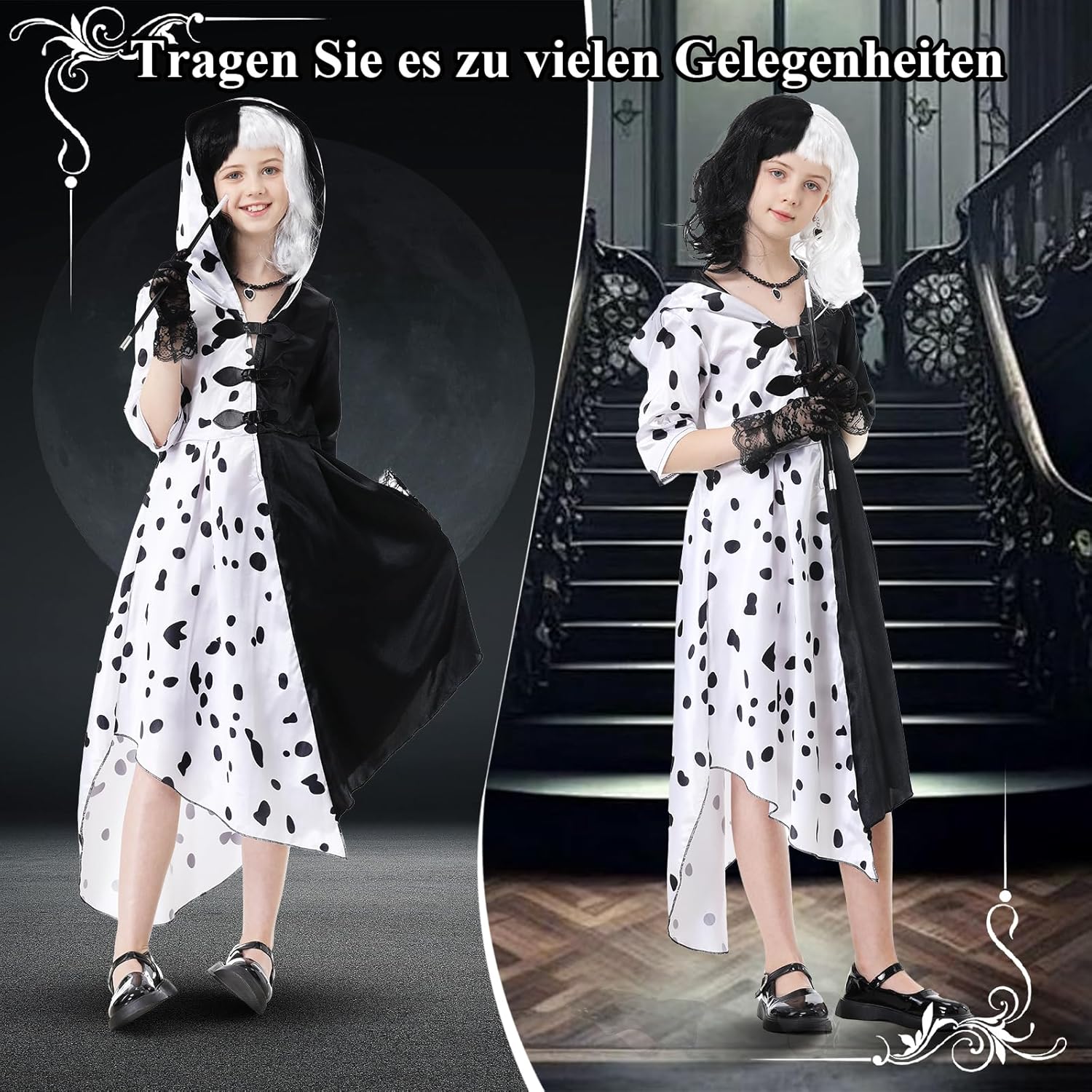 Alles zusammen ein wirklich tolles Kostüm. Meine Kleine war eine richtige Cruella an Halloween????. Die Haare lösen sich leicht bei der Perücke, aber es war nicht weiter tragisch. Ich kann es empfehlen