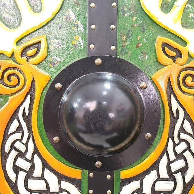 Dimensioni: circa 24 cm Finitura come da immagine Materiale: acciaio, legno, ferro Scudo vichingo: gli scudi vichinghi erano decorati con colori per mostrare al nemico la loro identità e lealtà. Gli scudi erano decorati con rune o simboli con i vichinghi che si credeva avrebbero portato loro la vittoria in battaglia Decorazione da parete unica: lo scudo porterà un tocco impressionante alla tua casa e al tuo ufficio. Attirerà immediatamente l'attenzione dei vostri ospiti. E ottimo regalo per gli amanti della guerra antica. Sarebbe una decorazione impressionante nello studio di qualsiasi appassionato di storia che ha una passione per le attrezzature medievali. Scudo costume perfetto: lo scudo sarebbe perfetto per feste rinascimentali nella tua zona, alcune risse in cortile tra amici, eventi LARP o rievocazioni storiche. Lo scudo presenta una maniglia sul retro. Il volto dello scudo presenta un motivo vichingo